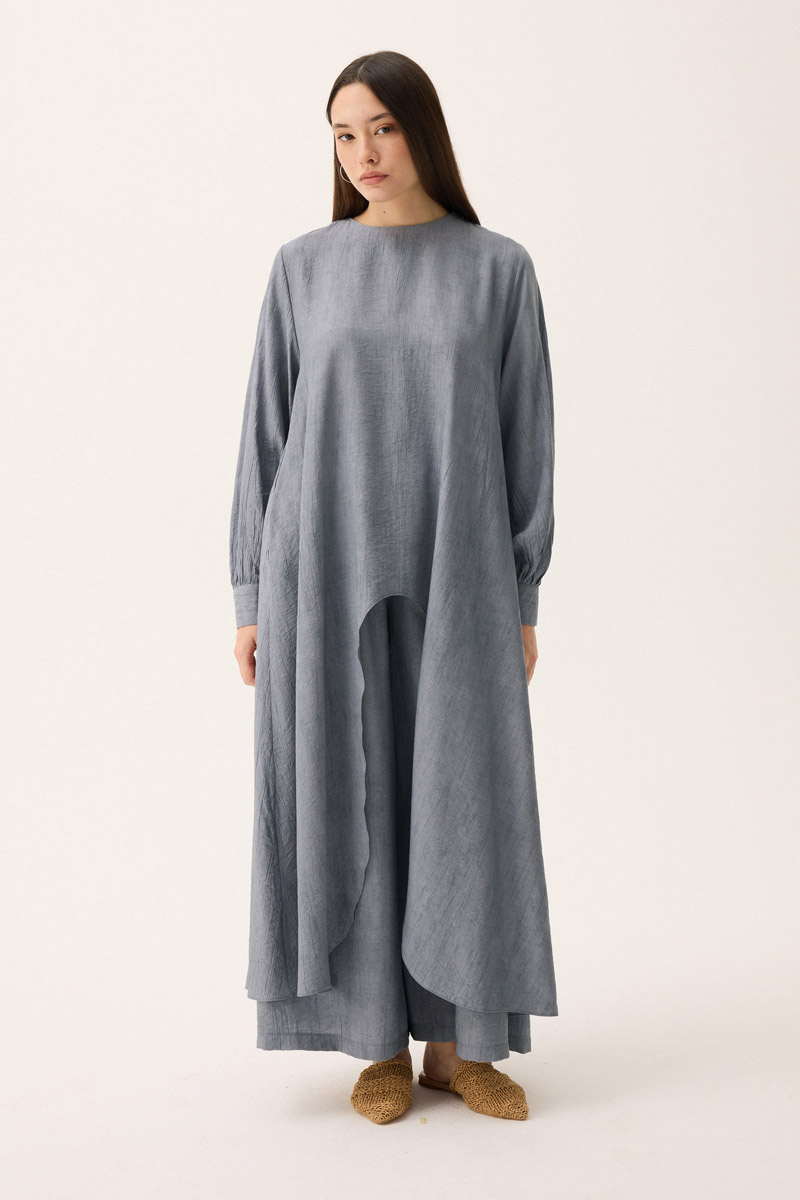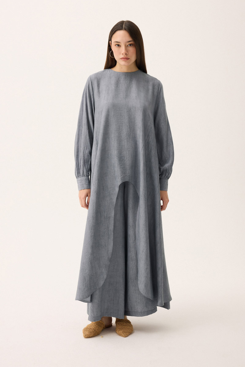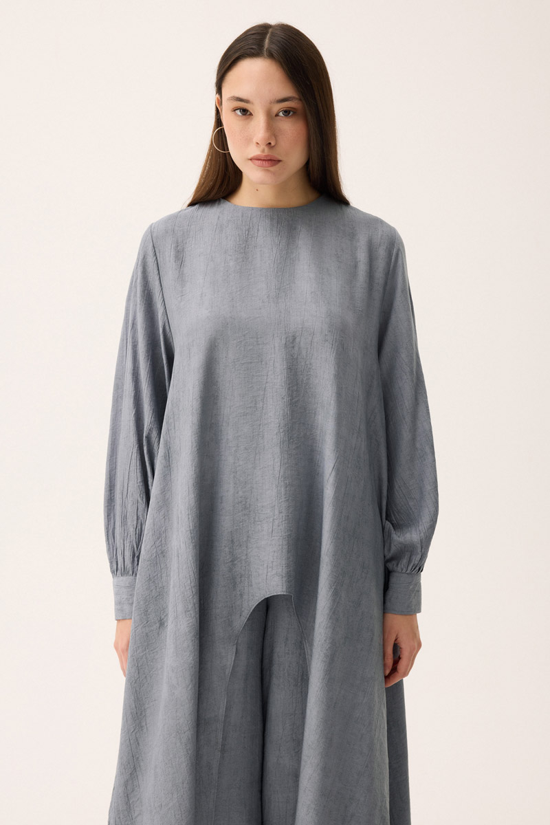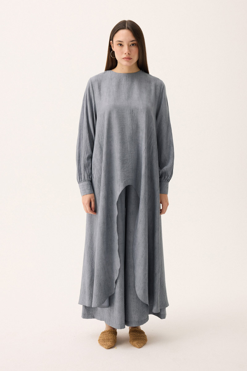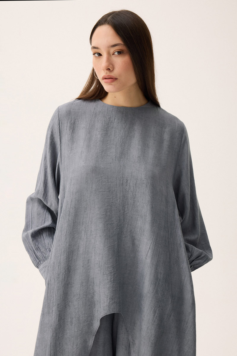 Önü Oval Kesim Takım Gri. Bisiklet yakadır, düşük kolludur, önü oval kesim detaylıdır, çilek batik desenlidir, yadan gizli ceplidir, astarsızdır. Pantolon belden lastiklidir, yandan ceplidir, bol paçadır. Günlük kullanım ve özel günlerinizde tercih edebilirsiniz.