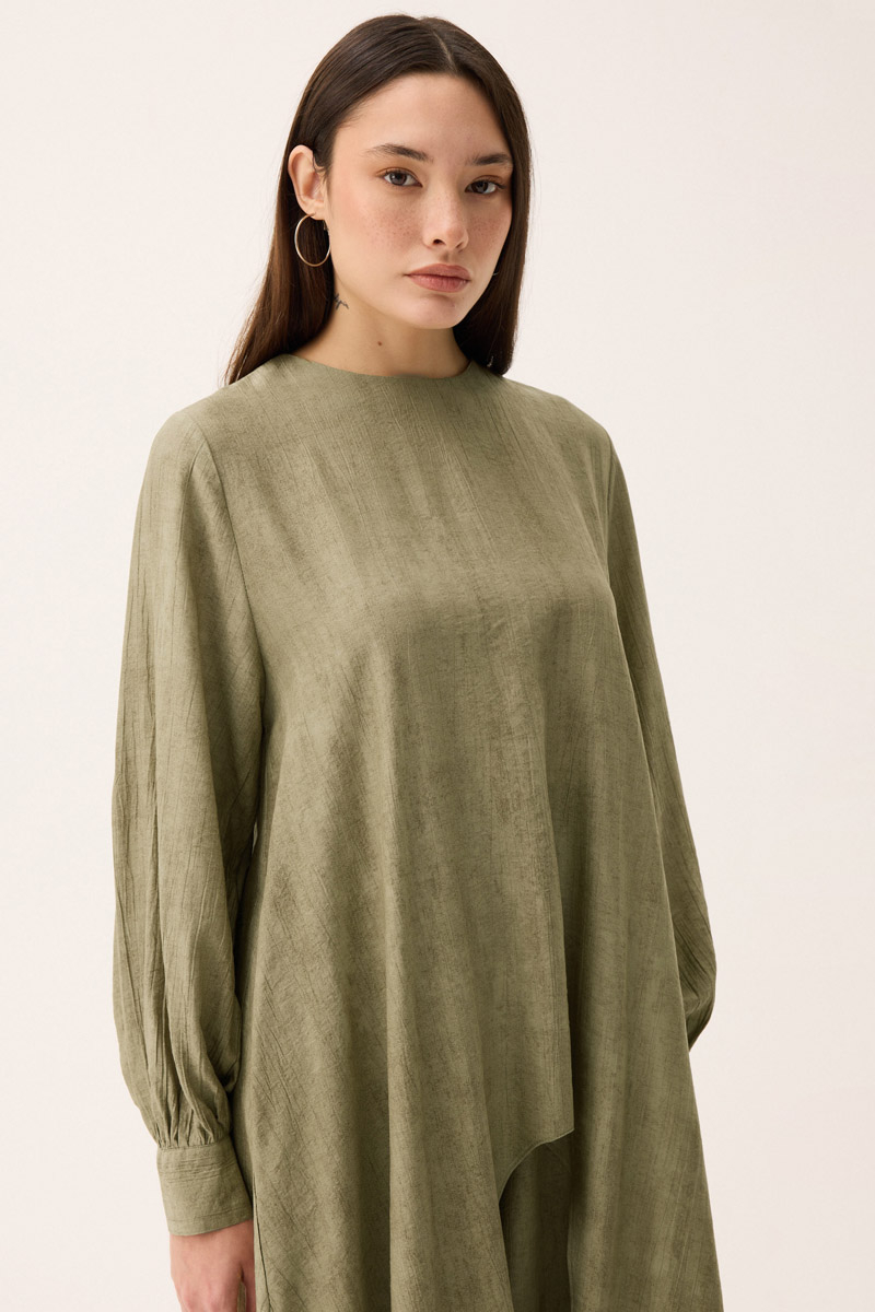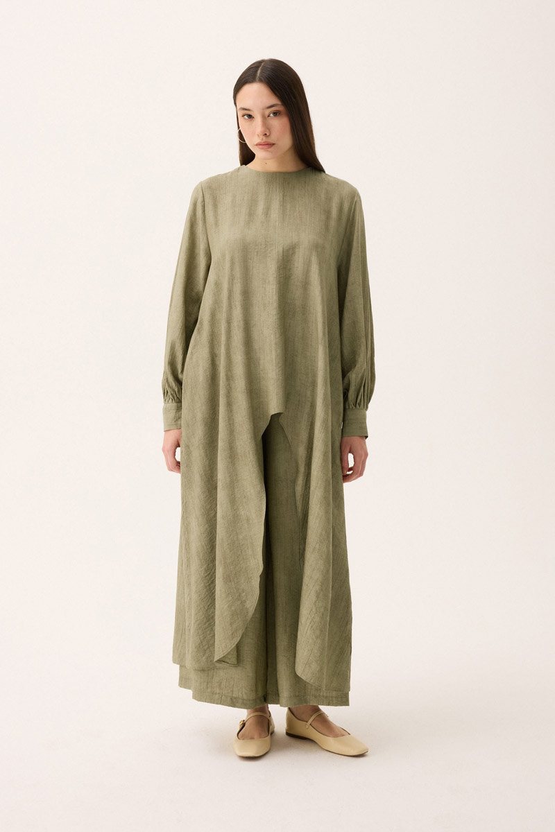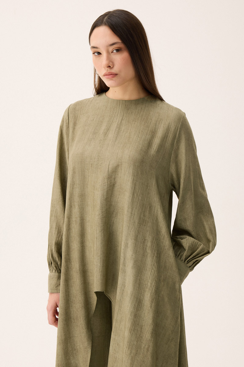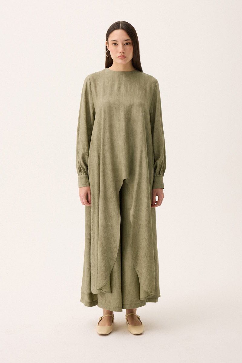 Önü Oval Kesim Takım Haki. Bisiklet yakadır, düşük kolludur, önü oval kesim detaylıdır, çilek batik desenlidir, yadan gizli ceplidir, astarsızdır. Pantolon belden lastiklidir, yandan ceplidir, bol paçadır. Günlük kullanım ve özel günlerinizde tercih edebilirsiniz.