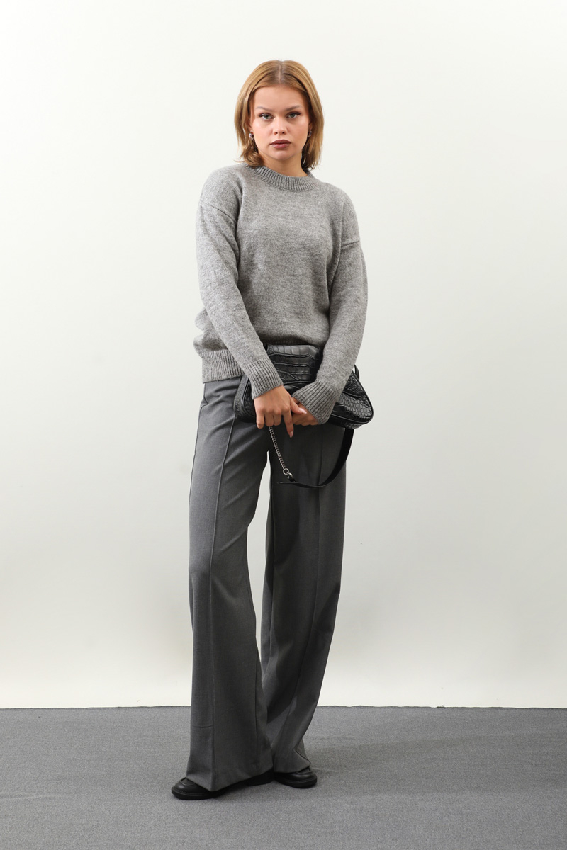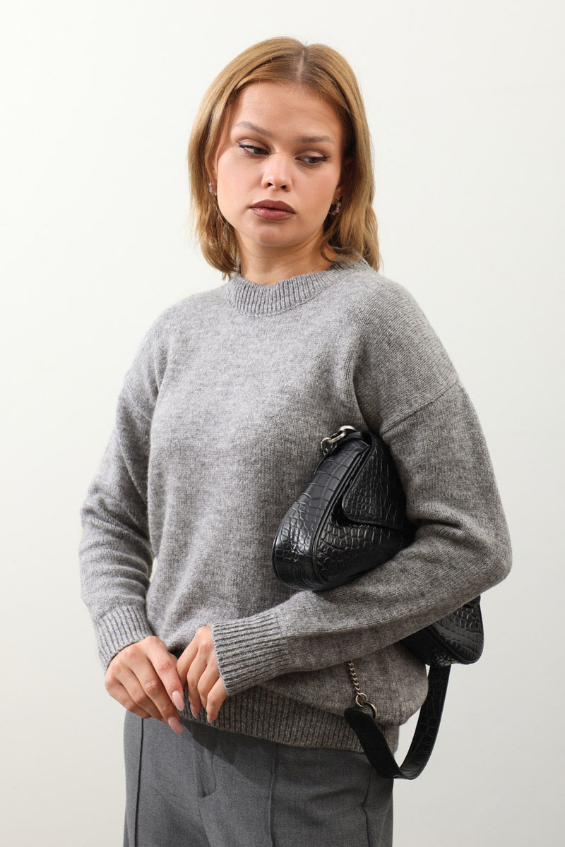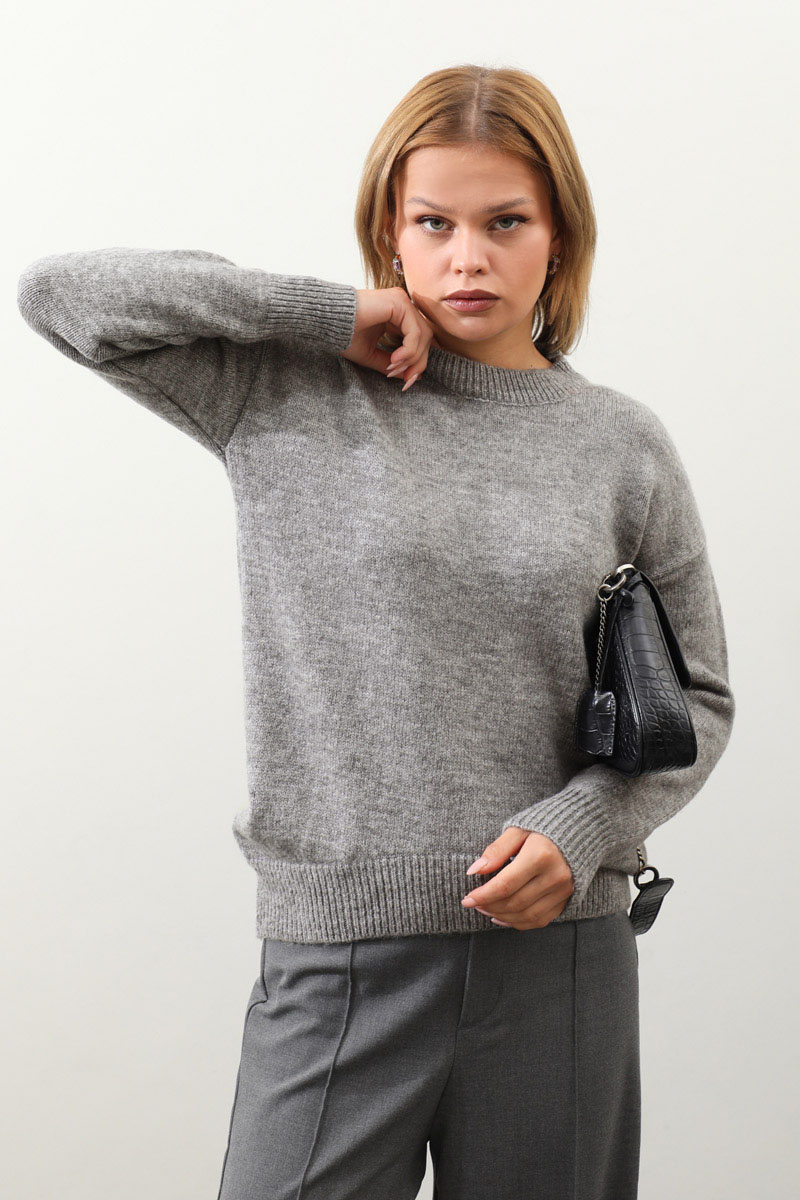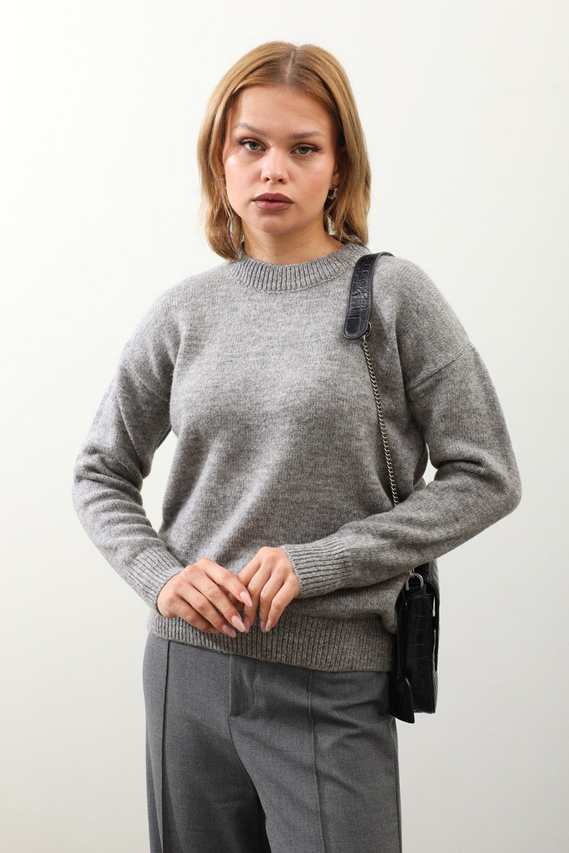Önü Oval Kısa Kazak Gri. Bisiklet yaka, düşük omuz, manşeti ve etek ucu ribanalı, önü oval gelmektedir. Günlük kullanım ve özel günlerinizde tercih edebilirsiniz.