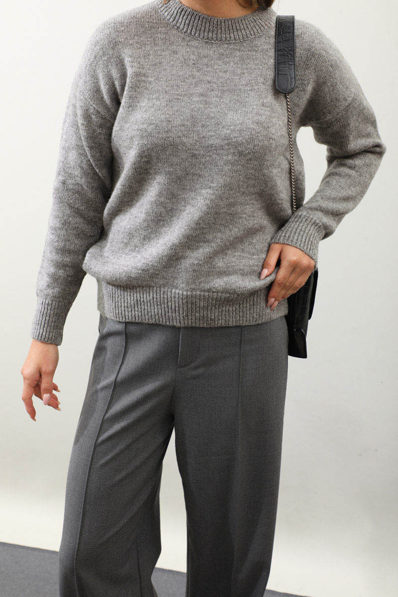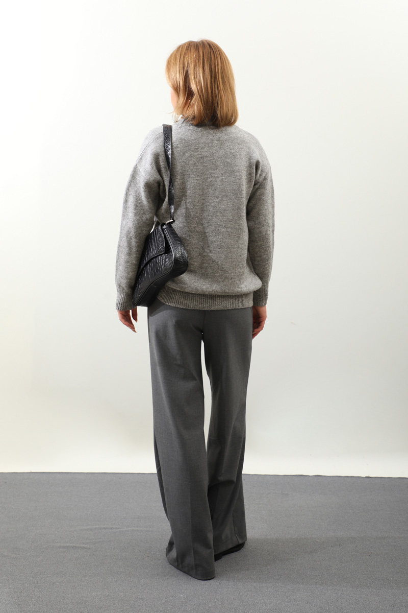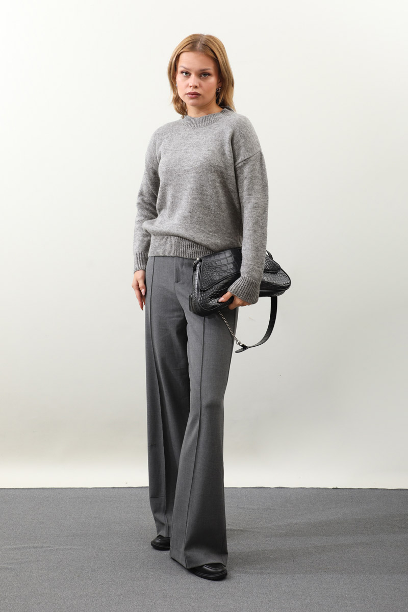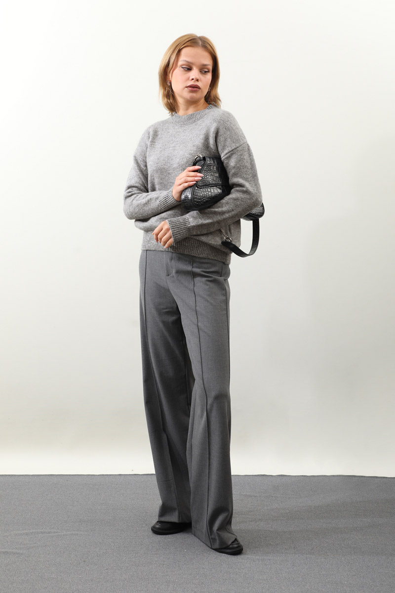 Önü Oval Kısa Kazak Gri. Bisiklet yaka, düşük omuz, manşeti ve etek ucu ribanalı, önü oval gelmektedir. Günlük kullanım ve özel günlerinizde tercih edebilirsiniz.