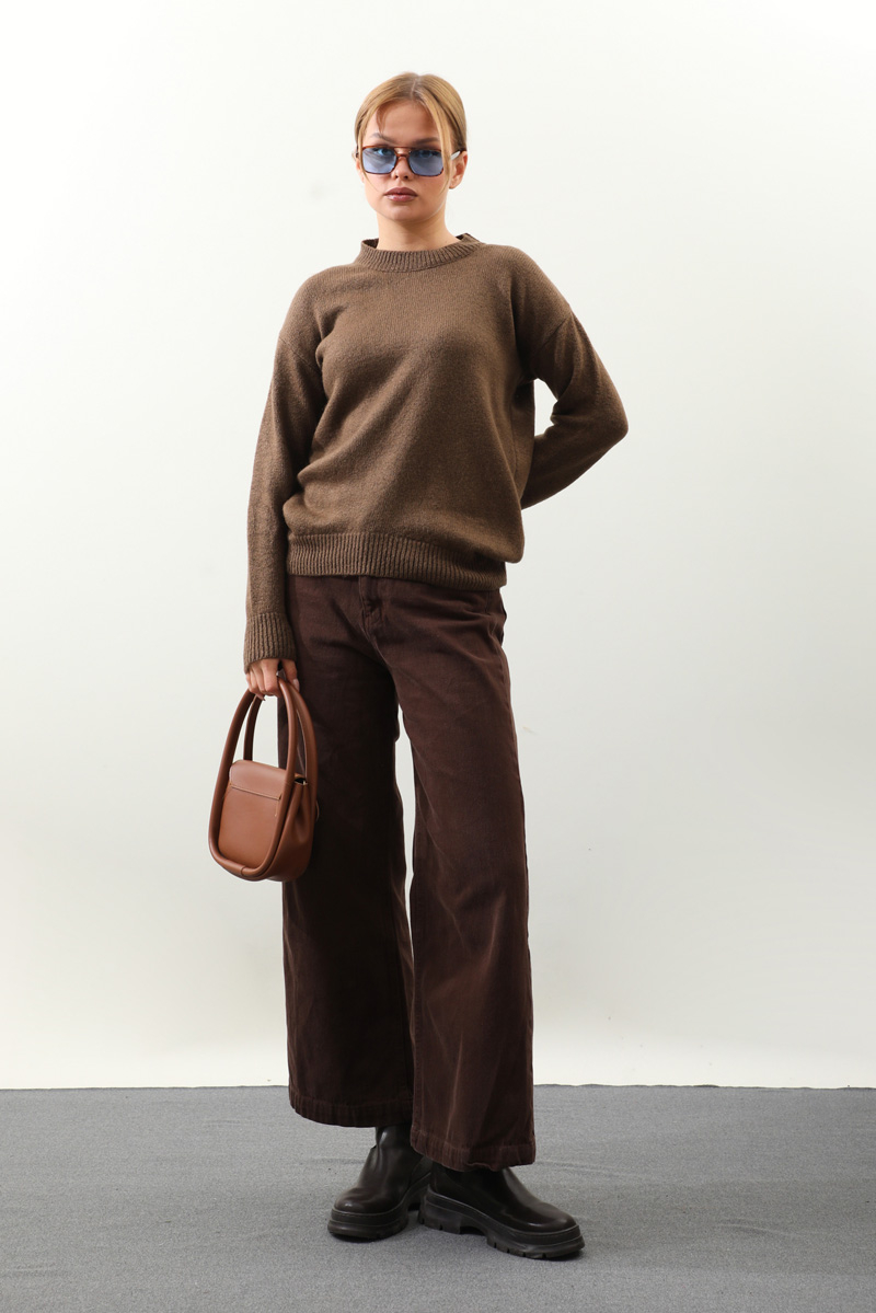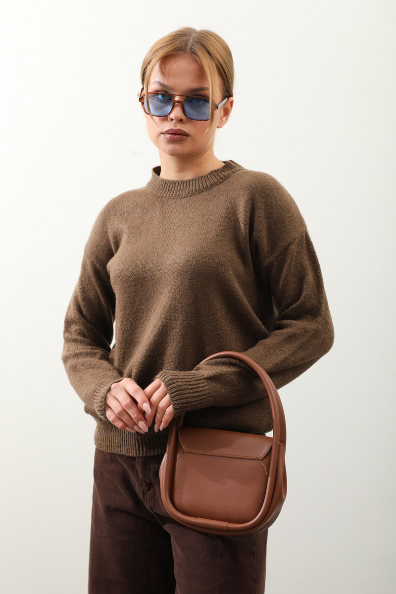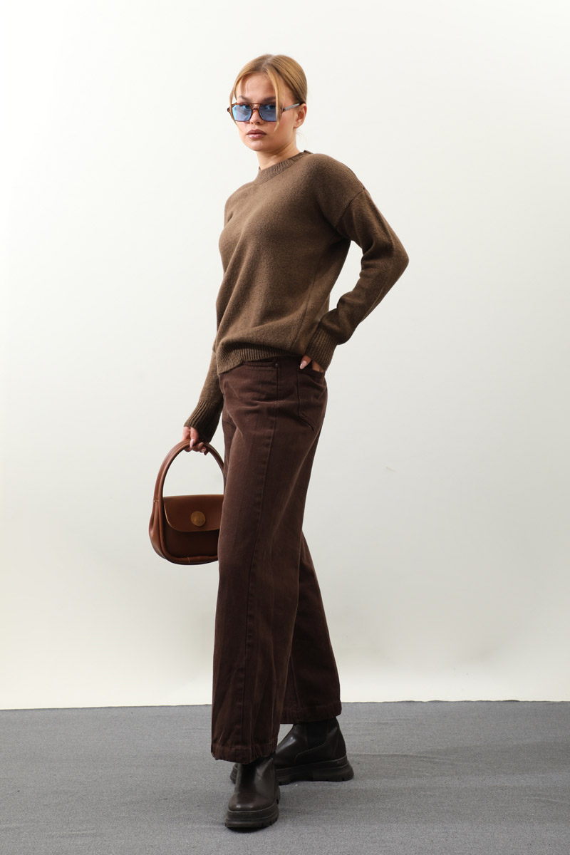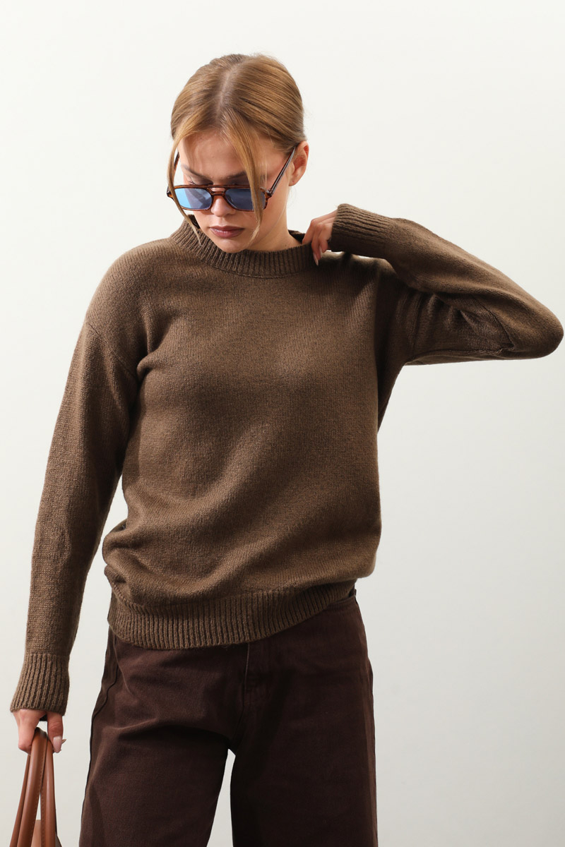 Önü Oval Kısa Kazak Kahverengi. Bisiklet yaka, düşük omuz, manşeti ve etek ucu ribanalı, önü oval gelmektedir. Günlük kullanım ve özel günlerinizde tercih edebilirsiniz.