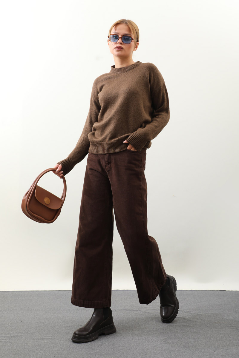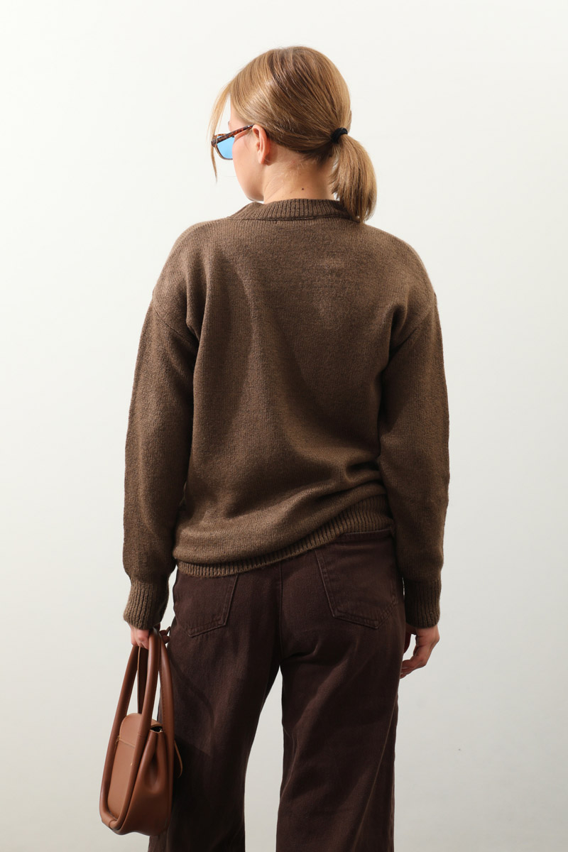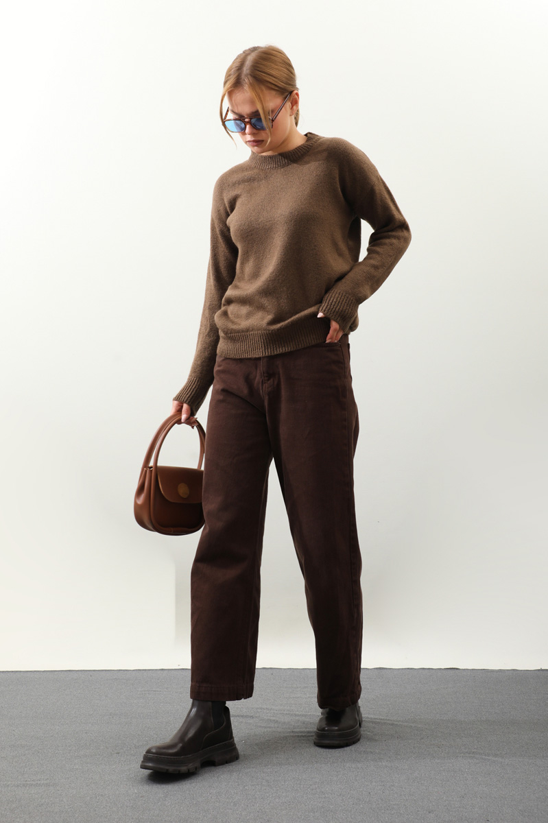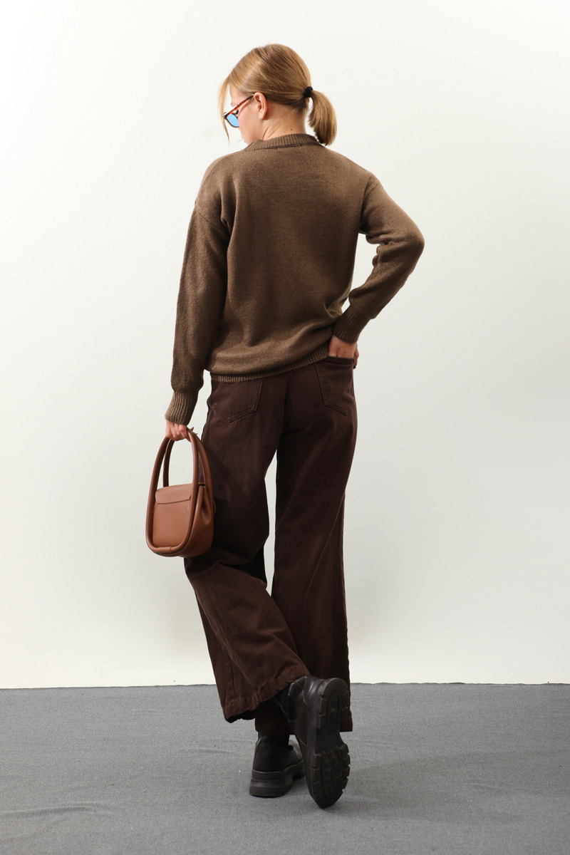 Önü Oval Kısa Kazak Kahverengi. Bisiklet yaka, düşük omuz, manşeti ve etek ucu ribanalı, önü oval gelmektedir. Günlük kullanım ve özel günlerinizde tercih edebilirsiniz.