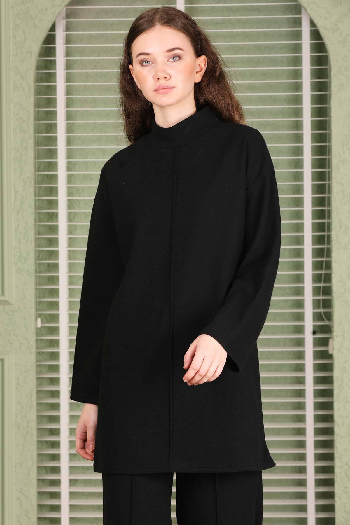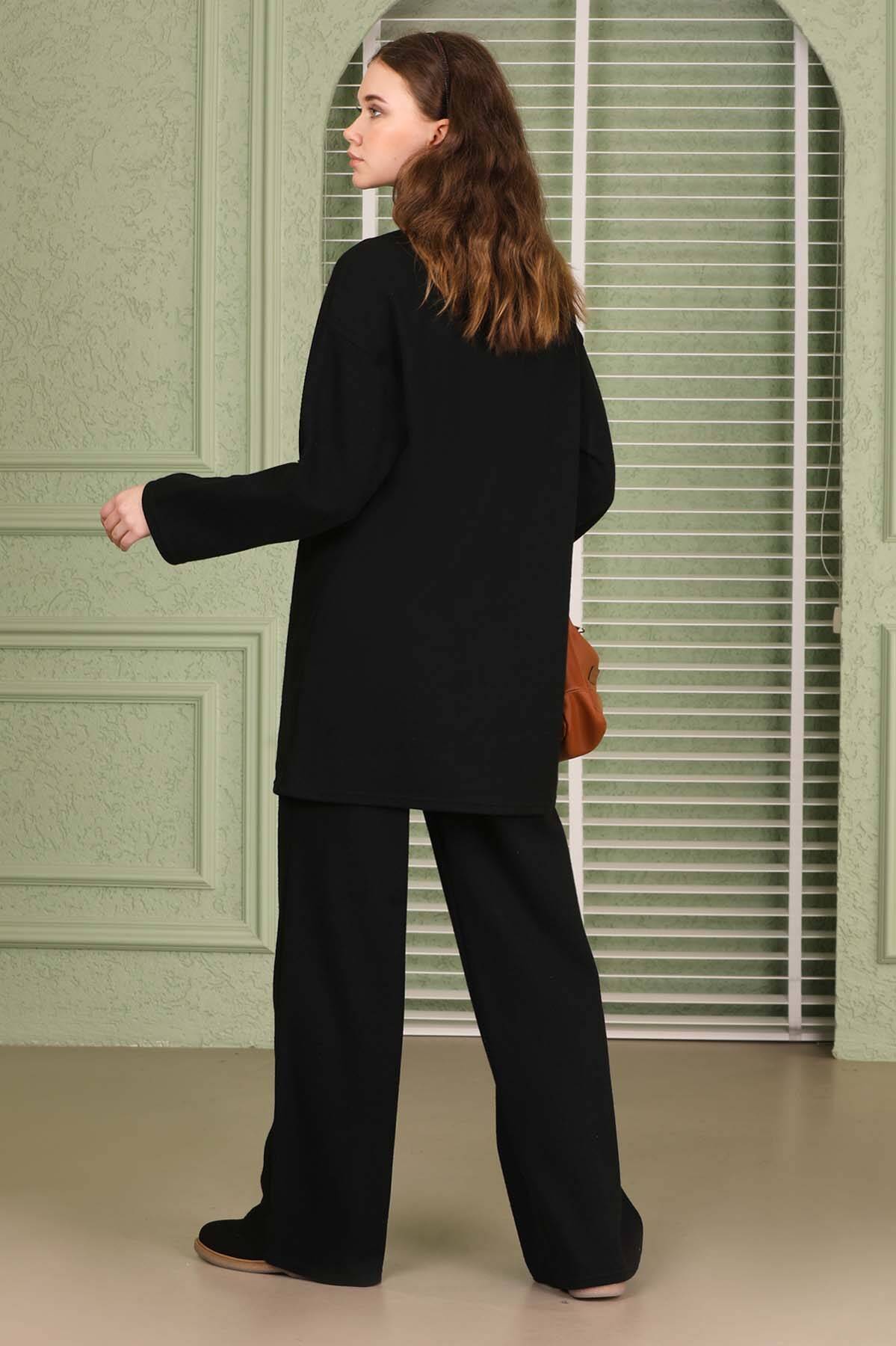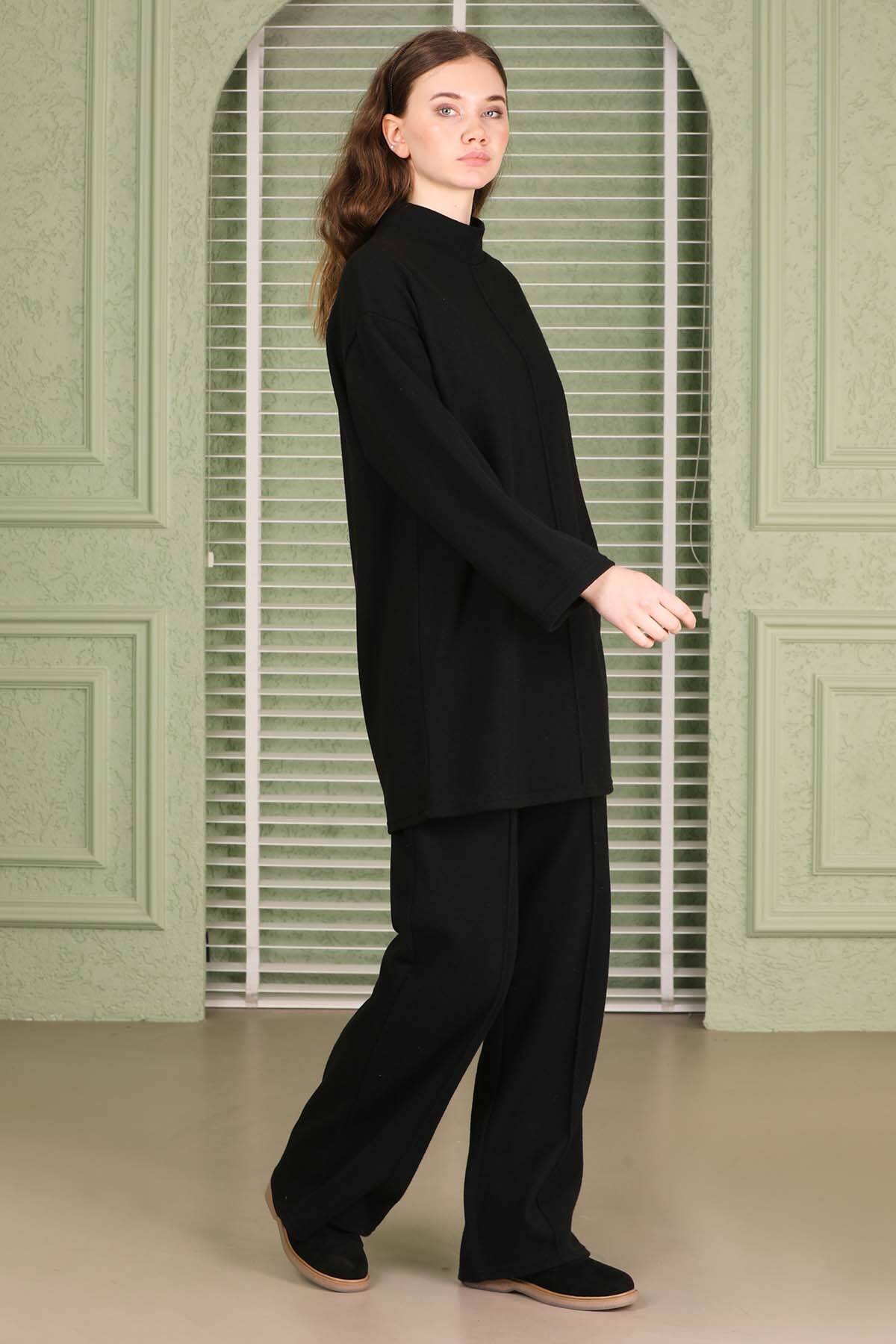Ortası Şeritli Takım Siyah. Önden dikiş izli. Dik yakalı. Pantolon beli lastiklidir. Yünlü triko kumaştır.