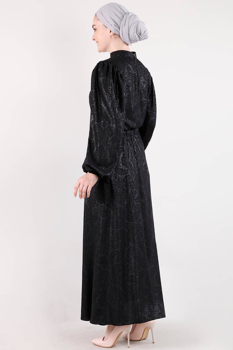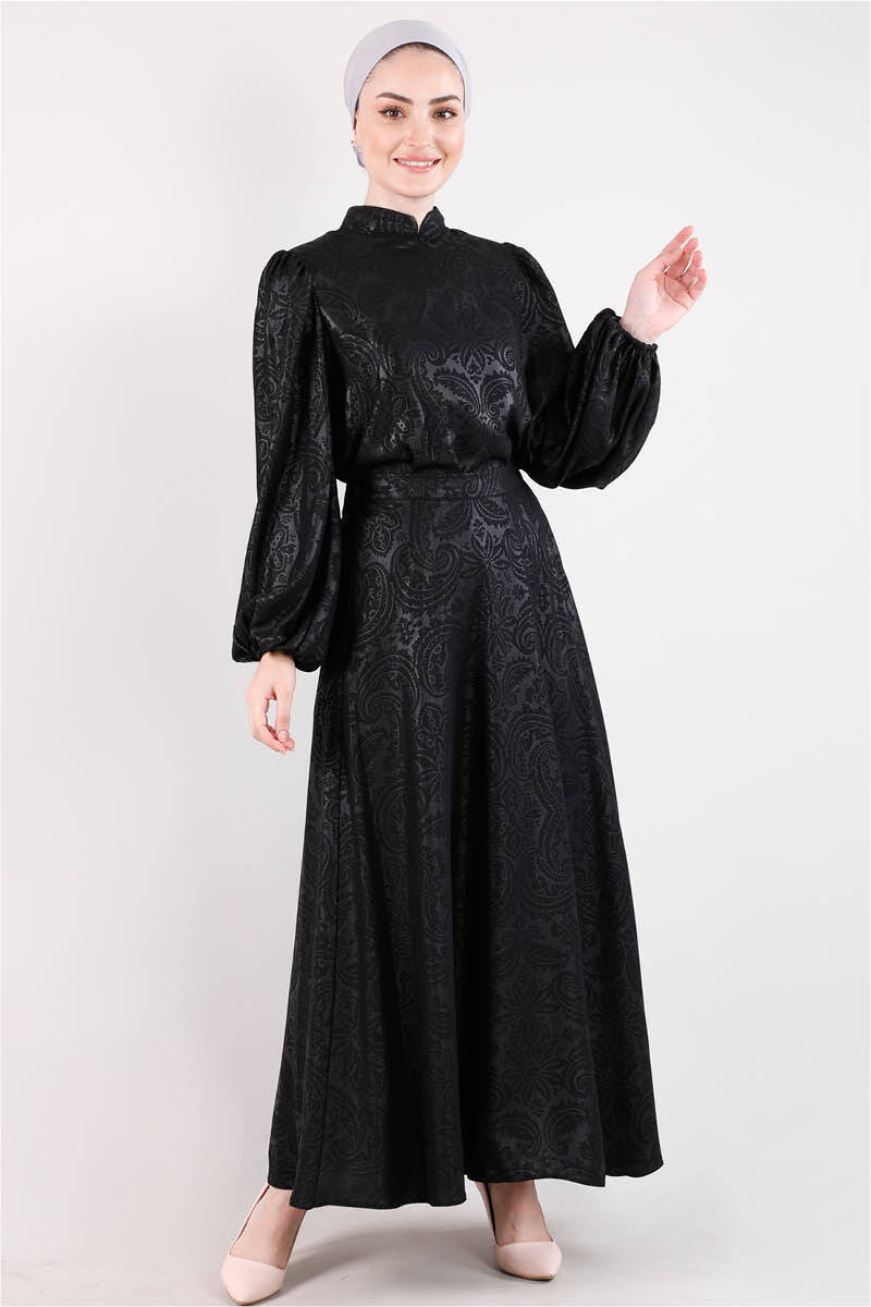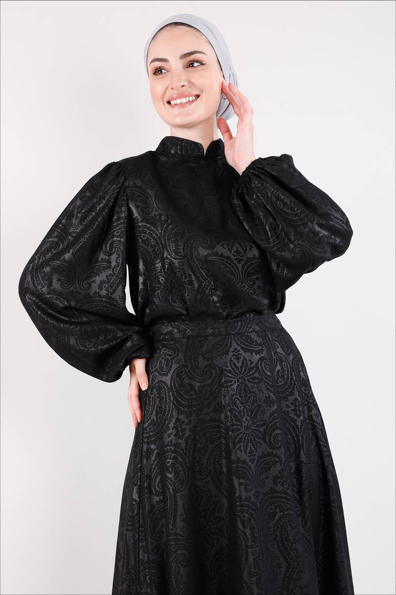 Hakim yaka, balon kol bluz. Bluz arkadan düğmeli ve fermuarlıdır. Kloş etek. Arkadan fermuarlıdır.