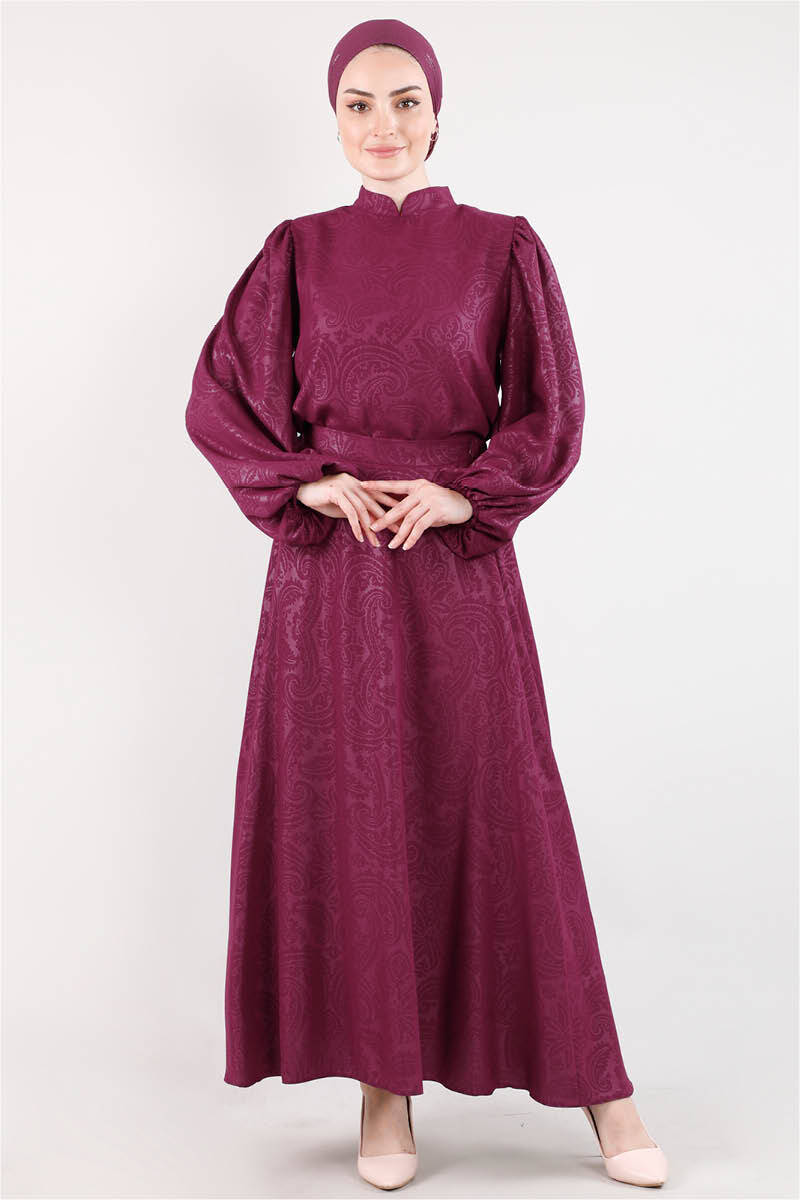 Dominate neck, balloon sleeve blouse. The blouse is buttoned and zippered at the back. Circular skirt. It has a back zipper.