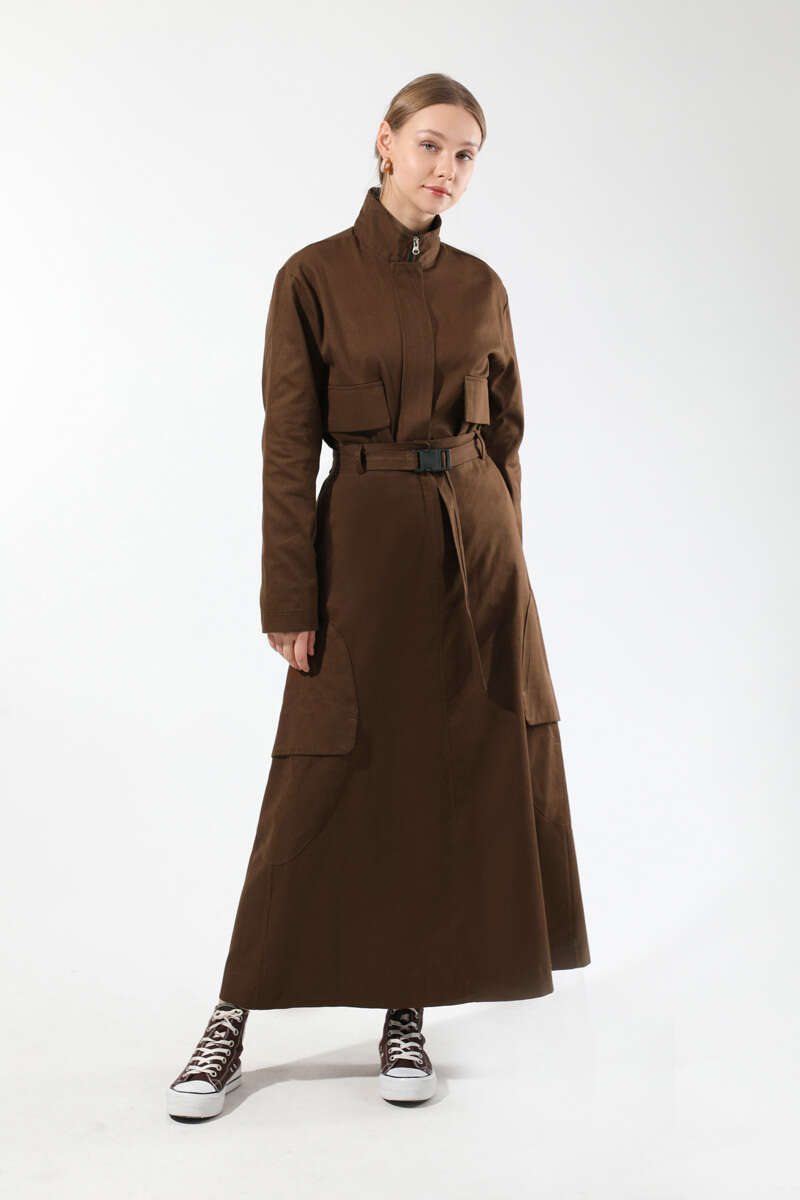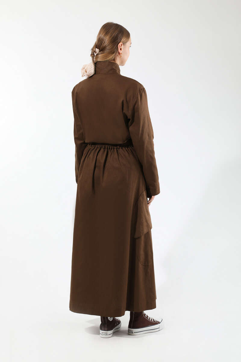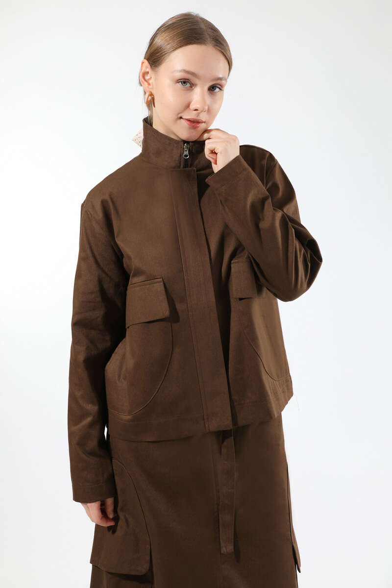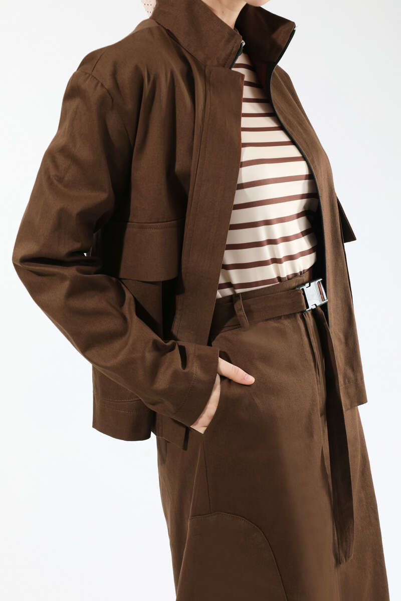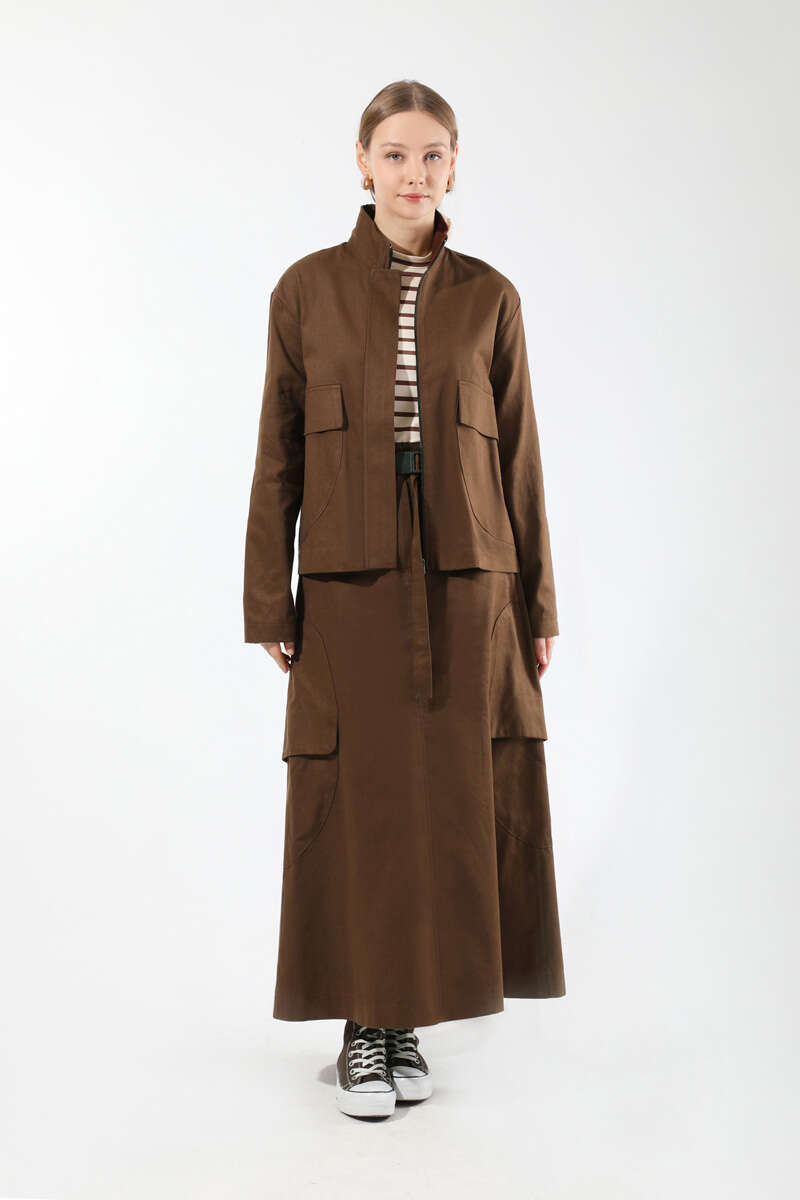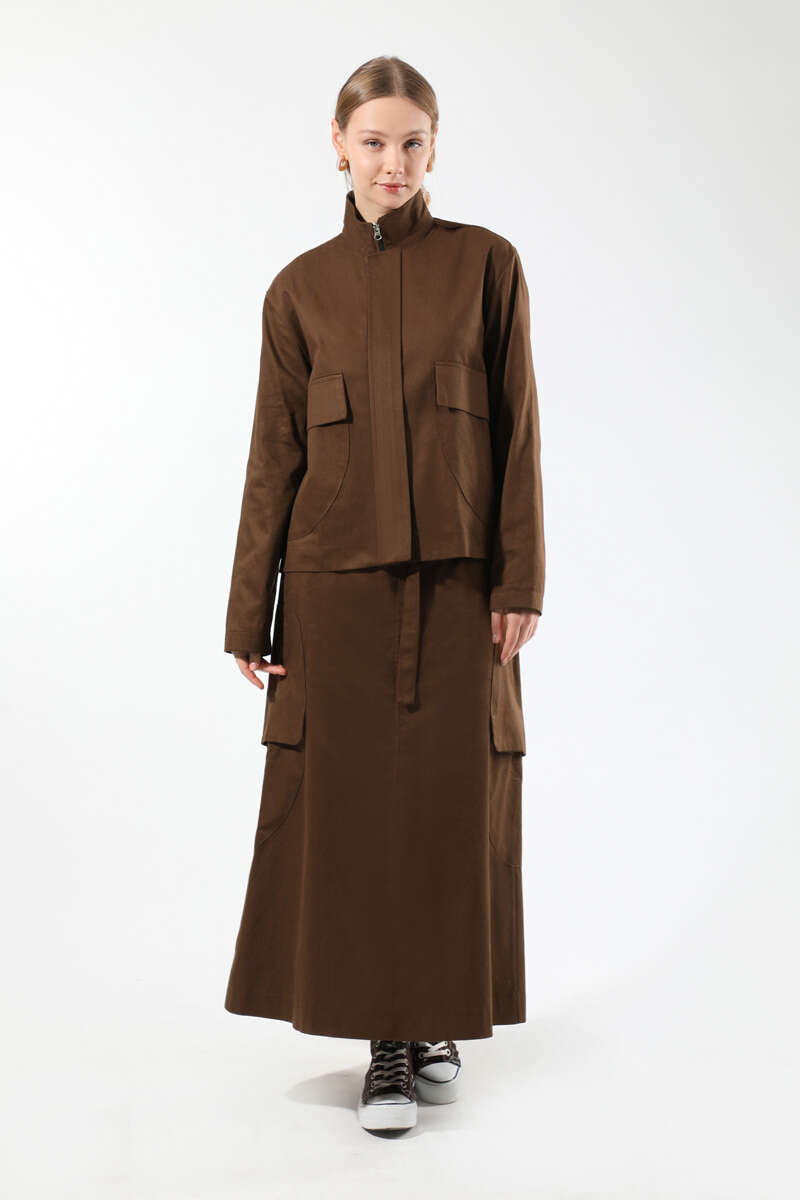 Oval Cepli Ceket Etek Takım Kahve. Dik yakalıdır. Kapaklı cep detaylıdır. Önden gizli fermuarlıdır. Etek beli lastiklidir. Etek beli kuşaklıdır. Etekte oval cep detayı mevcuttur. Günlük kullanım ve özel günlerinizde tercih edebilirsiniz.