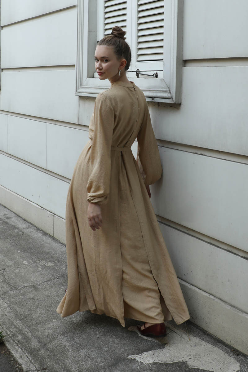 Oval Tunikli Etek Takım Camel. Tunik arkadan bele kadar düğmelidir, arkası belden sonra yıtmaç şeklindedir, önden oval kesimdir ve yanları uzundur, kemerli, manşetleri lastikli, dik yakadır. Etek beli lastikli, yandan cepli, astarsız.