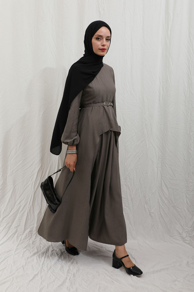 Oval Tunikli Etek Takım Toprak. Tunik arkadan bele kadar düğmelidir, arkası belden sonra yıtmaç şeklindedir, önden oval kesimdir ve yanları uzundur, kemerli, manşetleri lastikli, dik yakadır. Etek beli lastikli, yandan cepli, astarsız.