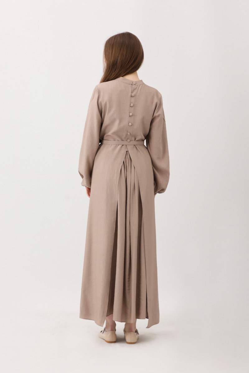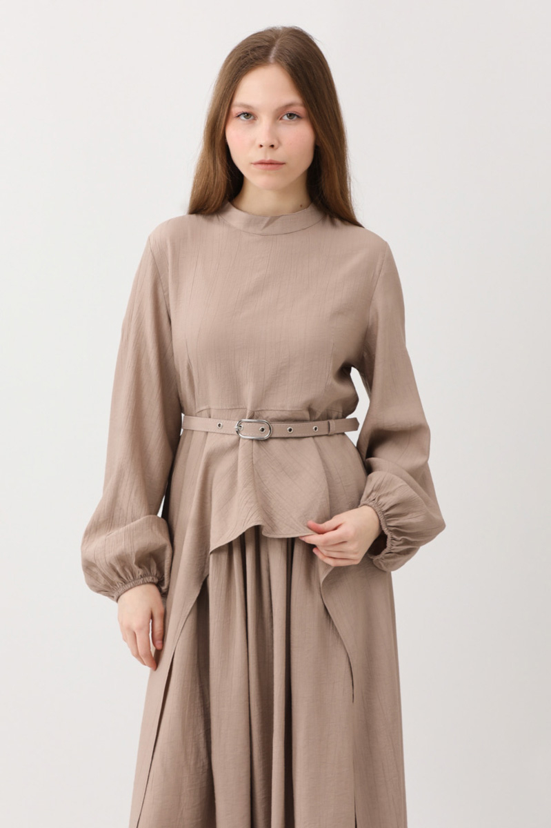 Oval Tunikli Etek Takım Vizon. Tunik arkadan bele kadar düğmelidir, arkası belden sonra yıtmaç şeklindedir, önden oval kesimdir ve yanları uzundur, kemerli, manşetleri lastikli, dik yakadır. Etek beli lastikli, yandan cepli, astarsız.