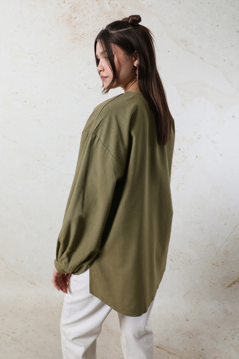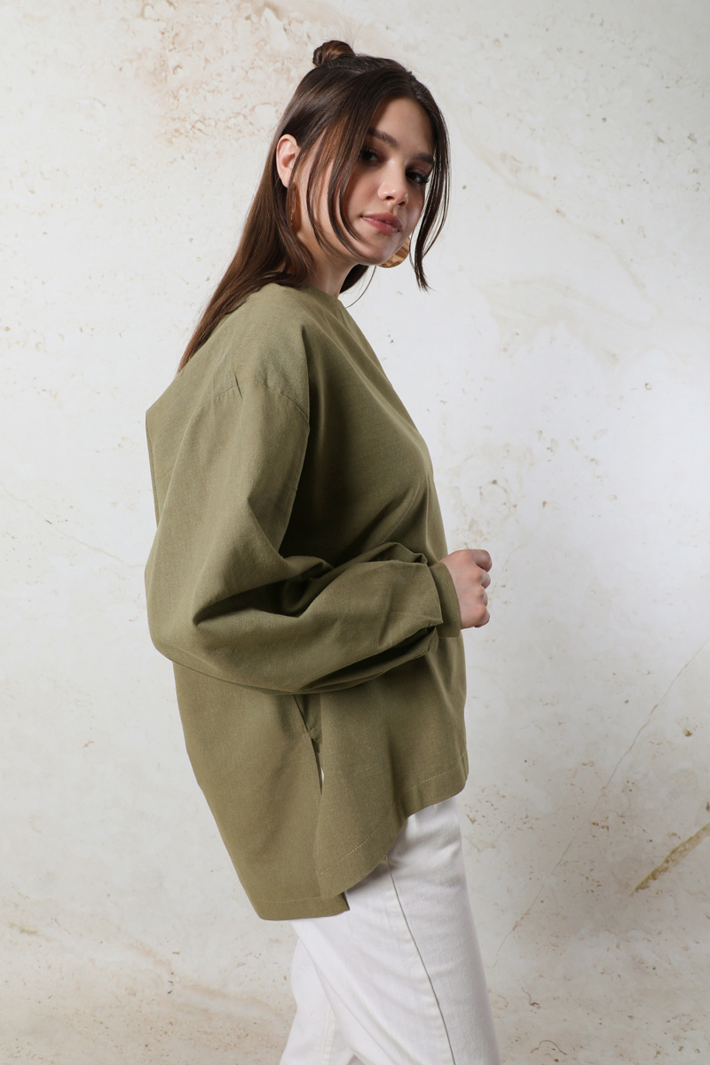 Oversize Keten Tunik Haki. Bisikle yaka, arkadan tek düğmeli, yandan yırtmaçlı, manşetleri büzgülü, düşük omuz, önü kısa arkasu uzun. Günlük ve yazlıktır. Dilerseniz eteklere dilerseniz pantolon ile kombinleyebilirsiniz. Ürünün aynı kumaşından olan Şalvar Pantolon ile kombininizi tamamlayabilirsiniz.