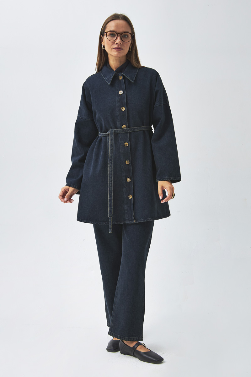With its relaxed and modern cut, this oversized denim shirt offers timeless style. The front button closure and waist tie belt make it versatile to wear both as a shirt and a tunic. Its comfortable fit adapts easily to daily outfits, while the durable denim fabric ensures long-lasting wear.