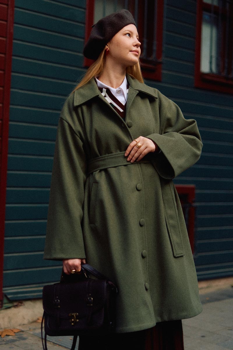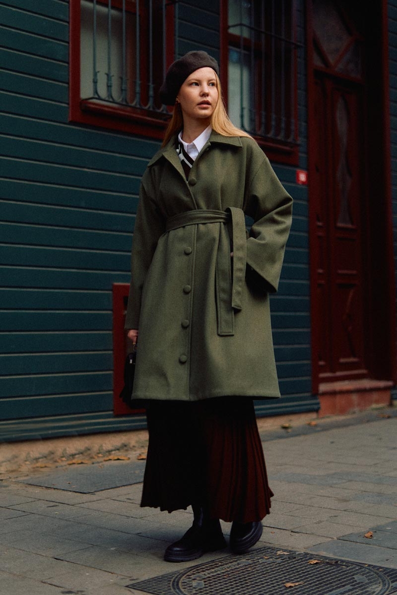 Oversize Drop-Shoulder Coat Khaki Coat in Brown stands out as one of the season’s strongest outerwear pieces, offering a relaxed form and modern lines. The dropped-shoulder design and oversized cut allow freedom of movement, while the dense wool-like texture ensures warmth throughout winter. Fully covered buttons and the waist belt allow you to adjust the silhouette as desired. An ideal choice for those seeking a simple yet characterful look in city styling.