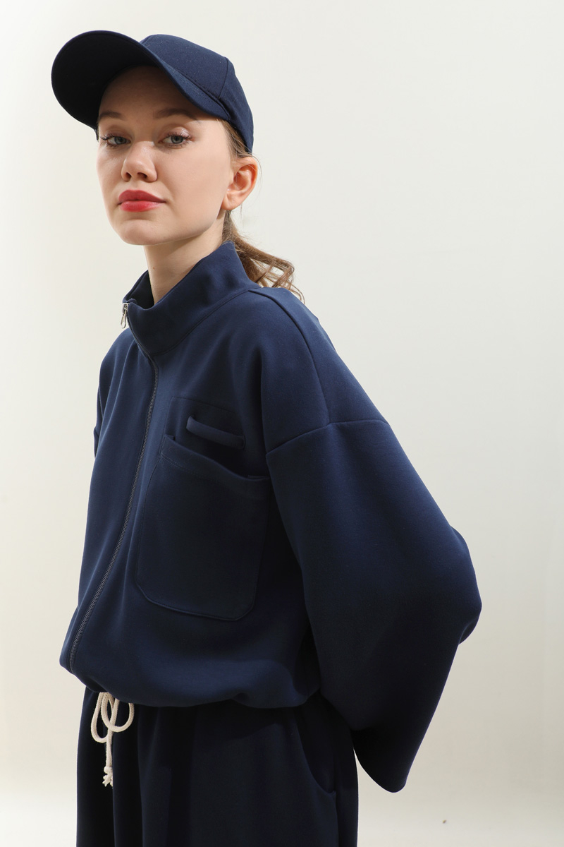Oversize Etekli Spor Takım Lacivert. Önden cep detaylı olup fermuarlıdır, dik yakadır, belden ip bağcıklıdır. Kolları geniş kesimdir. Etek belden lastikli olduğudan önden hafif büzgülüdür. ceplidir. Astarsızdır, kalın kumaş olduğudan iç göstermez. Günlük kullanım ve özel günlerinizde tercih edebilirsiniz.