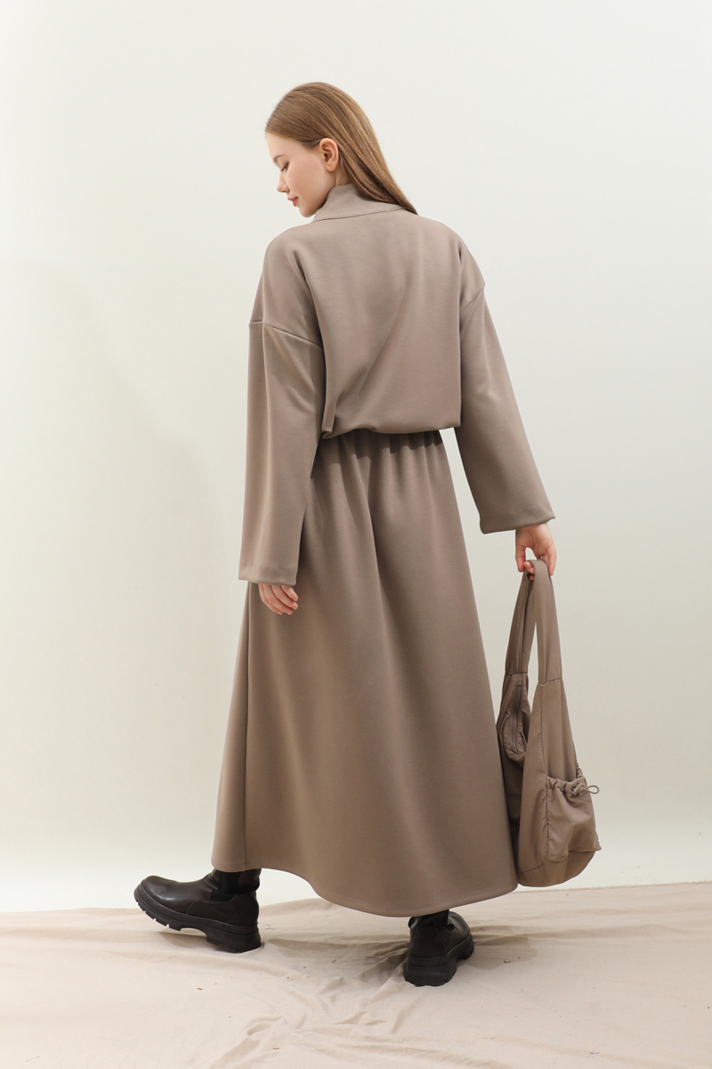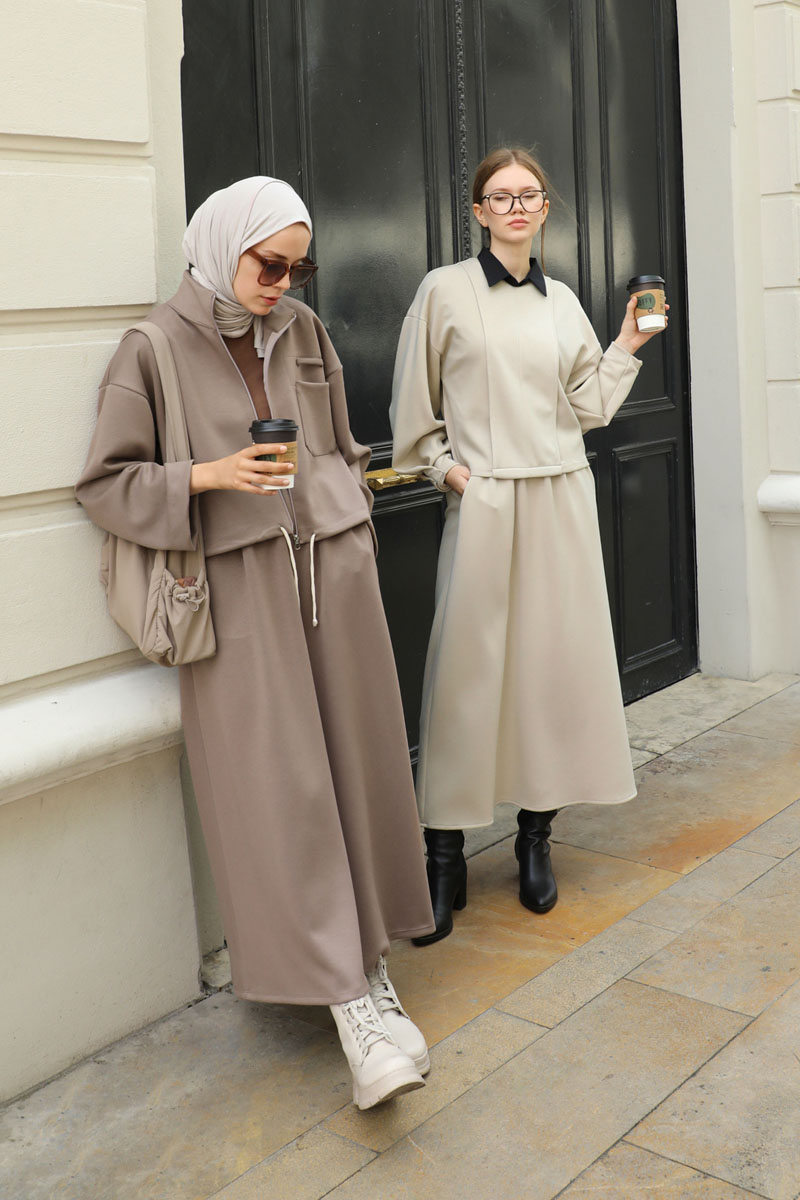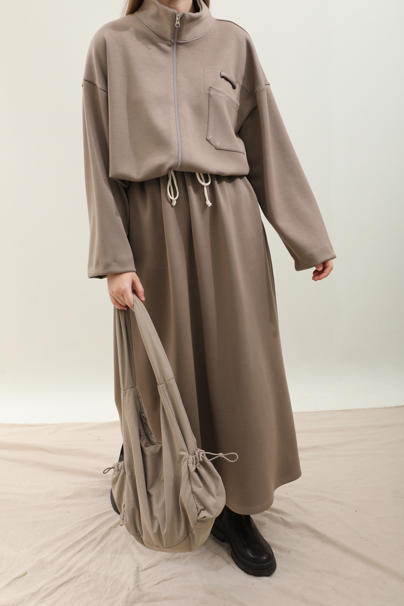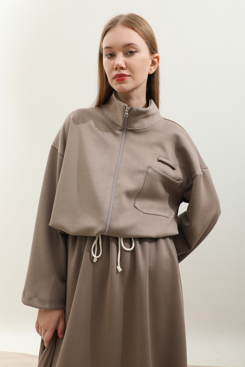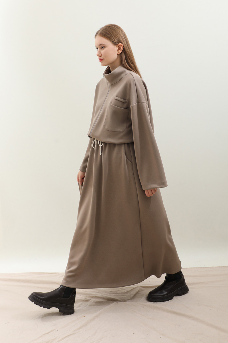 Oversize Etekli Spor Takım Toprak. Önden cep detaylı olup fermuarlıdır, dik yakadır, belden ip bağcıklıdır. Kolları geniş kesimdir. Etek belden lastikli olduğudan önden hafif büzgülüdür. ceplidir. Astarsızdır, kalın kumaş olduğudan iç göstermez. Günlük kullanım ve özel günlerinizde tercih edebilirsiniz.