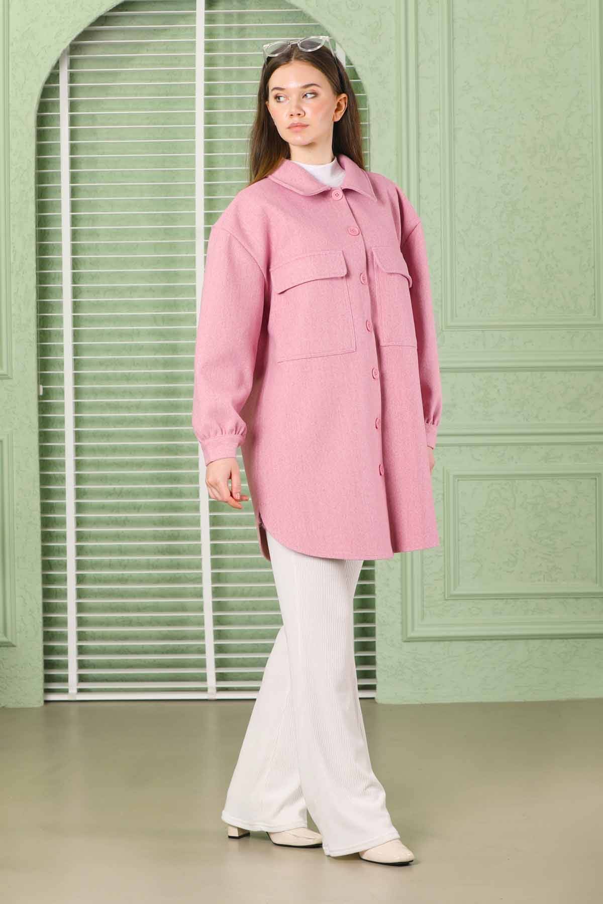 Oversize Shirt Jacket Pink. It has a shirt collar, has flap pockets, has dropped shoulders, and has a cuff detail on the sleeve. It is unlined.