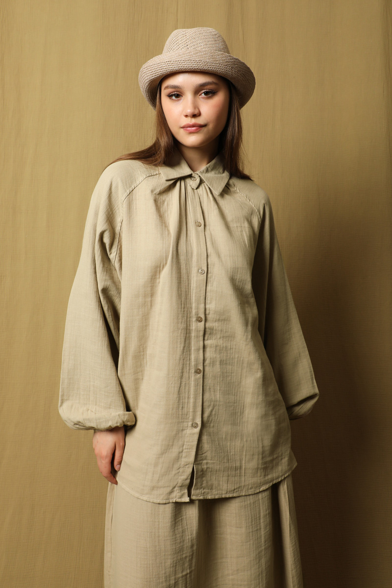 Oversıze Gömlek Etek Takım Taş. Önü düğmelidir. Reglan koldur. Manşeti lastiklidir. Etek beli lastiklidir.Astarsızdır.