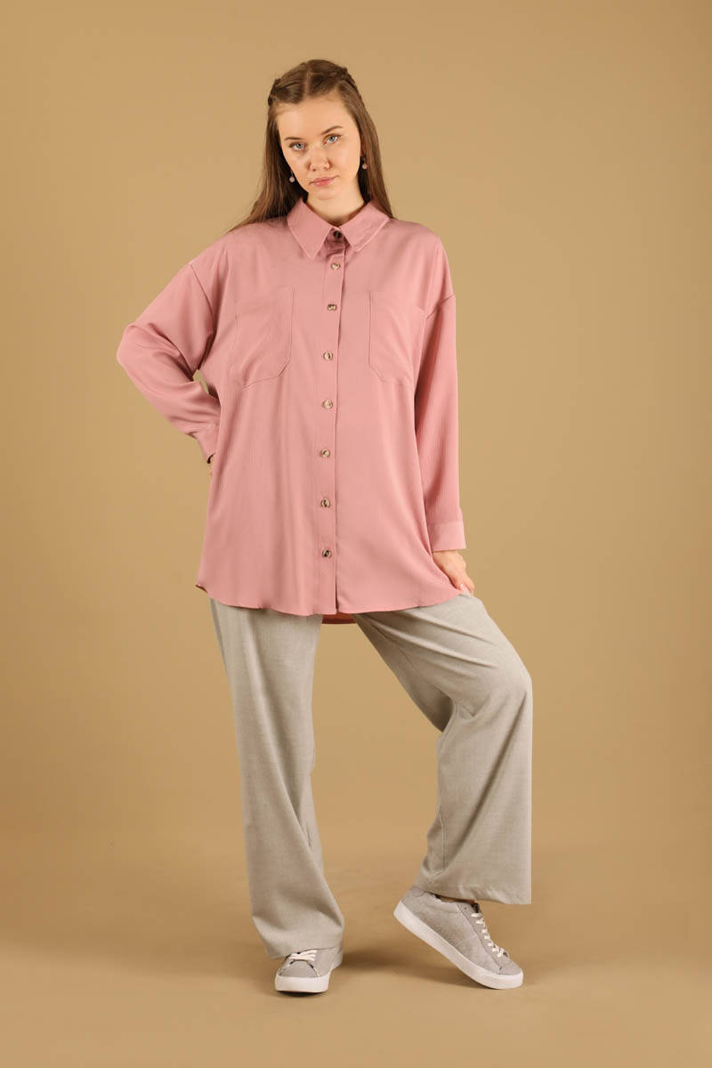 Oversize Gömlek Pudra. Gömlek yaka, Oversize , düğmeli, Pudra Renk , Düşük omuzludur. Önden iki cep, yandan iki cep mevcuttur. Yeni Sezon ürünüdür.