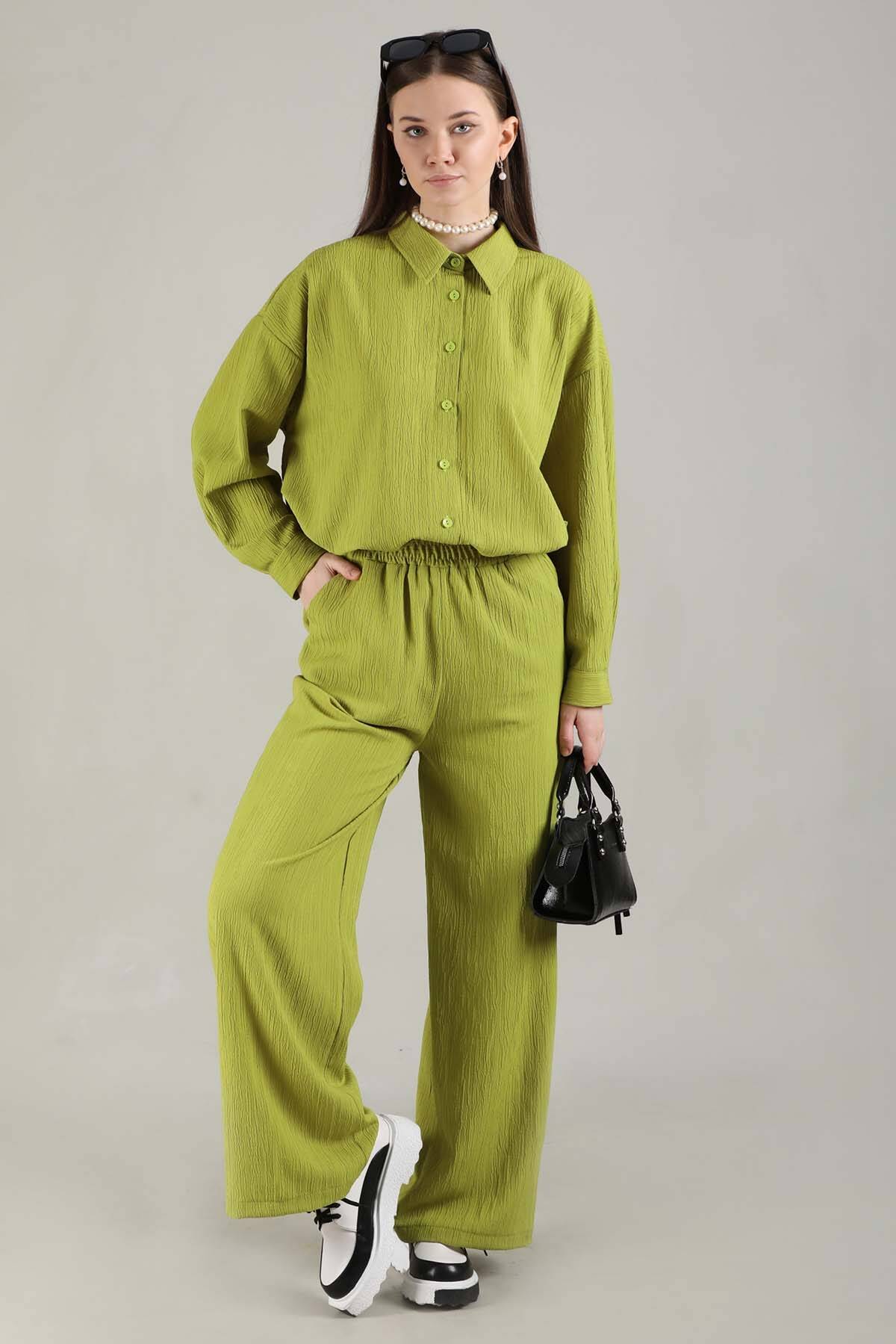 Oversize Gömlek Takım Yağ Yeşili. cepli, krinkıl kumaş ile oldukça şık ve zarif bir görünüme sahip modelimiz , pantolon ile birlikte satılmaktadır.