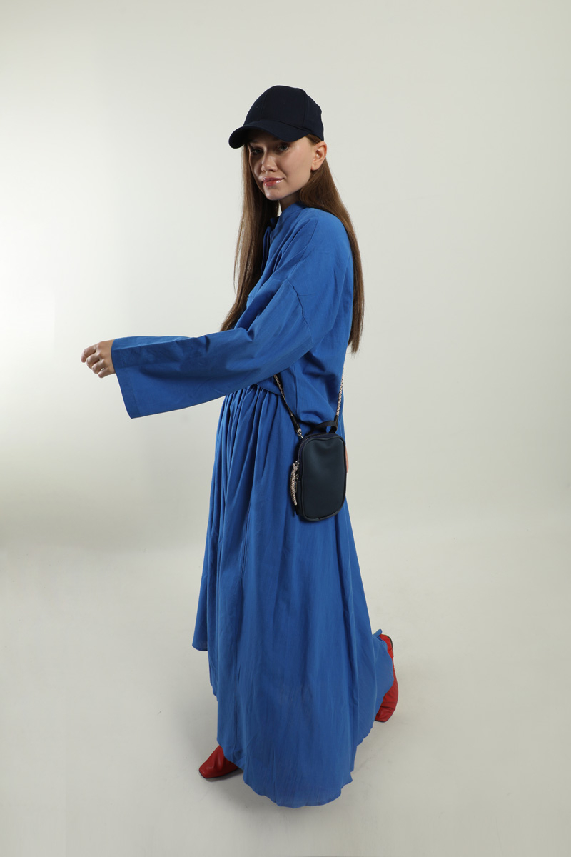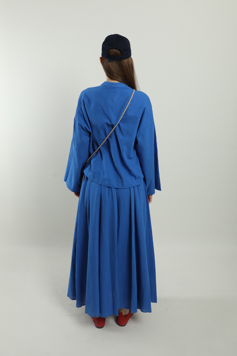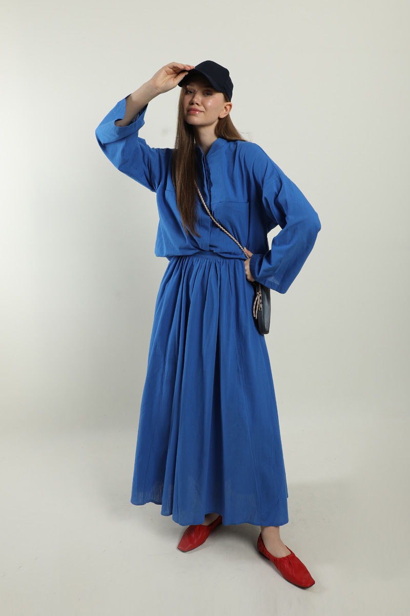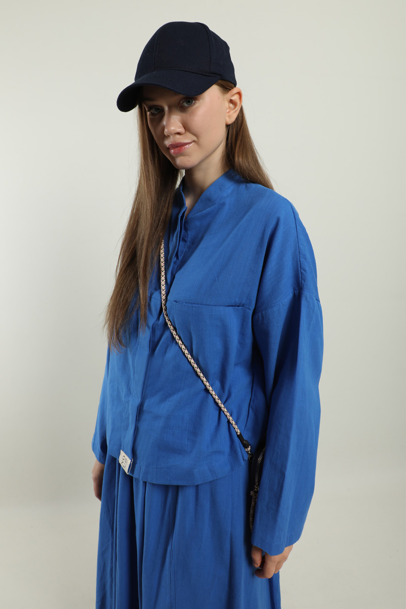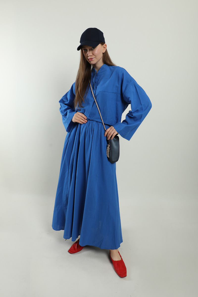 Oversıze Keten Etek Takım Saks Mavisi. Gömlek hakim yakalıdır, önden ceplidir, gömlekteki cep kapalı haldedir, kullanmak isterseniz dikişleri sökebilirsiniz, gizli düğmelidir, salaştır. Etek yandan fermuarlıdır, yandan ceplidir, astarlıdır, yaz mevsimi için uygundur.