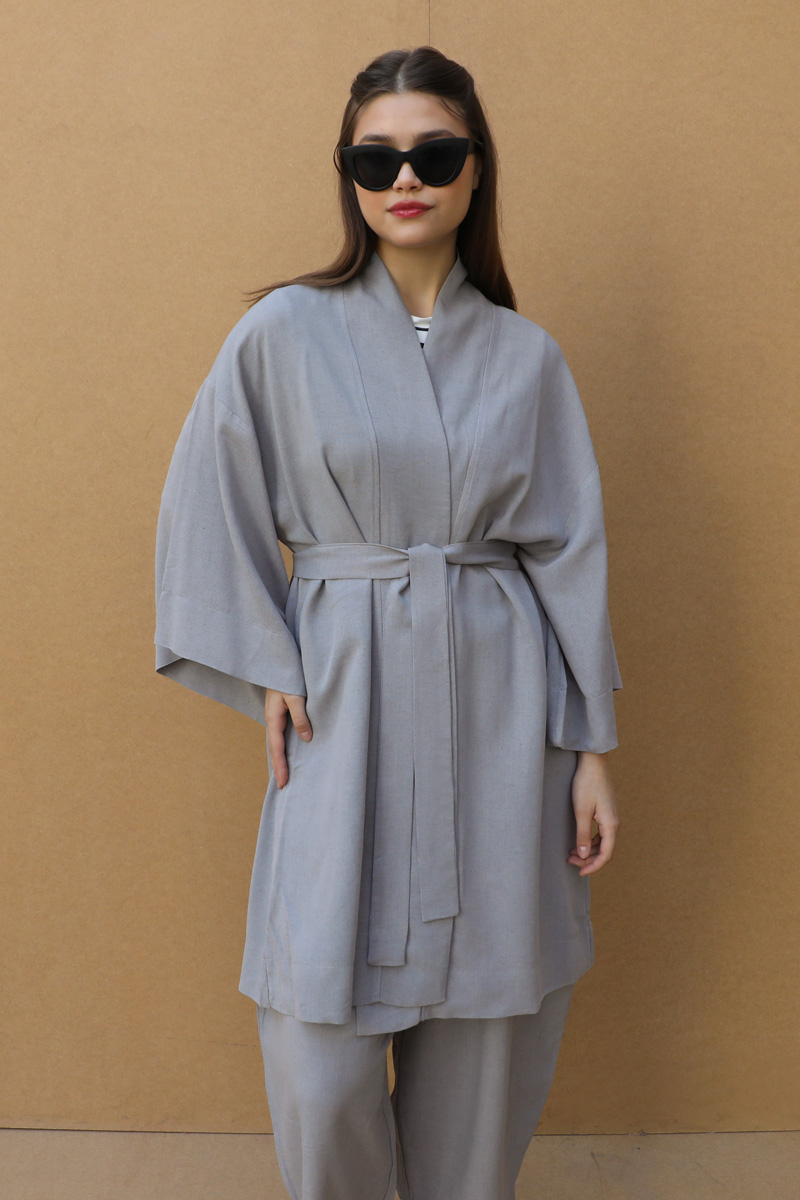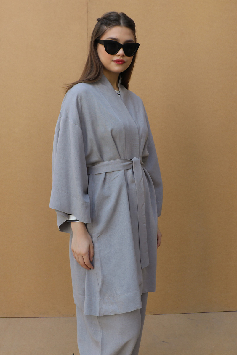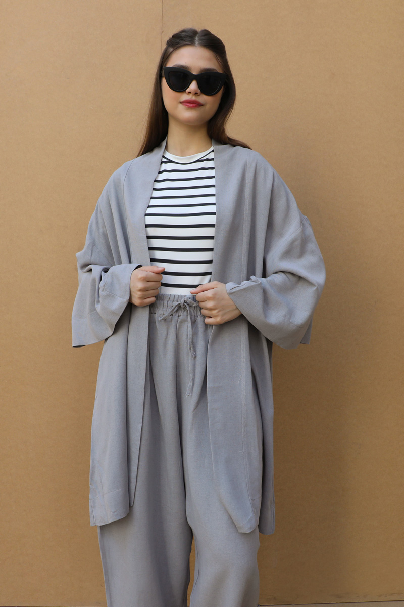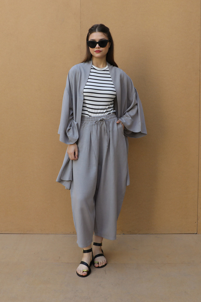 Oversıze Keten Takım Gri. Düşük omuzludur. Yarım yarasa kolludur. Kuşaklıdır. Pantolon beli lastiklidir, yandan ceplidir. Astarsızdır.Günlük ve özel günlerde kullanıma uygundur. KİMONO BEDENİ STANDARTTIR