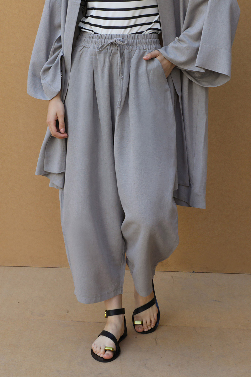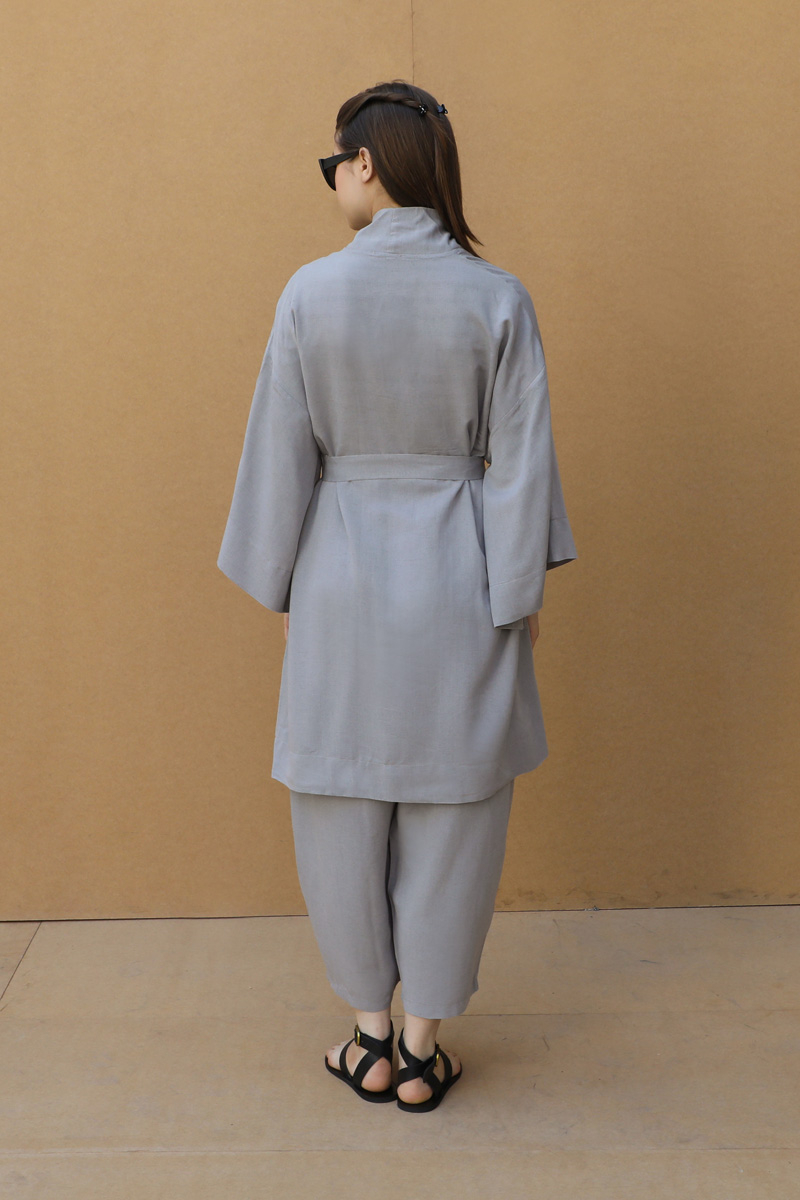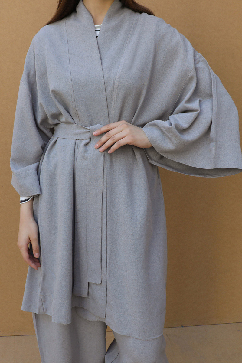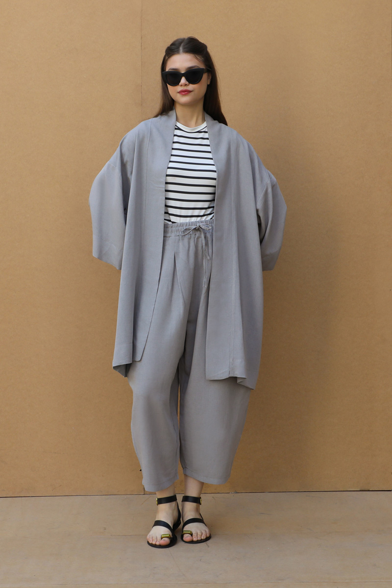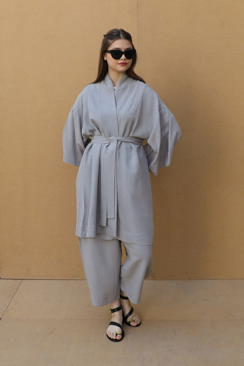 Oversıze Keten Takım Gri. Düşük omuzludur. Yarım yarasa kolludur. Kuşaklıdır. Pantolon beli lastiklidir, yandan ceplidir. Astarsızdır.Günlük ve özel günlerde kullanıma uygundur. KİMONO BEDENİ STANDARTTIR
