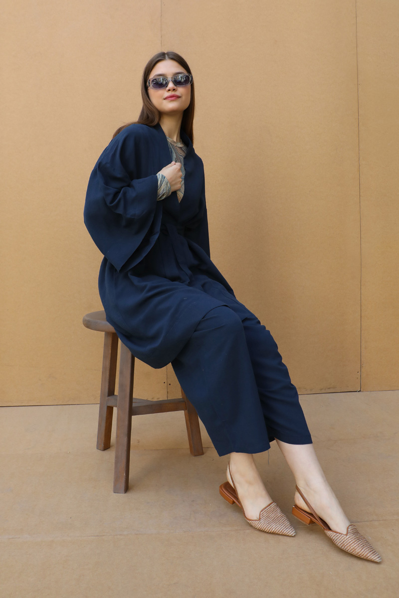 Oversıze Keten Takım Lacivert. Düşük omuzludur. Yarım yarasa kolludur. Kuşaklıdır. Pantolon beli lastiklidir, yandan ceplidir. Astarsızdır. Günlük ve özel günlerde kullanıma uygundur. KİMONO BEDENİ STANDARTTIR