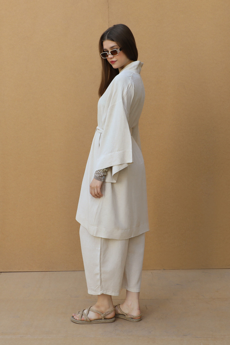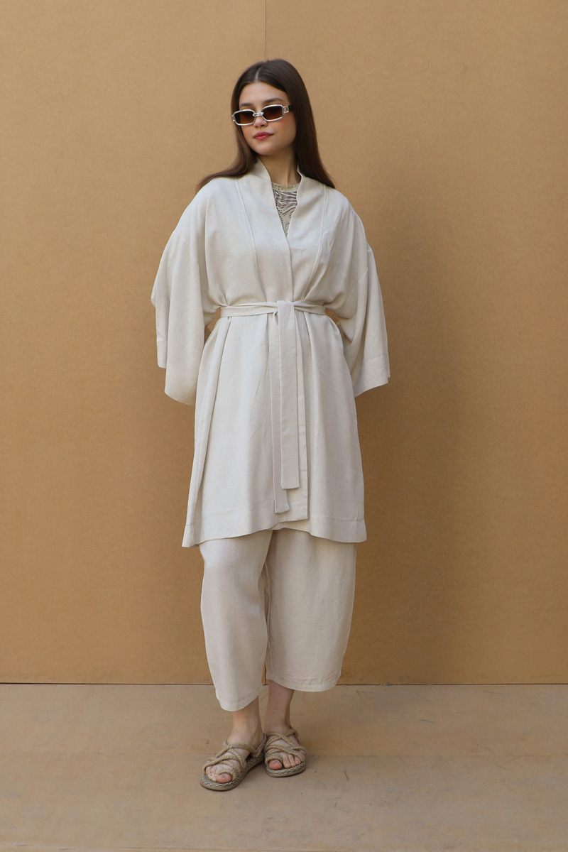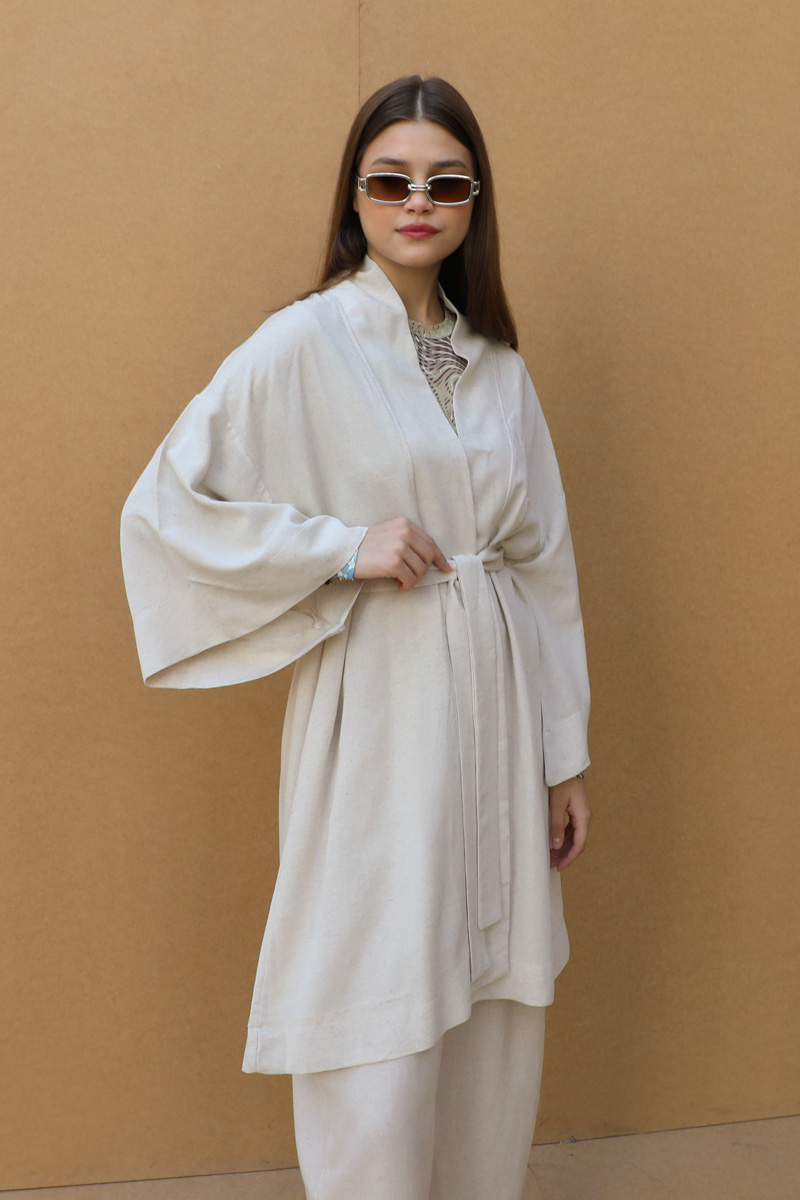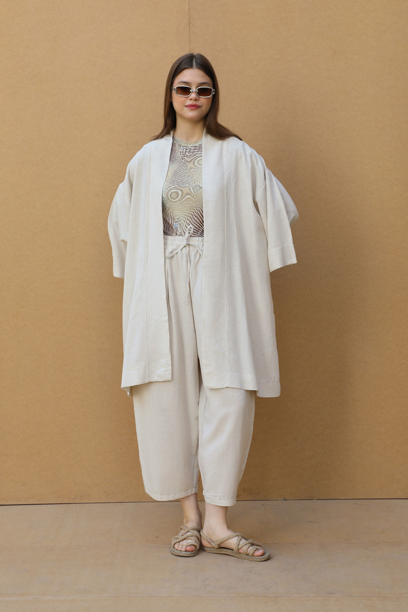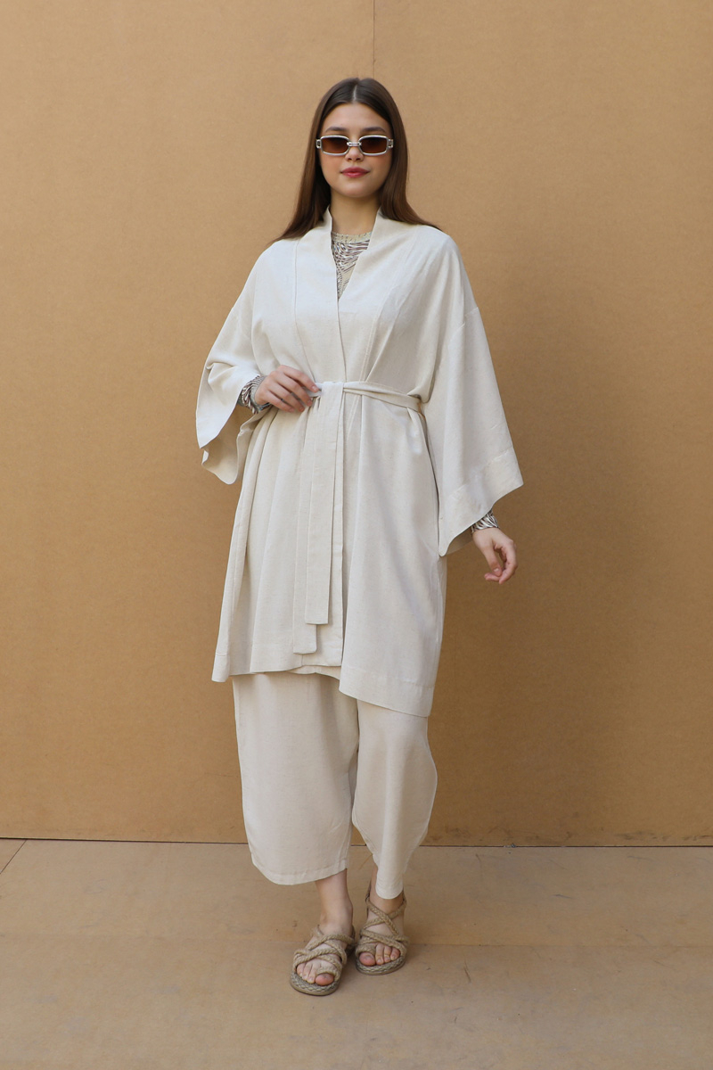 Oversıze Keten Takım Taş. Düşük omuzludur. Yarım yarasa kolludur. Kuşaklıdır. Pantolon beli lastiklidir, yandan ceplidir. Astarsızdır. Günlük ve özel günlerde kullanıma uygundur. KİMONO BEDENİ STANDARTTIR