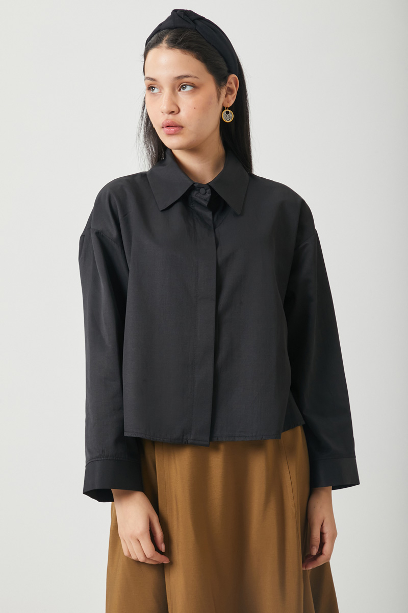 Oversize Kısa Gömlek Siyah. Gömlek yakadır, önden gizli düğmelidir, düşük omuzludur, kol ucu geniş manşetlidir, oversize kalıptır, cepsizdir. Günlük kullanım ve özel günlerinizde tercih edebilirsiniz.