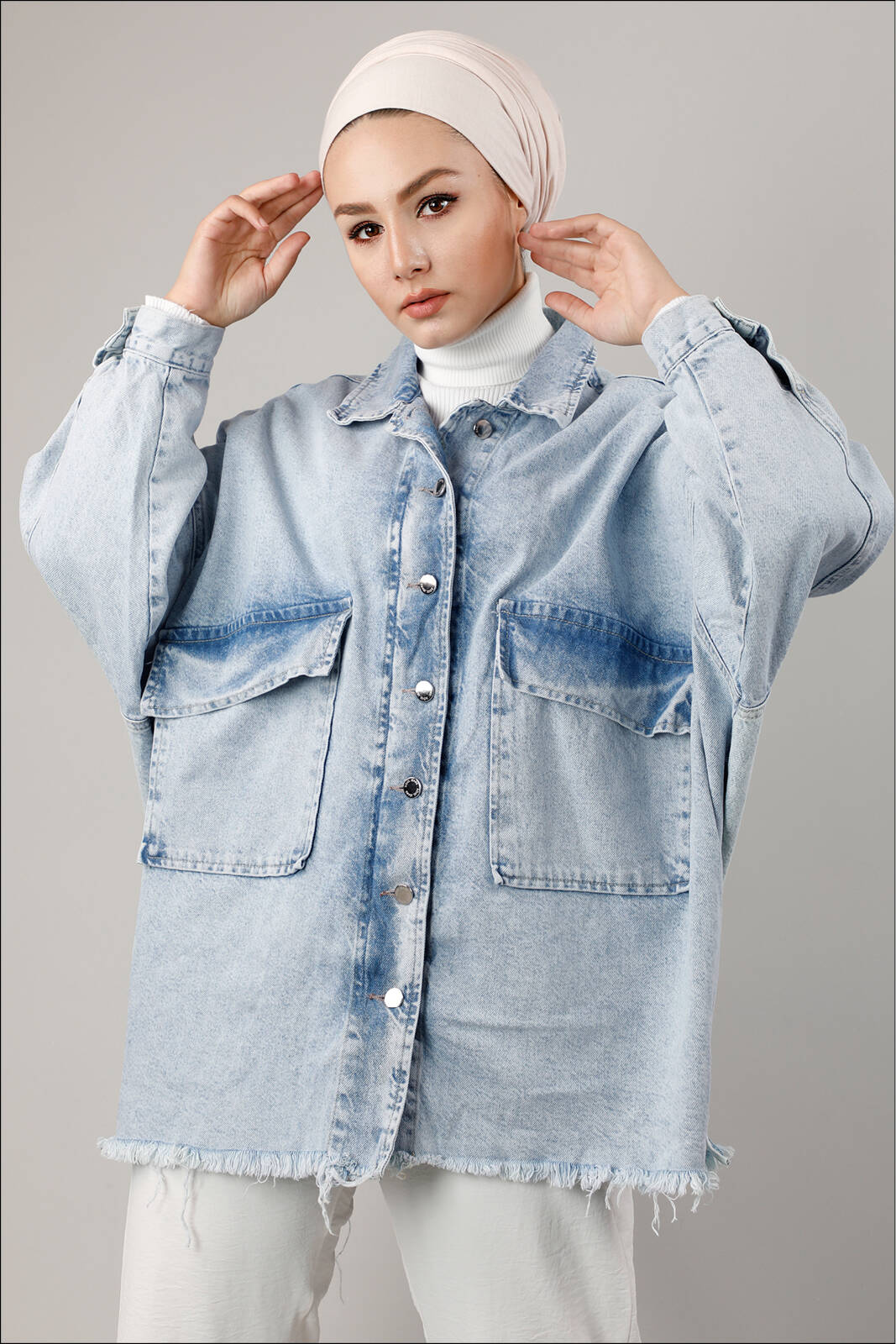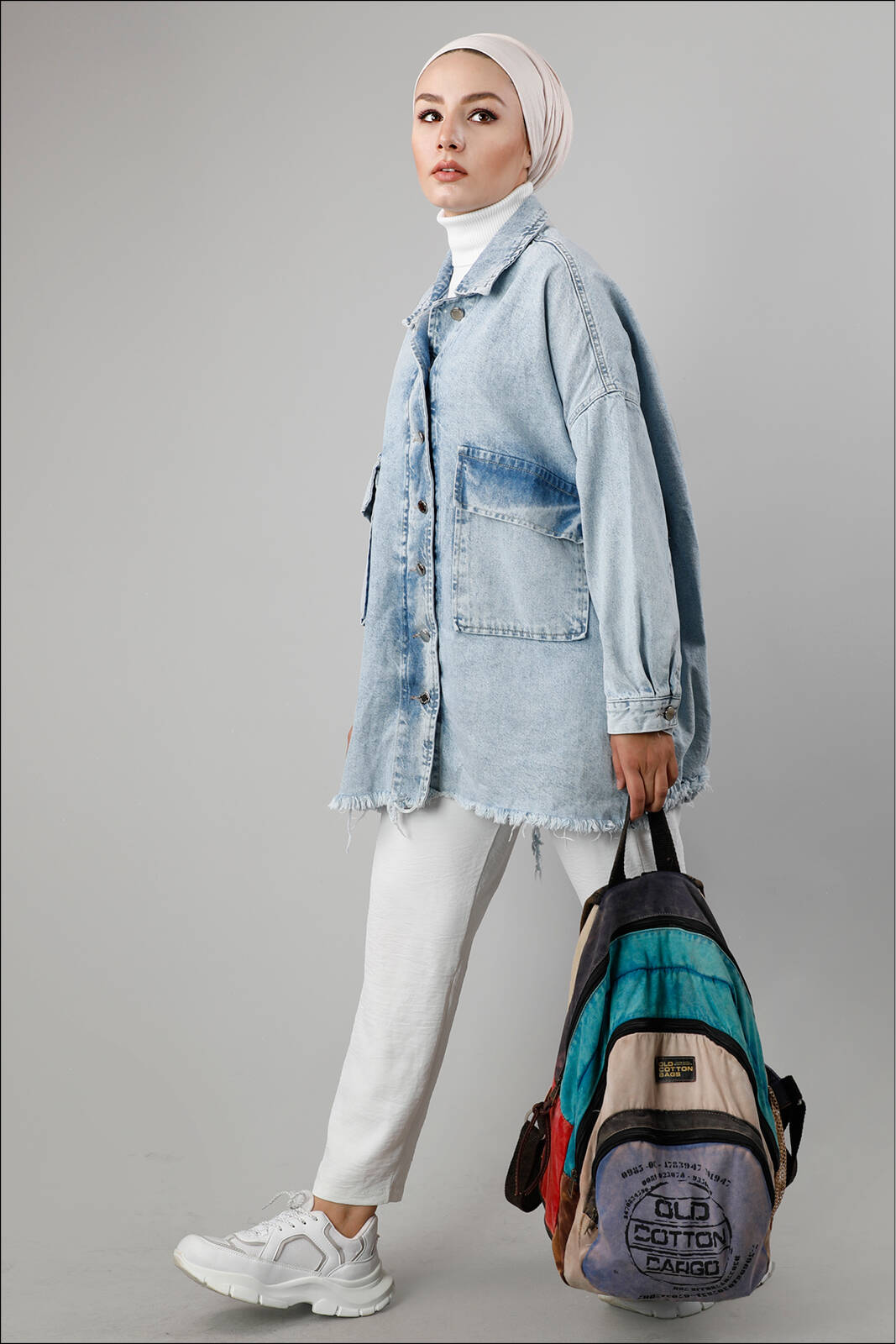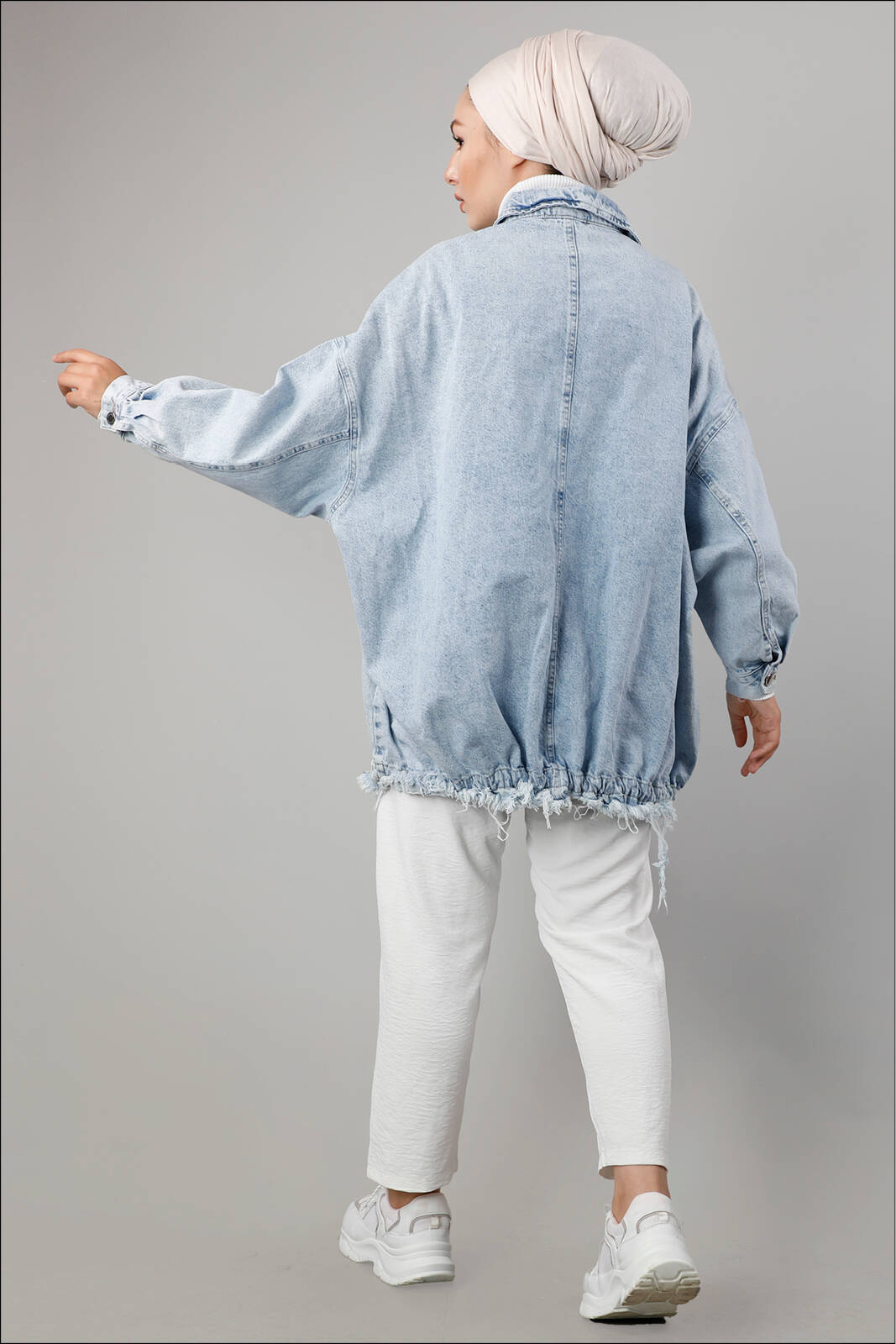 Oversize modeldir. Düşük omuz. Kapaklı büyük cepleri mevcuttur. Arkası büzgü detaylıdır.
