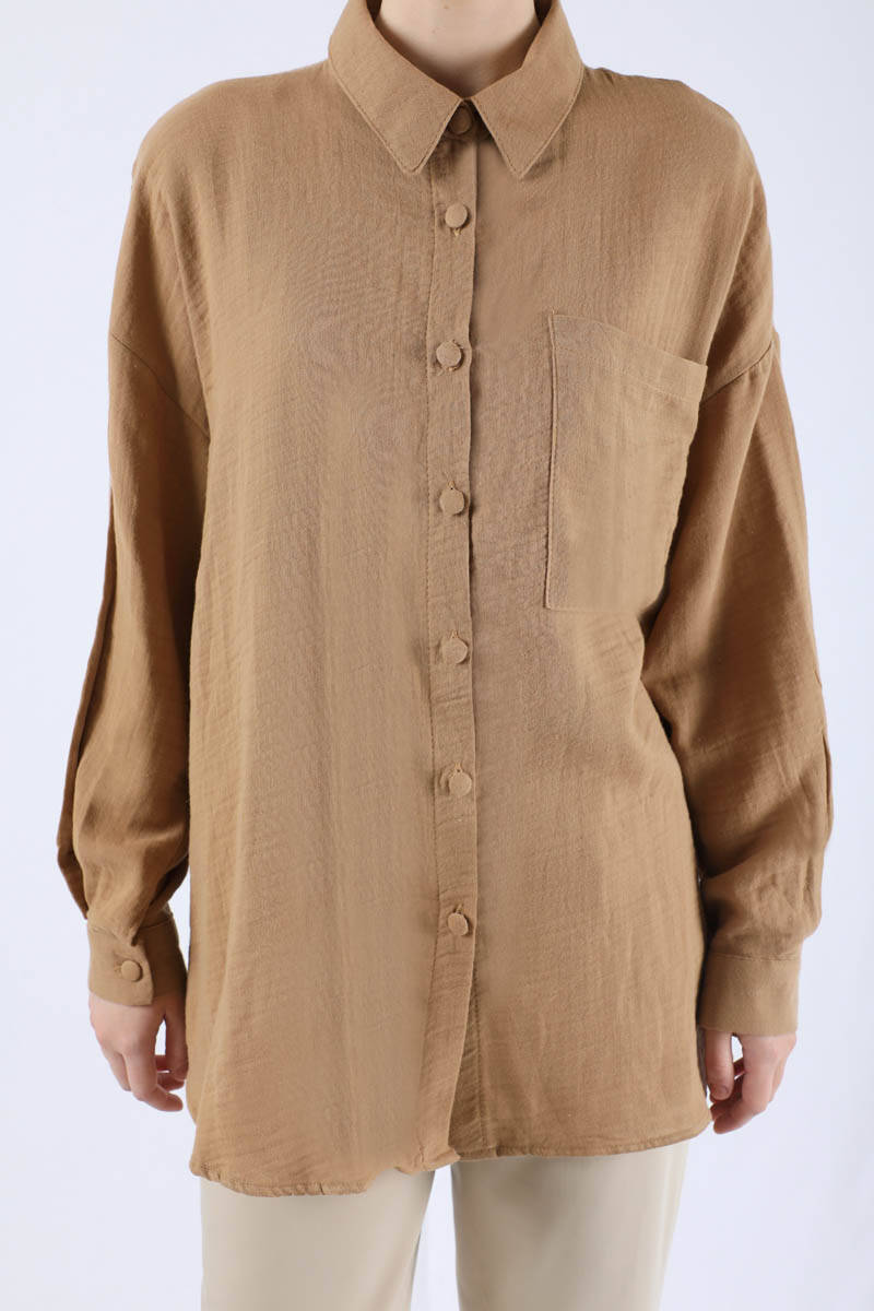 Oversize Müslin Gömlek Camel. Cep detaylıdır. Kolu manşetlidir. Düşük omuzludur. Kaplama düğme detaylıdır. Arkadan pile detaylıdır. Günlük kullanım ve özel günlerinizde tercih edebilirsiniz.