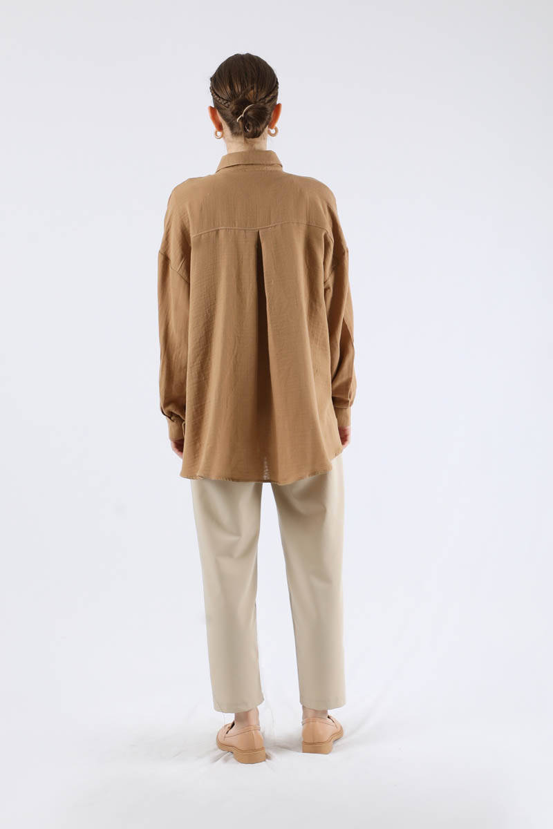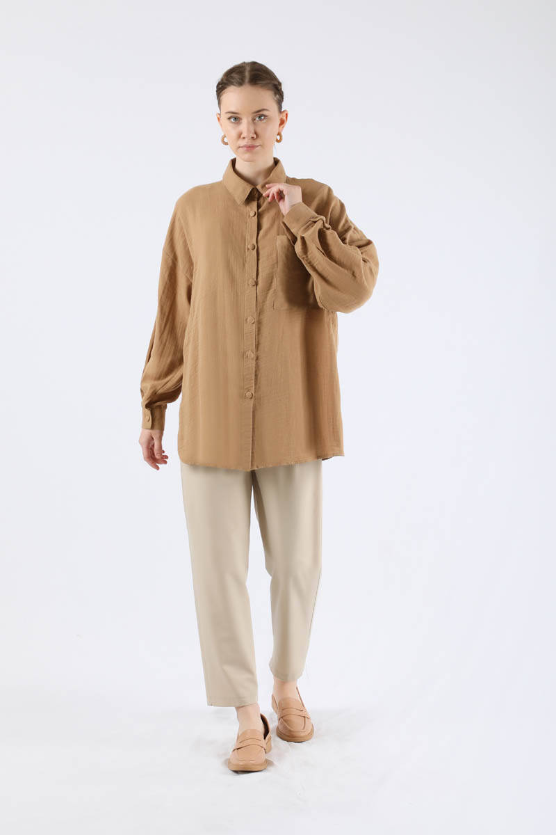 Oversize Muslin Shirt Camel. Pocket detail. His arm is cuffed. It has low shoulders. Covered button detail. Back pleat detail. You can choose it for your daily use and special occasions.