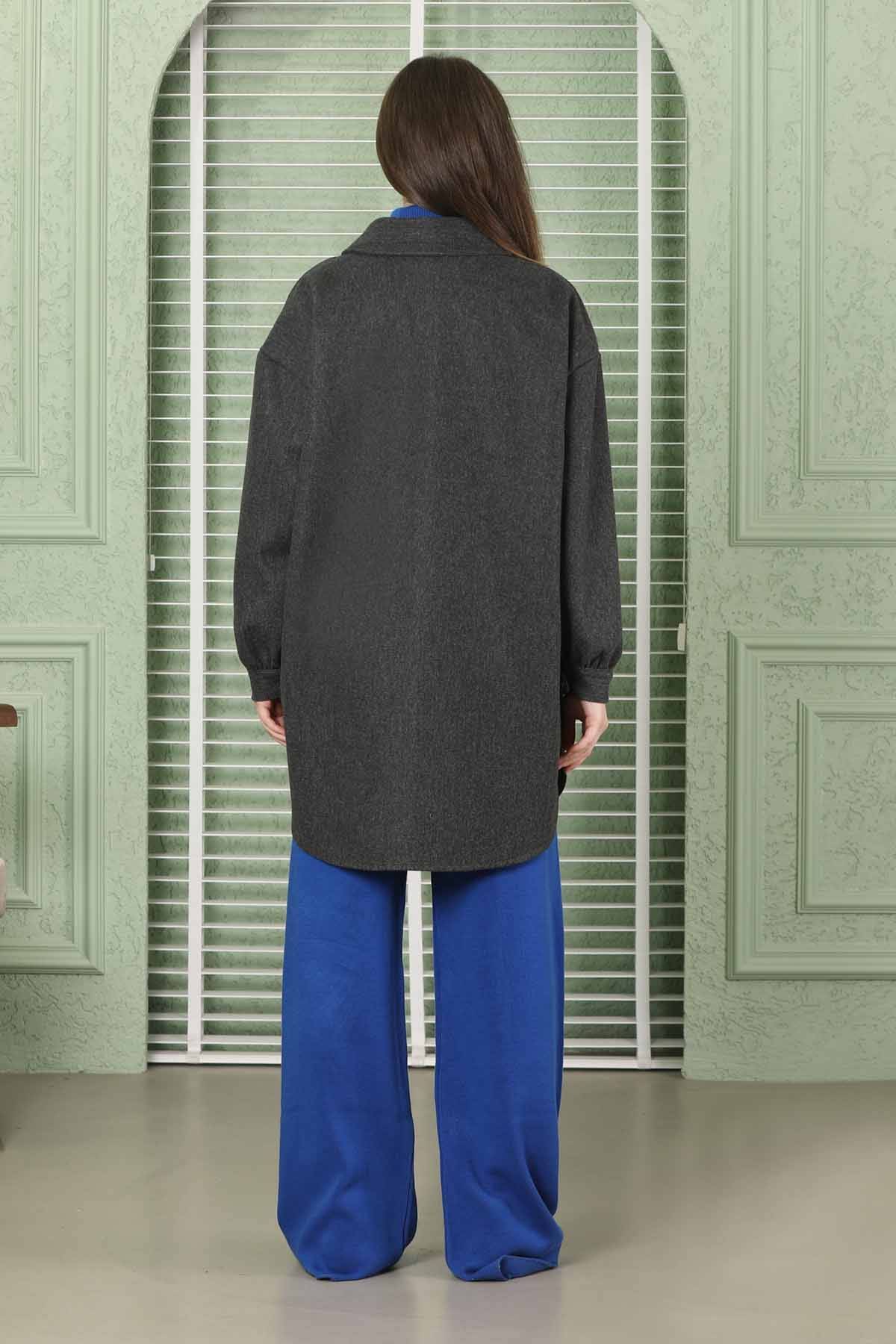 Oversize Shirt Jacket Anthracite. It has a shirt collar, has flap pockets, has dropped shoulders, and has a cuff detail on the sleeve. It is unlined.