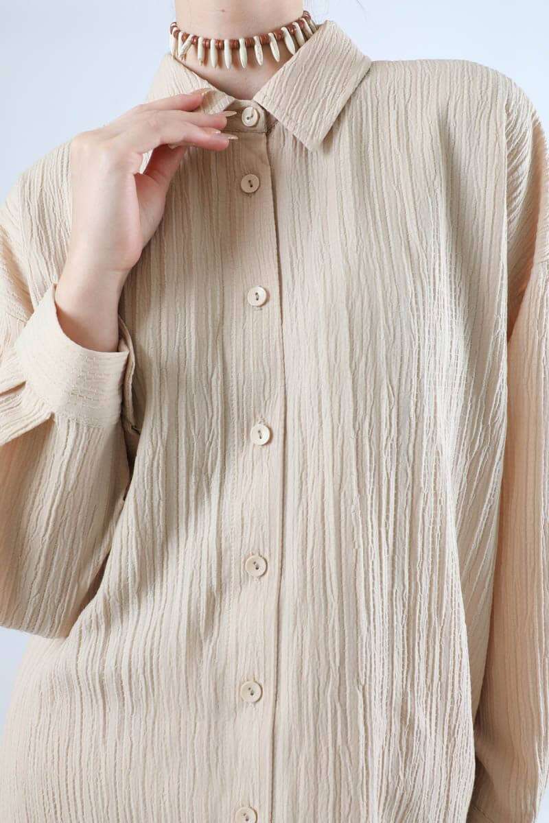 Oversize Shirt Suit Cream. Our model, which has pockets and a very stylish and elegant appearance with its crinkle fabric, is sold with trousers.