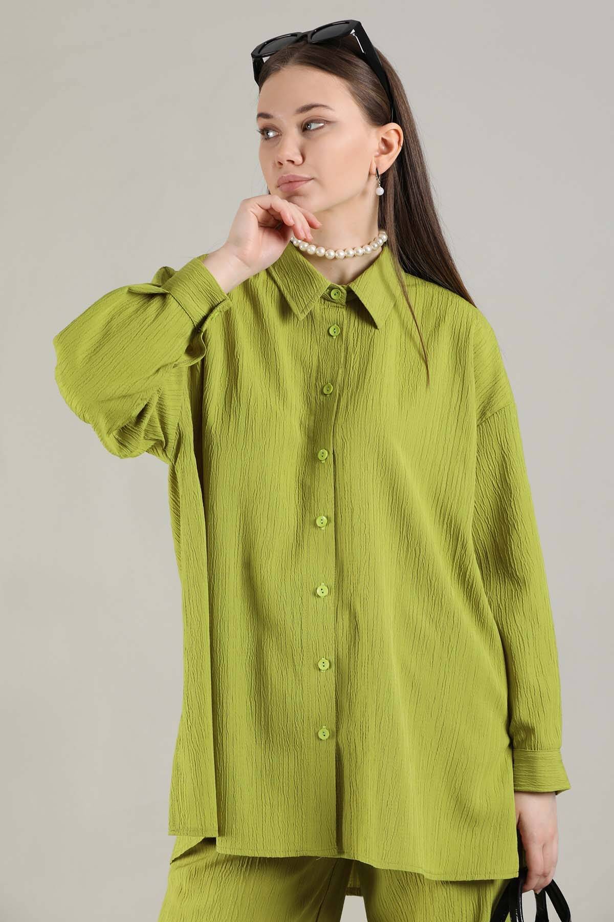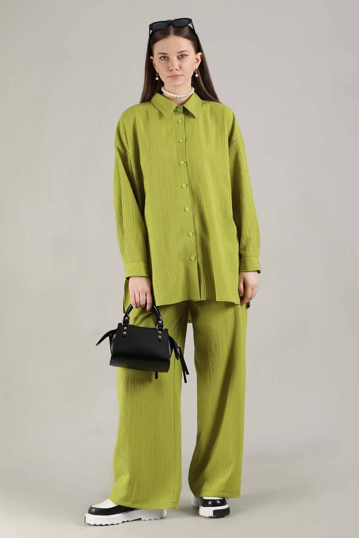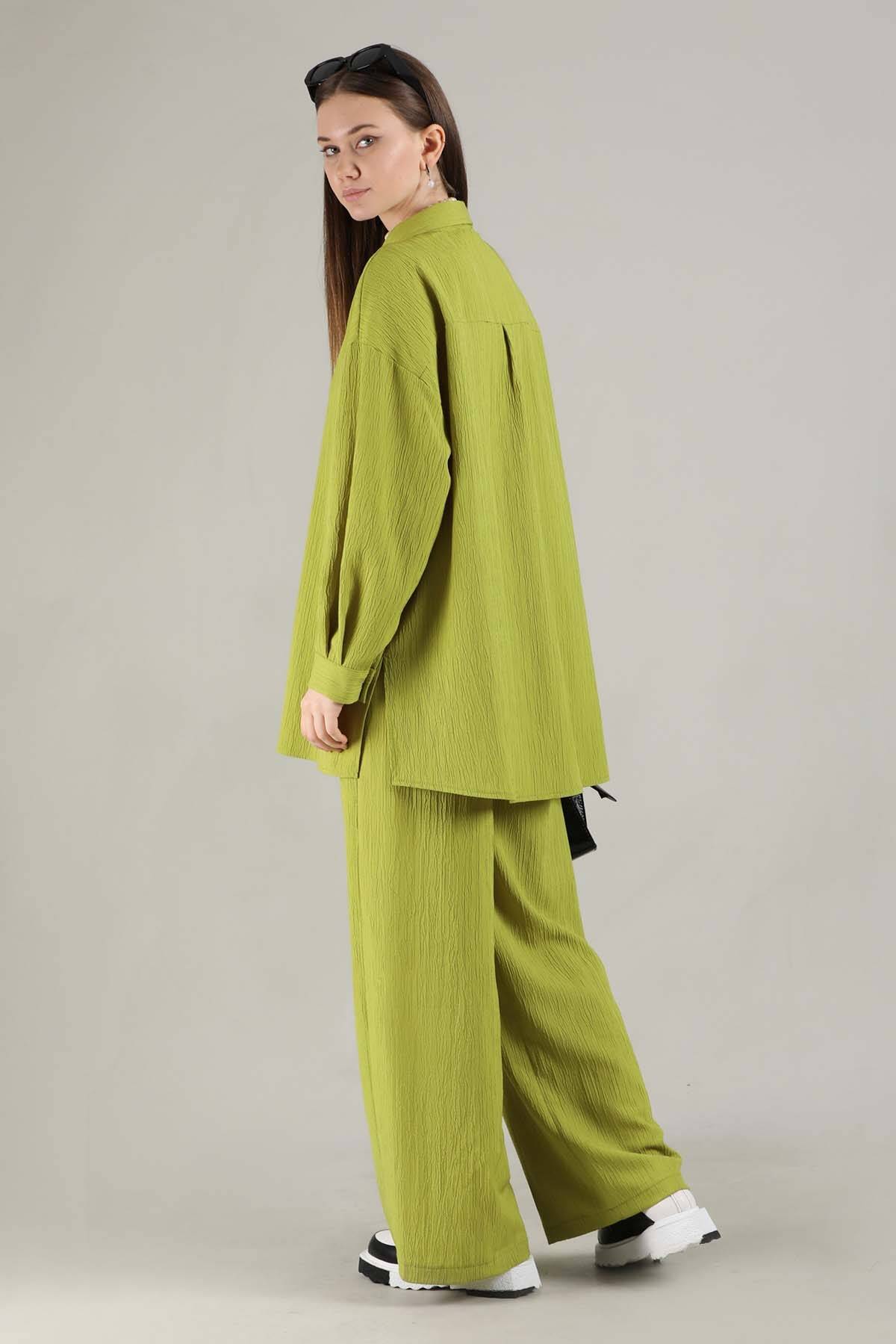 Oversize Shirt Suit Oil Green. Our model, which has pockets and a very stylish and elegant appearance with its crinkle fabric, is sold with trousers.