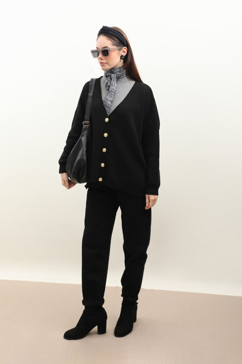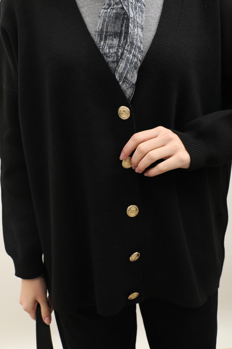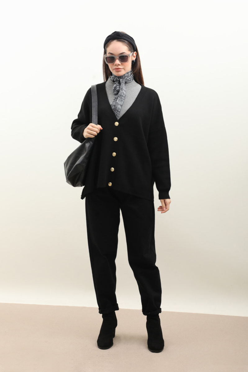Oversize Triko Hırka Siyah. V kesimdir, düşük omuzlu, manşeti ribanalıdır, önden gold düğmelidir. Etek, elbise ve pantolon üzerine tercih edilebilir. Kış aylarında tercih edebilirsiniz.