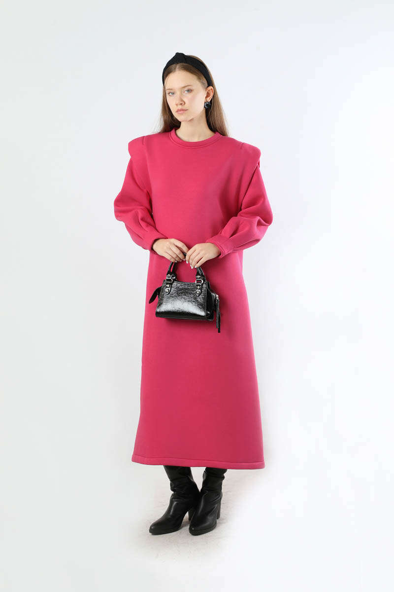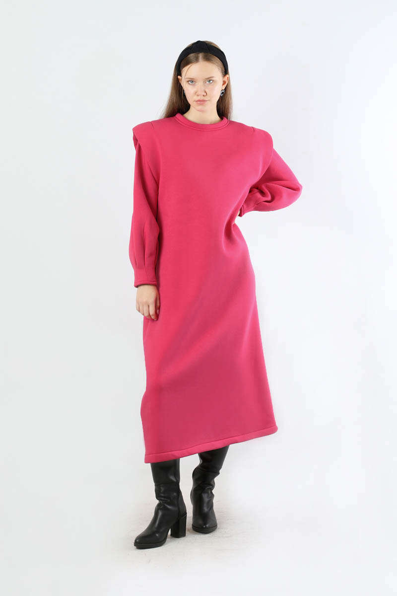 Oversize Üç İplik Elbise Pembe.Bisiklet yaka olup manşeteri dikiş detaylıdır. Kuşaksız ve cepsizdir. Görselde ürününün yakasındaki gömlek detayı aksesuar olarak kullanılmıştır elbiseye dahil değildir.