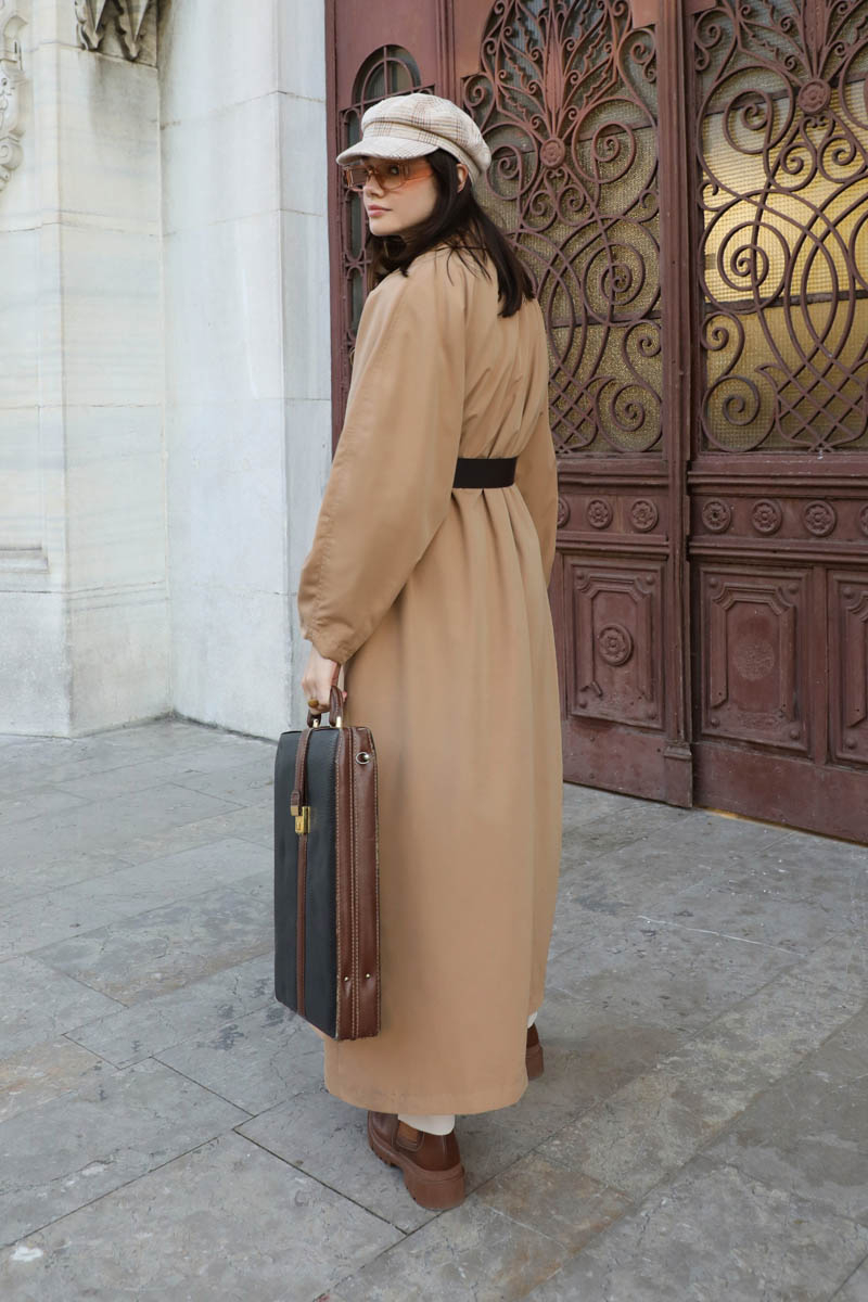 Oversize Vintage Trençkot Camel. Kruvaze geniş yakalıdır, Kolları pens detaylıdır, iki tokalı tasarım kemer detaylıdır, bol kalıptır, yandan ceplidir, astralıdır. Günlük kullanım ve özel günlerinizde tercih edebilirsiniz.
