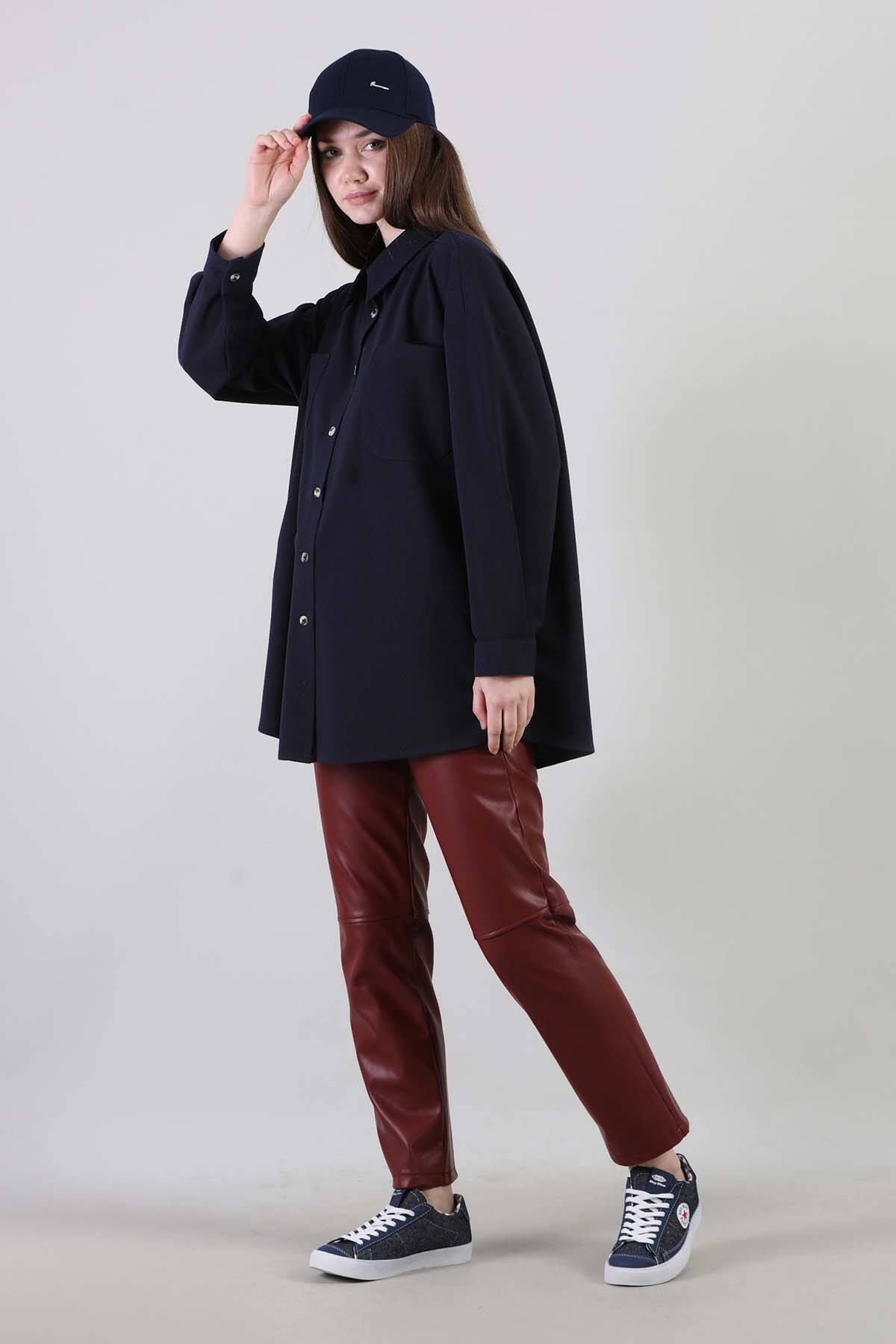 Oversize Gömlek Lacivert. Gömlek yaka, Oversize , düğmeli, Lacivert Renk , Düşük omuzludur. Önden iki cep, yandan iki cep mevcuttur. Yeni Sezon ürünüdür.