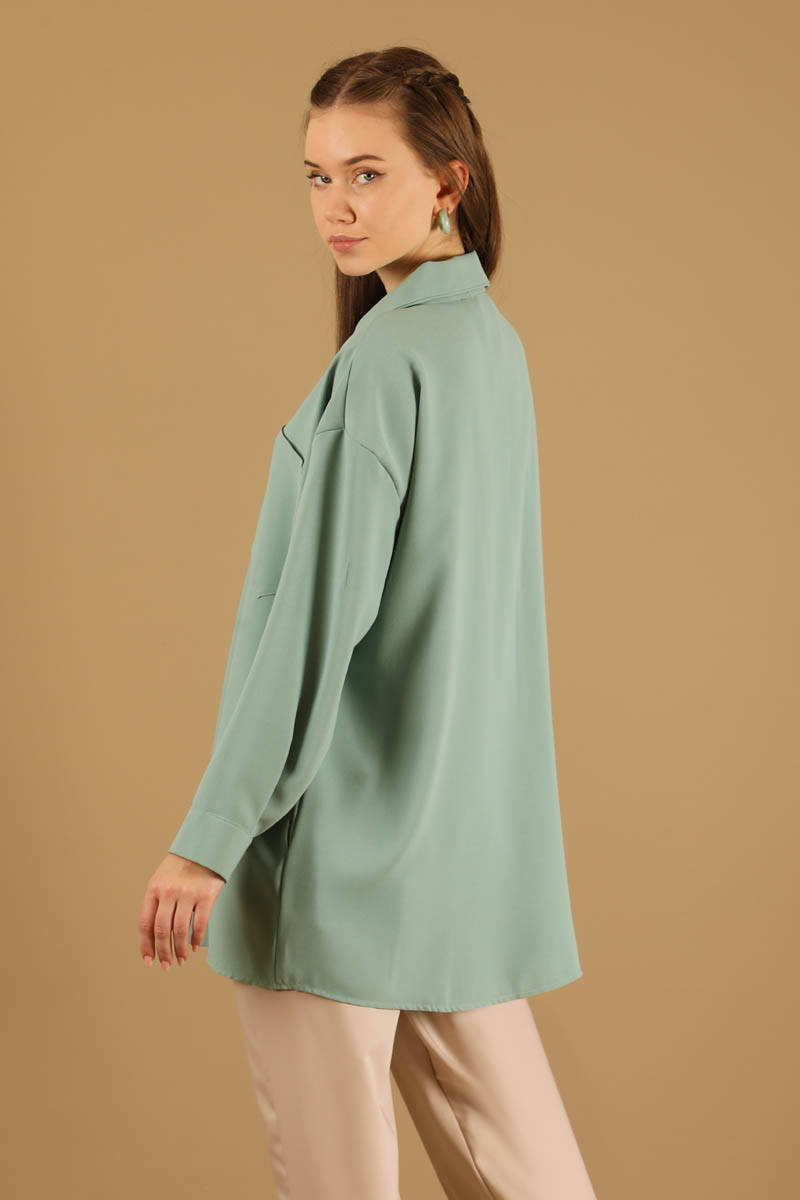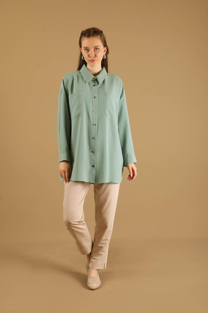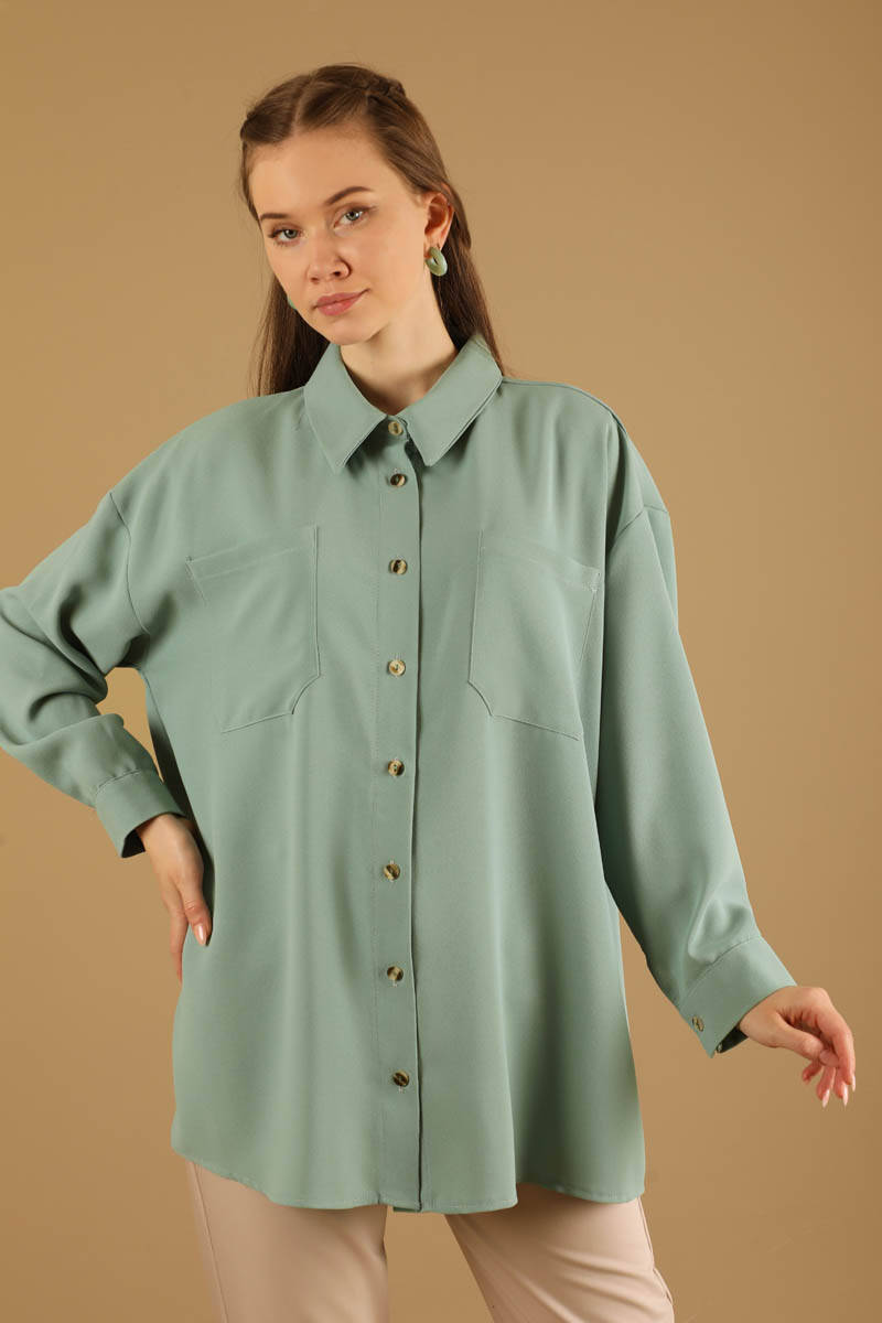 Oversize Gömlek Mint. Gömlek yaka, Oversize , düğmeli, Mint Renk , Düşük omuzludur. Önden iki cep, yandan iki cep mevcuttur. Yeni Sezon ürünüdür.