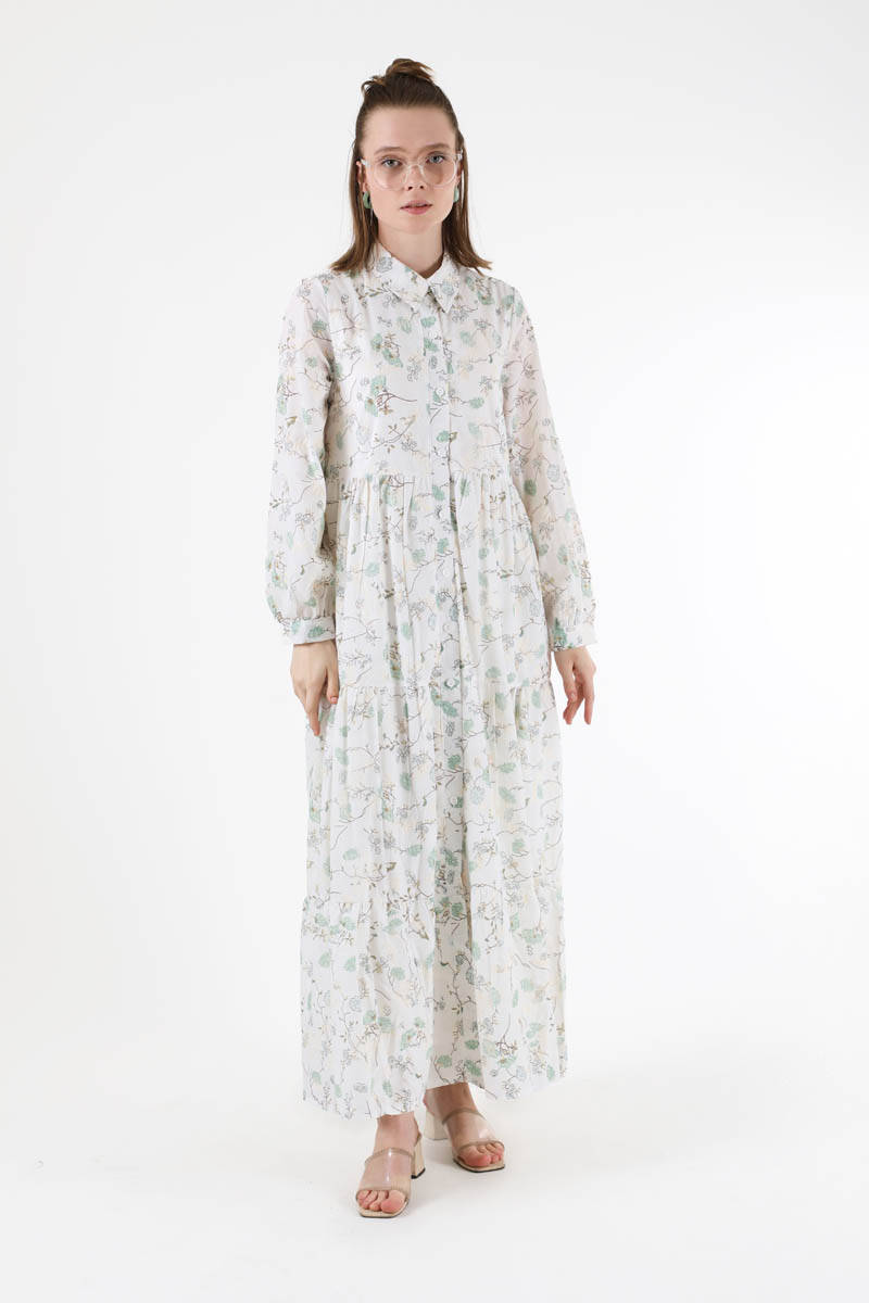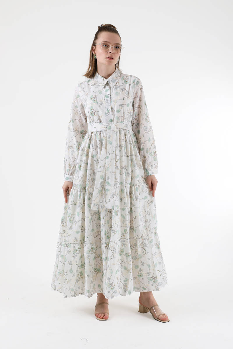 Pamuk Flower Elbisenin kat kat detayları bulunup, önden düğmelidir. Elbisenin astarı bulunmakadır, iç göstermez ve tesettür giyime oldukça uygundur. Elbisede kuşak detayı bulunmaktadır. Elbise dört mevsime uygundur.