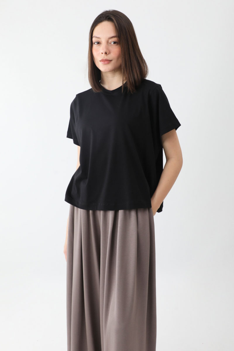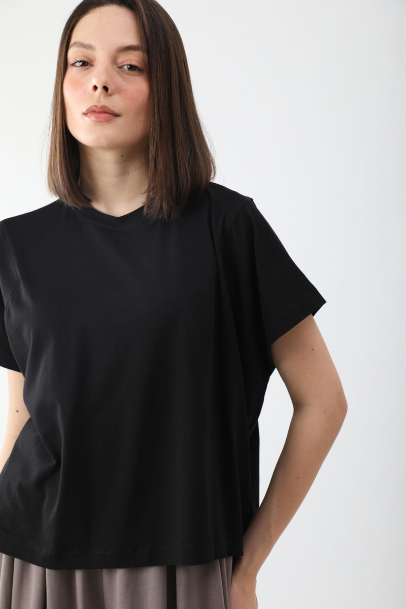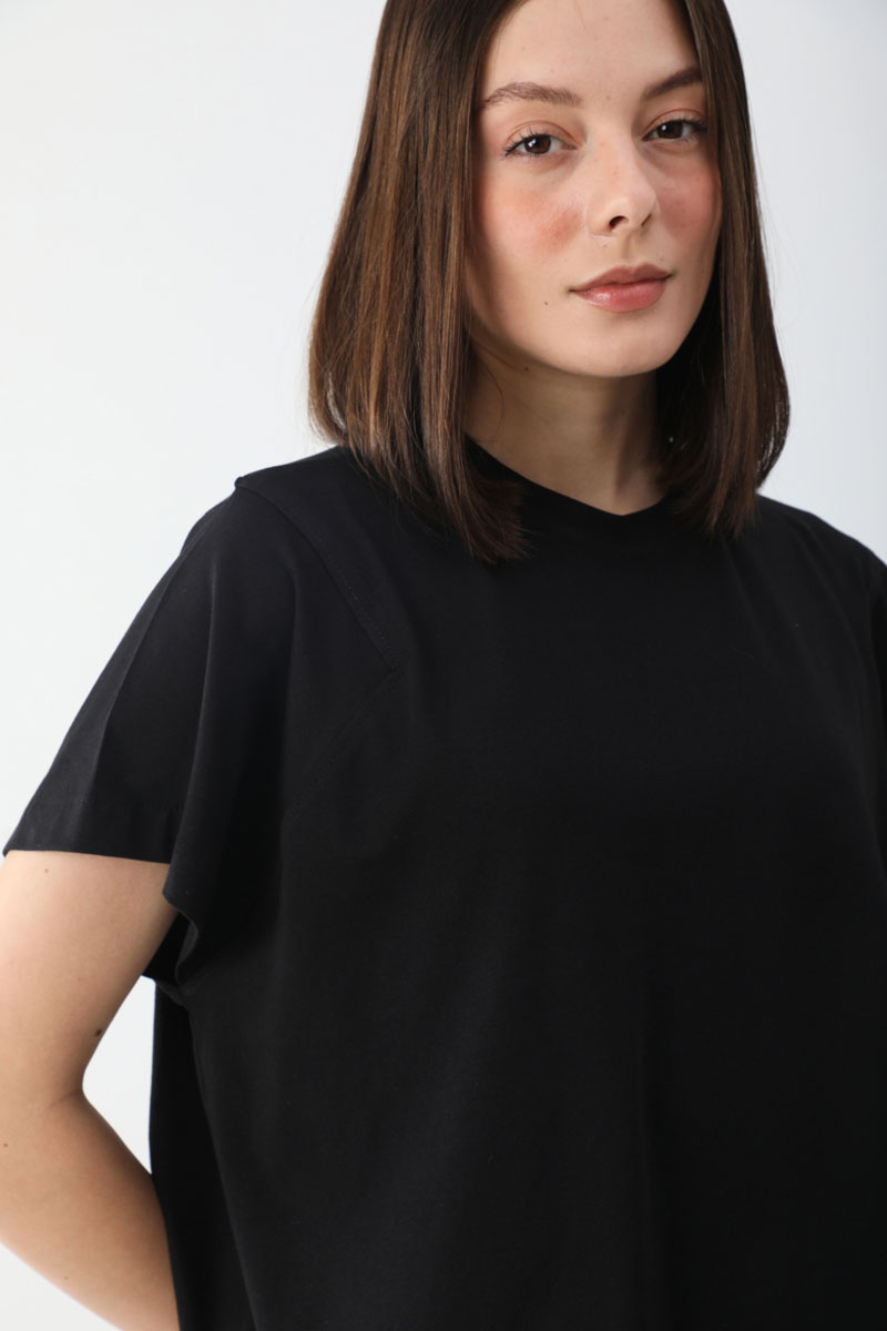 Pamuklu Kısa Kollu Tişört Siyah. Bisiklet yakadır, omuzdan üçgen dikiş detaylıdır, kısa kolludur, geniş kalıptır, bGünlük kullanımda tercih edebilirsiniz.