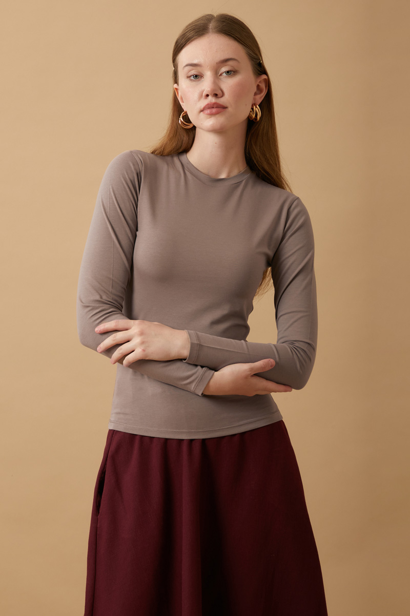 Pamuklu Uzun Kollu Body Toprak, Yumuşak ve esnek kumaşı ile vücudu saran bu uzun kollu basic t-shirt, hem tek başına hem katmanlı kombinlerde rahatlıkla kullanılabilir. Günlük şıklığı sade bir dokunuşla yakalamak isteyenler için