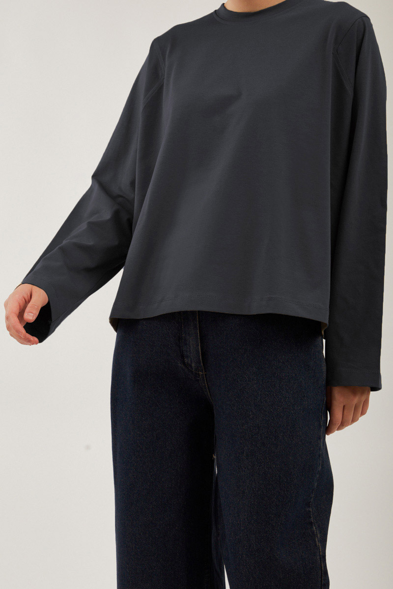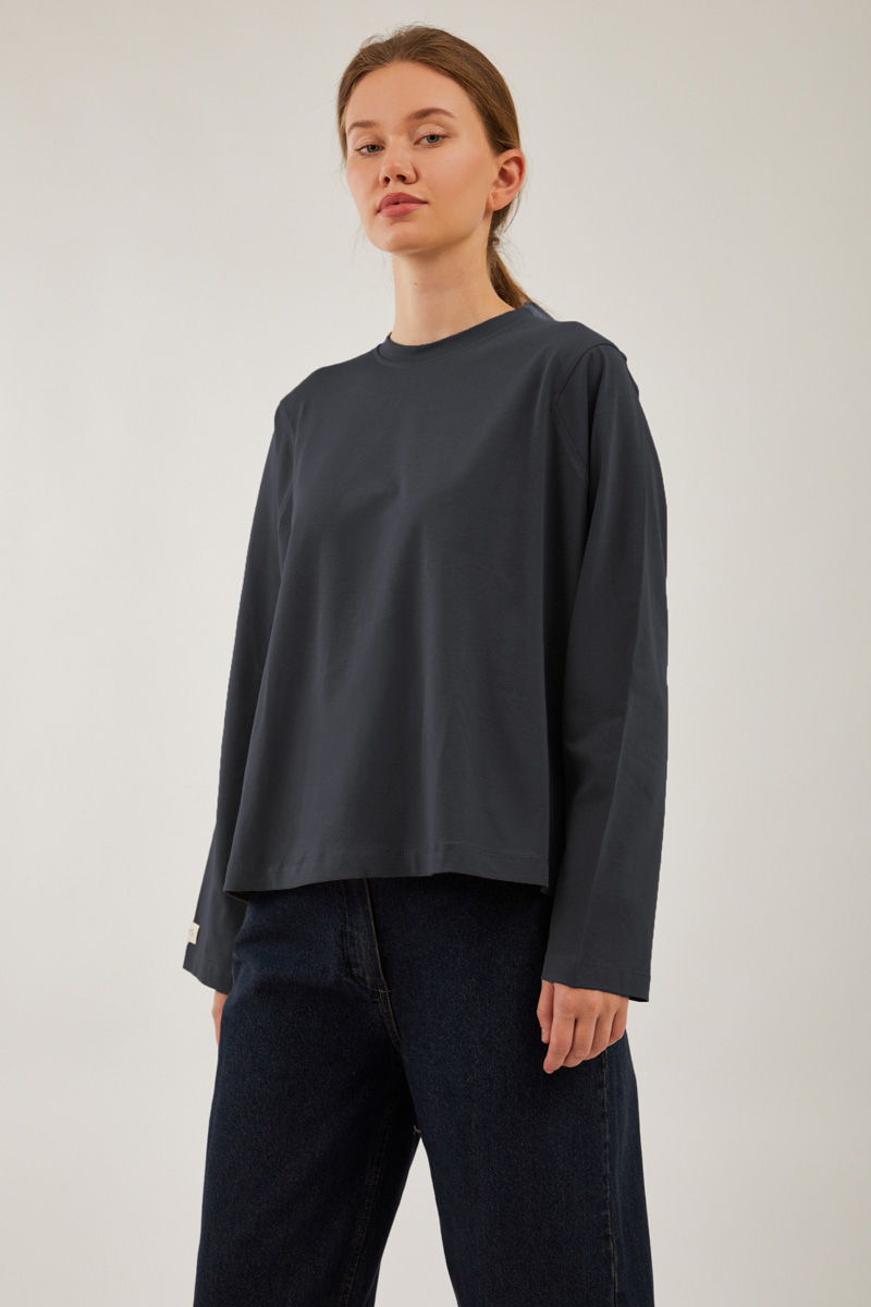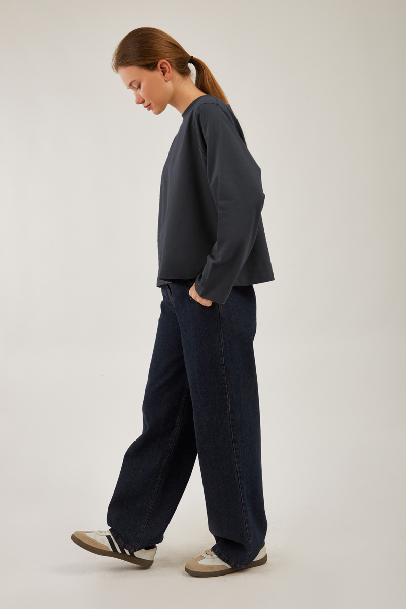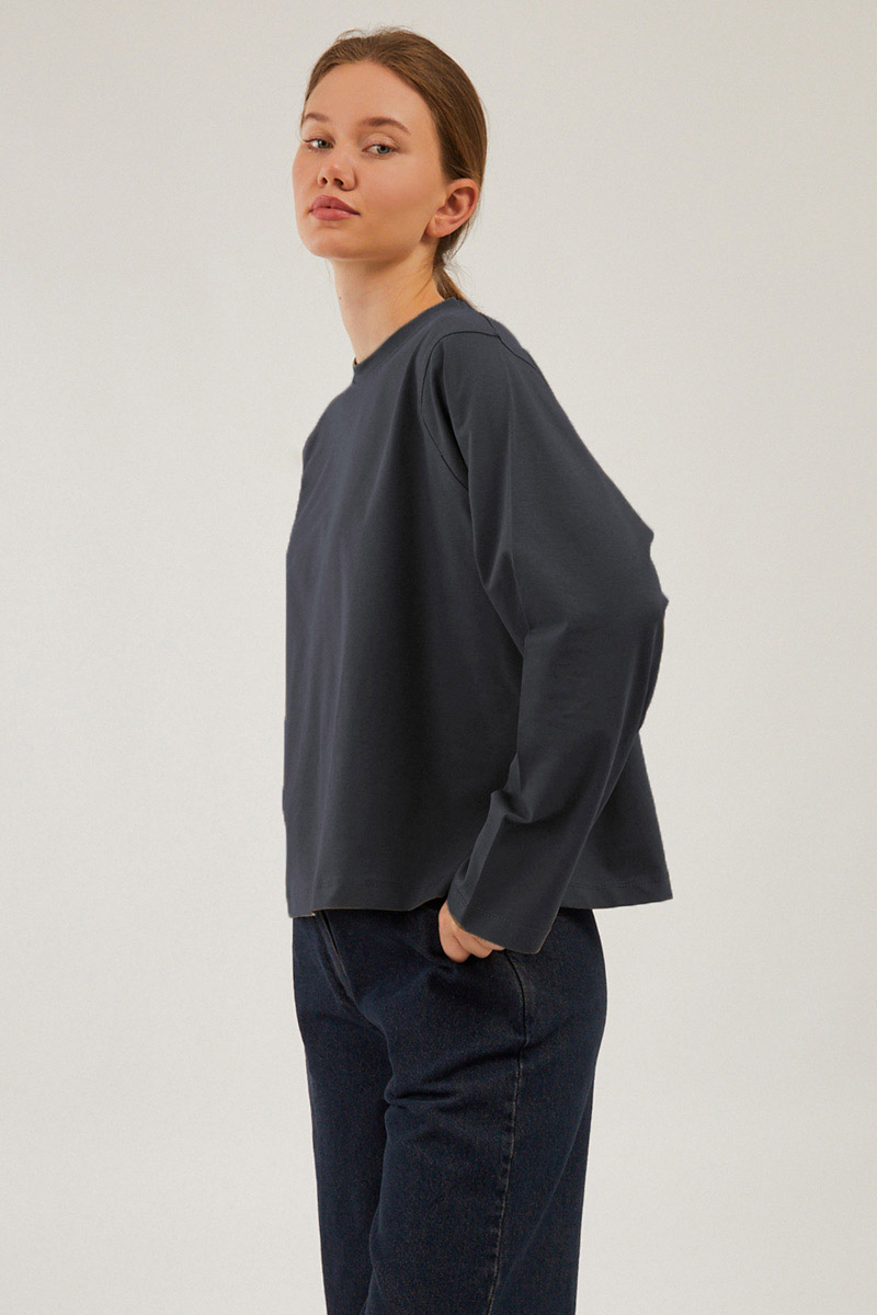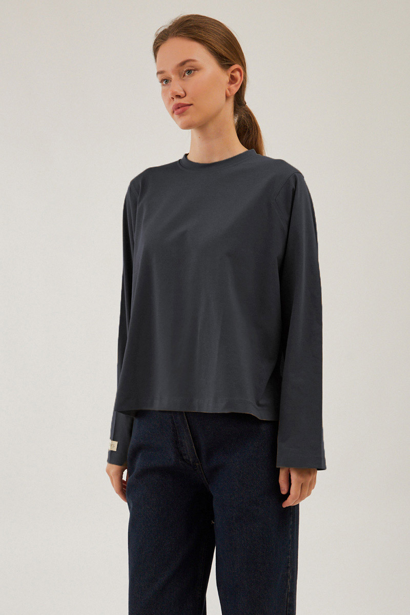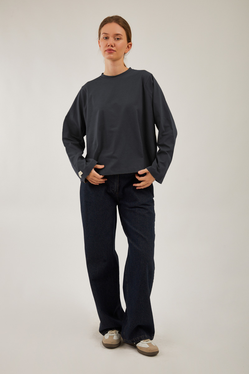 Pamuklu Uzun Kollu Tişört Füme, Bisiklet yakadır, omuzdan üçgen dikiş detaylıdır, geniş kolludur, geniş kalıptır, bilekten zulays etiketlidir. Günlük kullanımda tercih edebilirsiniz.
