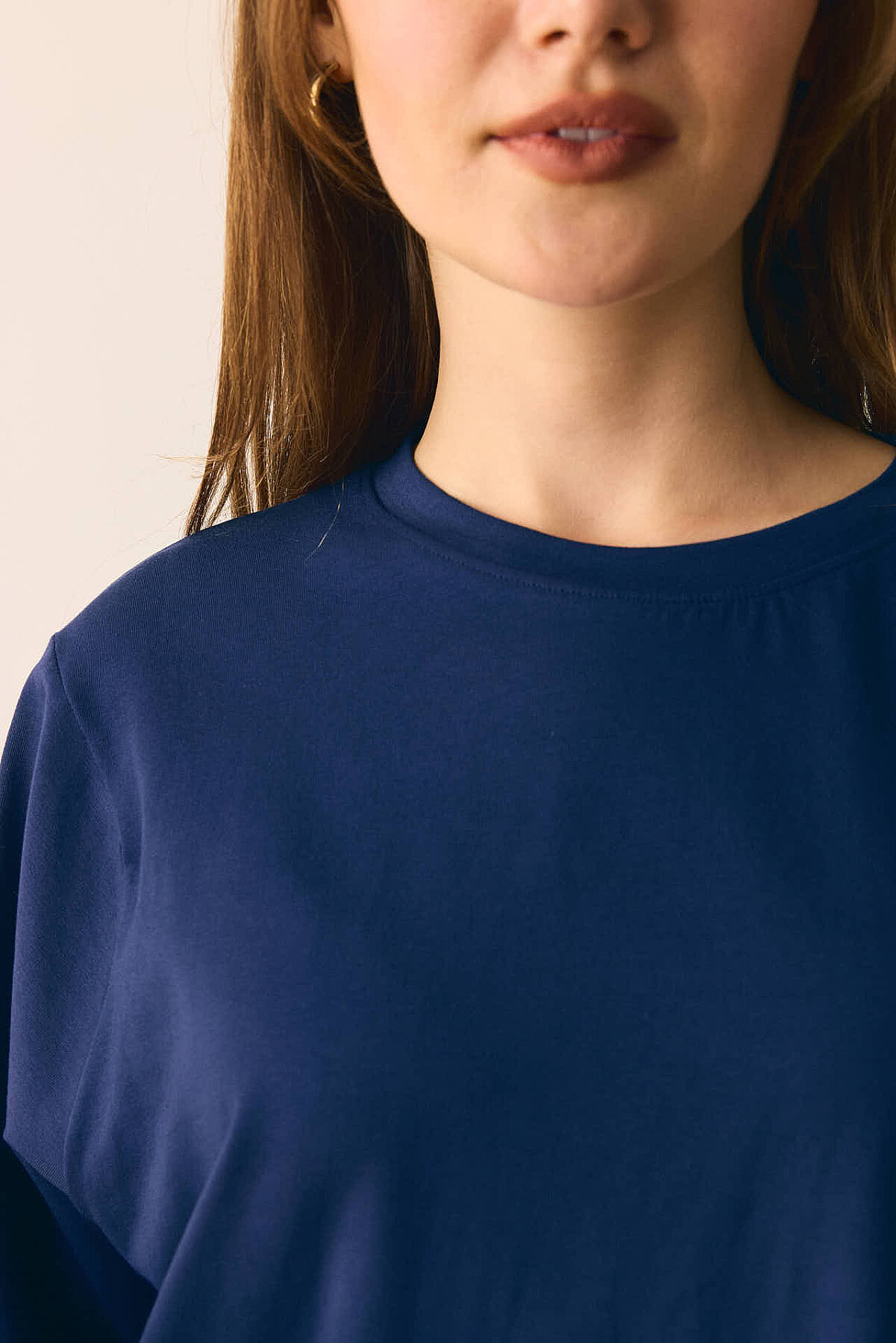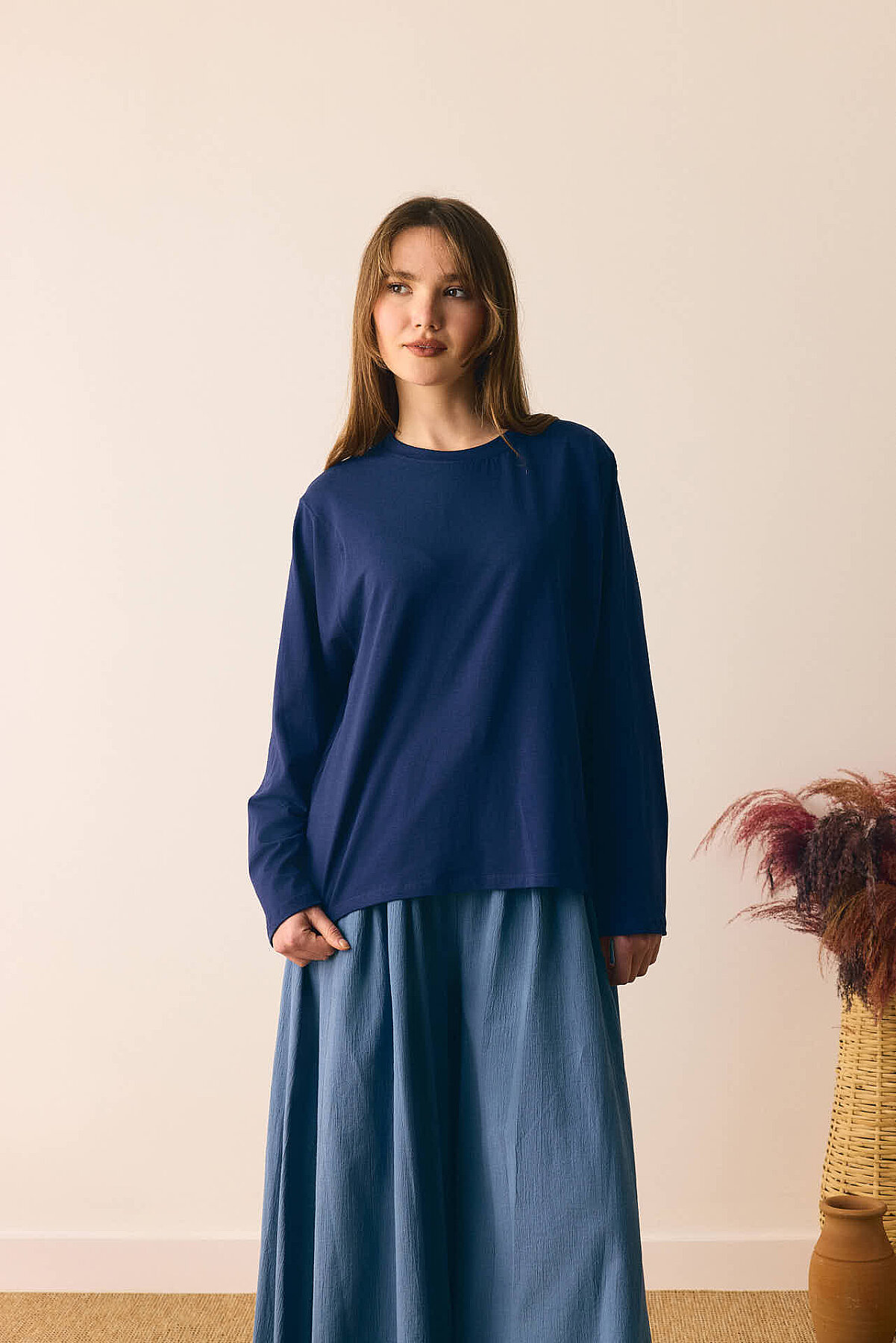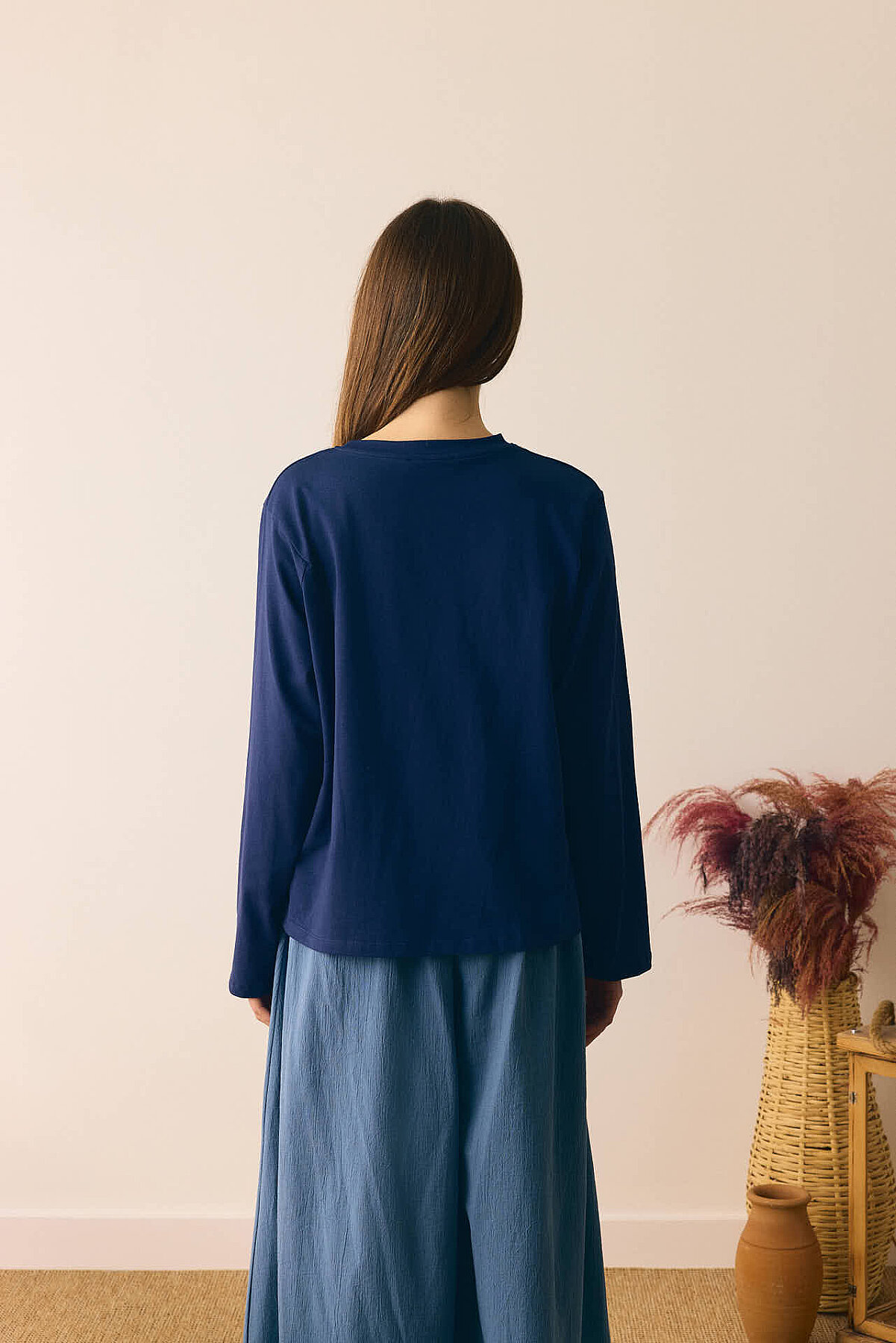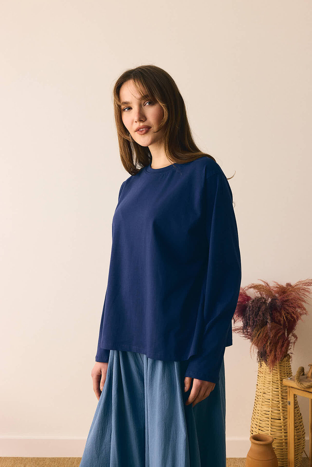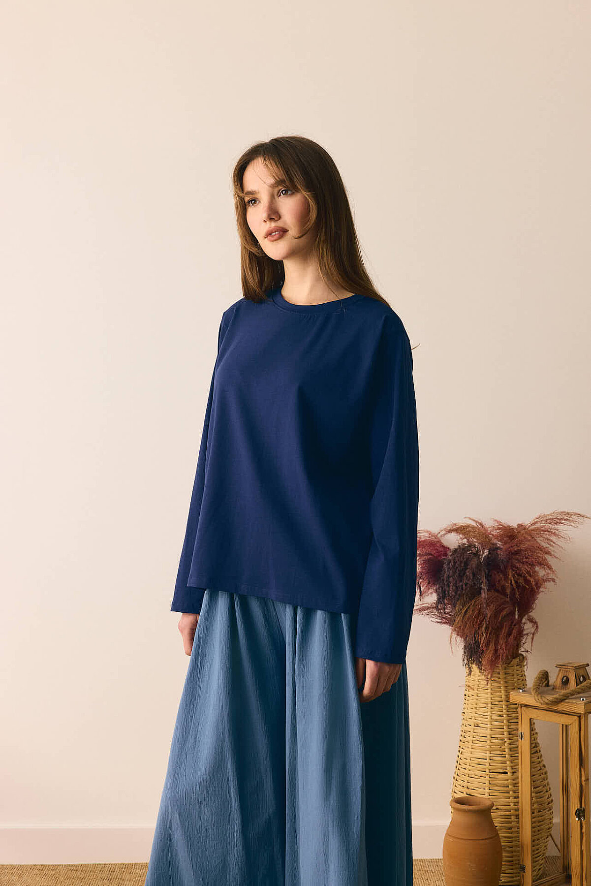 Pamuklu Uzun Kollu Tişört Lacivert Bisiklet yakadır, omuzdan üçgen dikiş detaylıdır, geniş kolludur, geniş kalıptır, bilekten zulays etiketlidir. Günlük kullanımda tercih edebilirsiniz.