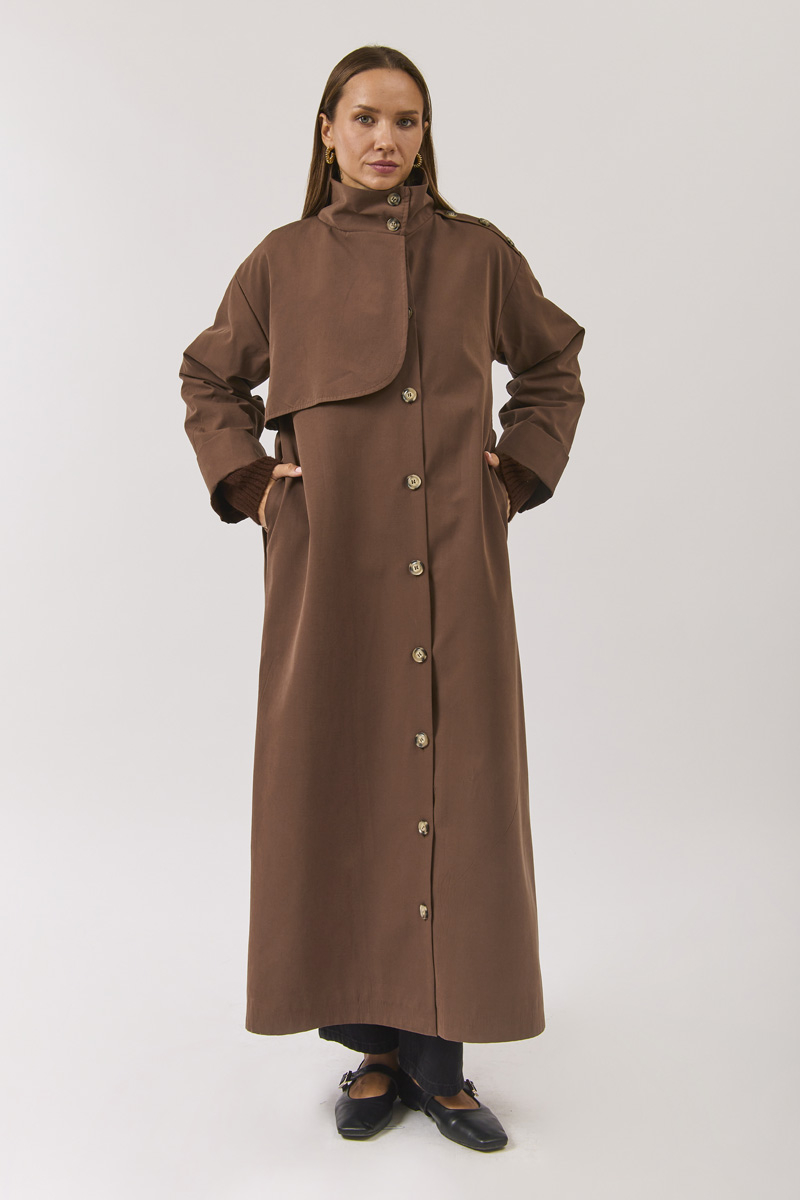 Pamuklu Yüksek Yaka Düğmeli Trençkot Kahverengi