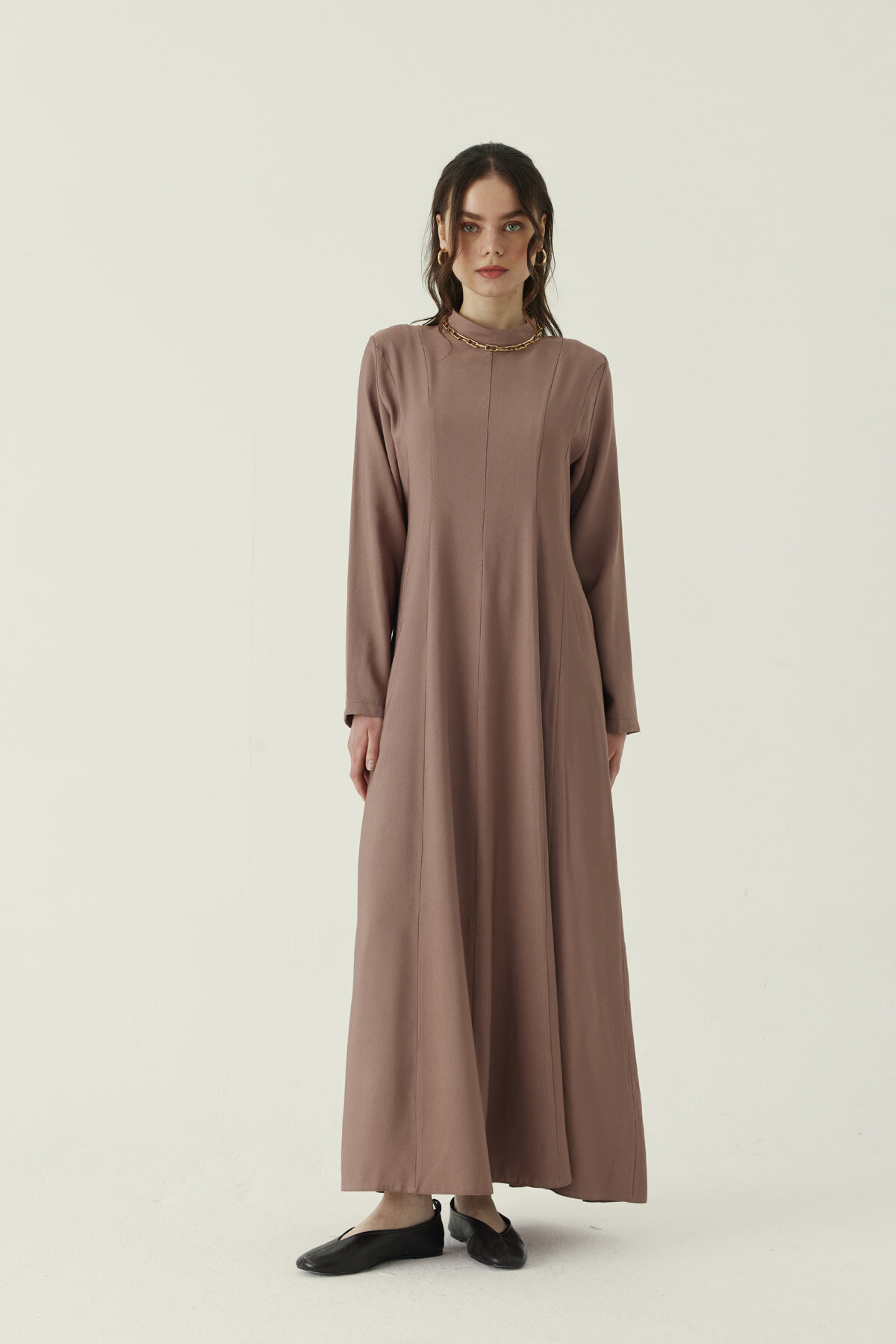 Panel Seam Tencel Dress – Mink presents a balanced and modern look, enhanced by panel seam details that strengthen its clean silhouette. The seams running along the front add structure to the dress, while the firm yet soft surface of the tencel fabric ensures all-day comfort. The high-neck design gives the piece a sharp, polished appearance. With its long length and timeless lines, it offers versatile wear from everyday city style to more refined outfits.