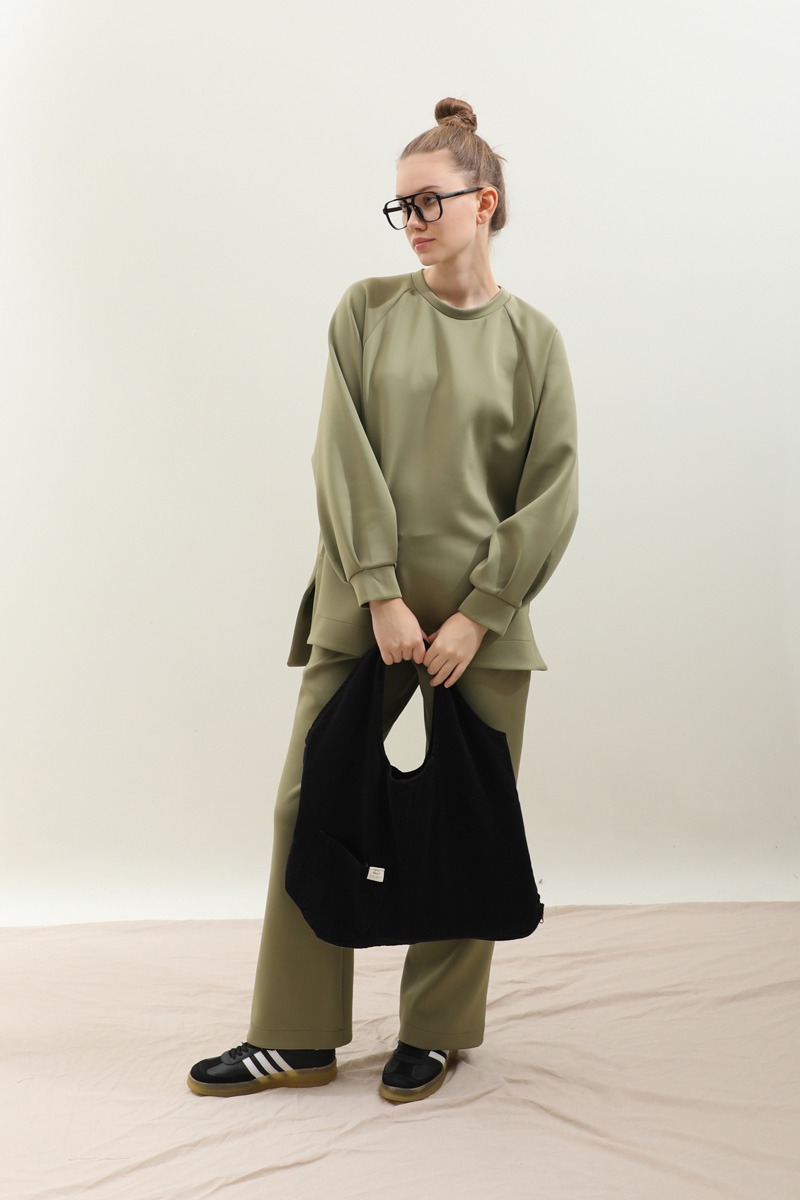 Pantolonlu Sweat Takım Haki. Sweat bisiklet yakadır, reglan ve hafif yarasa kolludur. bilekten pileli ve manşetlidir. yandan yırtmaç detaylıdır. Ön kısa arkası uzundur. Pantolon önden fermuarlı ve düğmelidir, cepsizdir, pilelidir, düz paçadır. Günlük kullanım ve özel günlerinizde tercih edebilirsiniz.