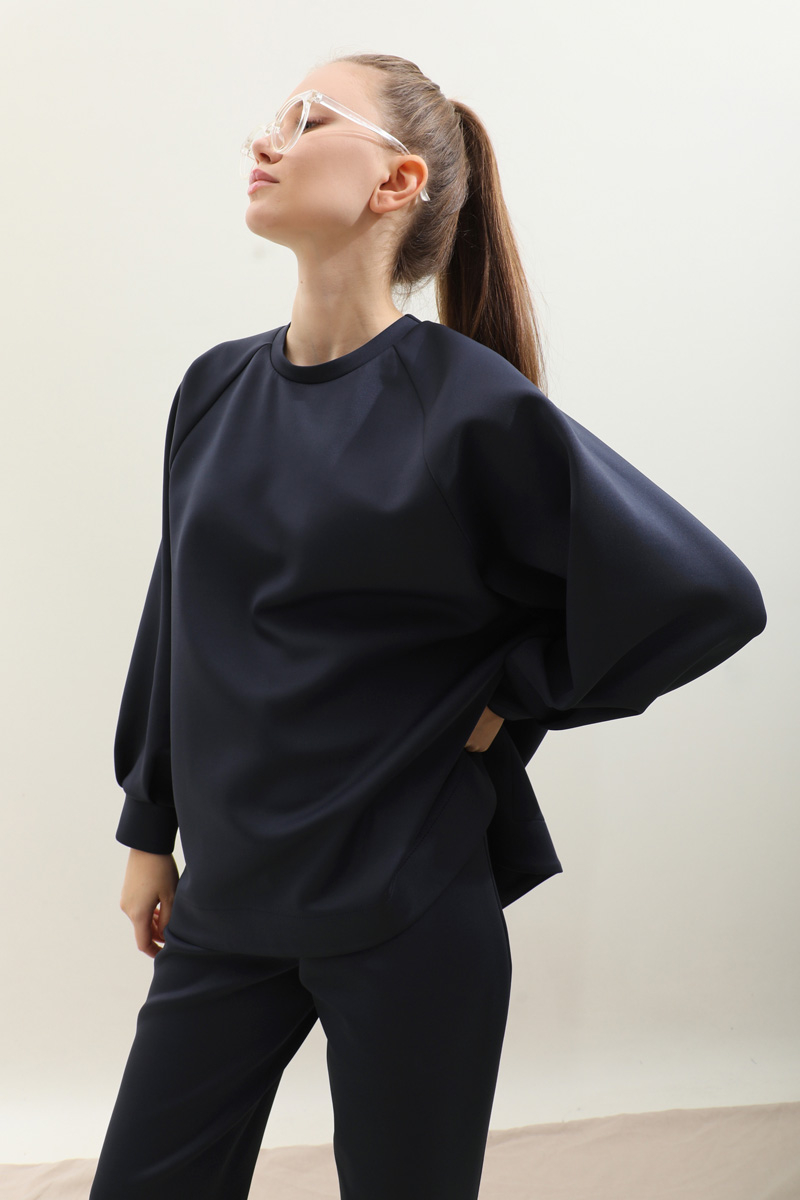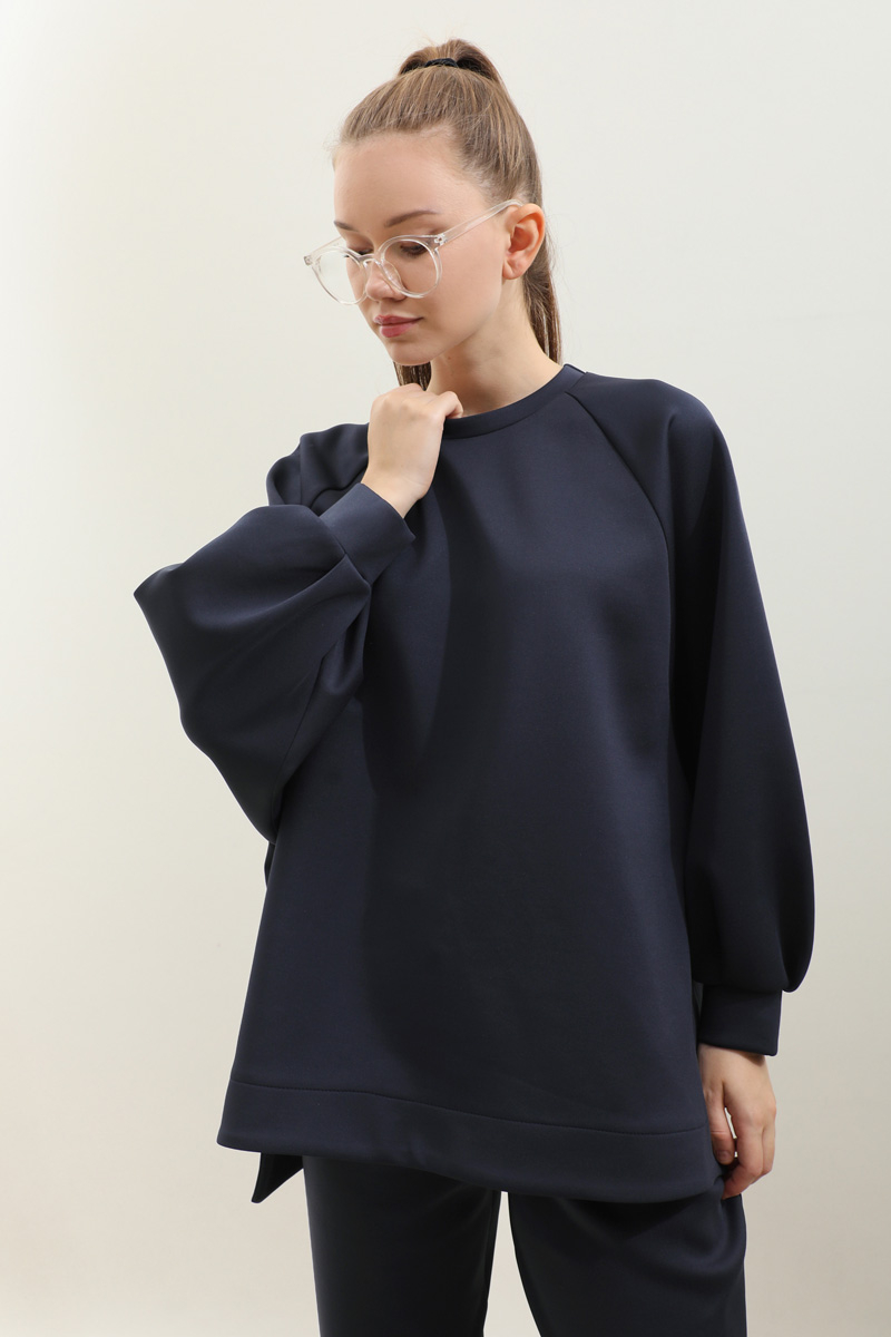 Pantolonlu Sweat Takım Lacivert. Sweat bisiklet yakadır, reglan ve hafif yarasa kolludur. bilekten pileli ve manşetlidir. yandan yırtmaç detaylıdır. Ön kısa arkası uzundur. Pantolon önden fermuarlı ve düğmelidir, cepsizdir, pilelidir, düz paçadır. Günlük kullanım ve özel günlerinizde tercih edebilirsiniz.