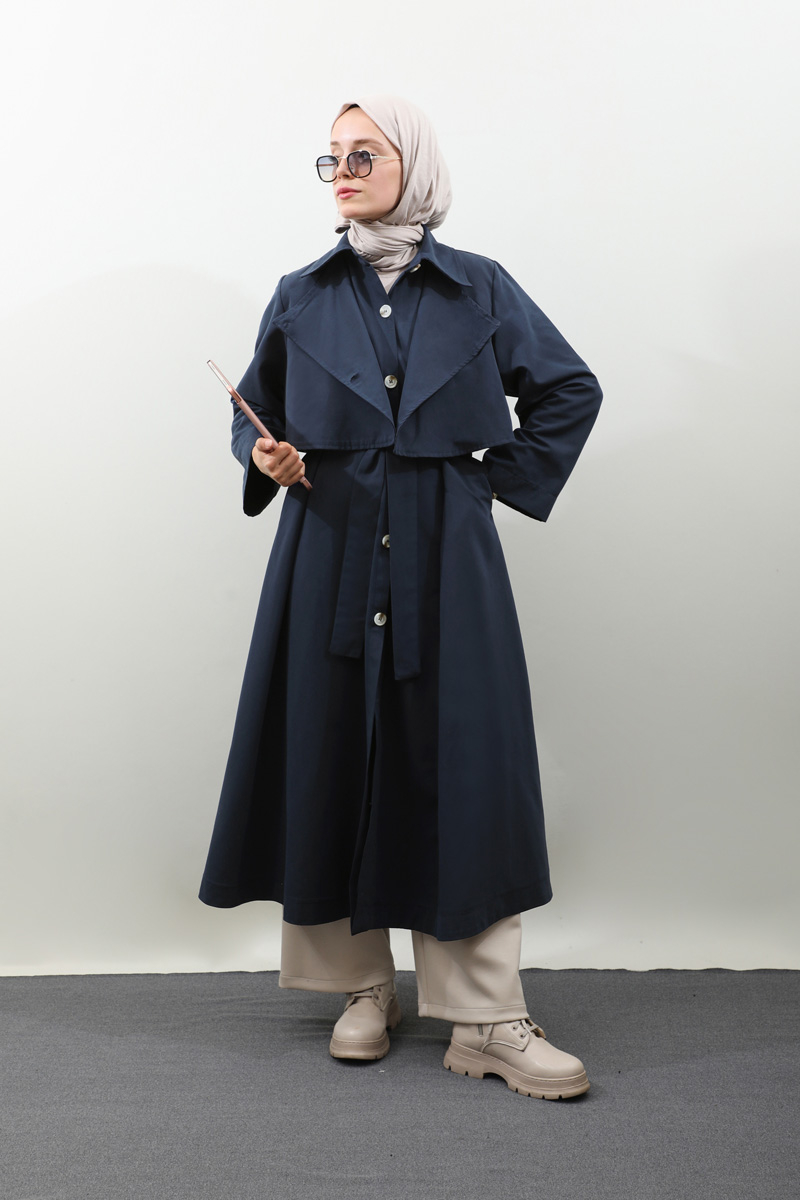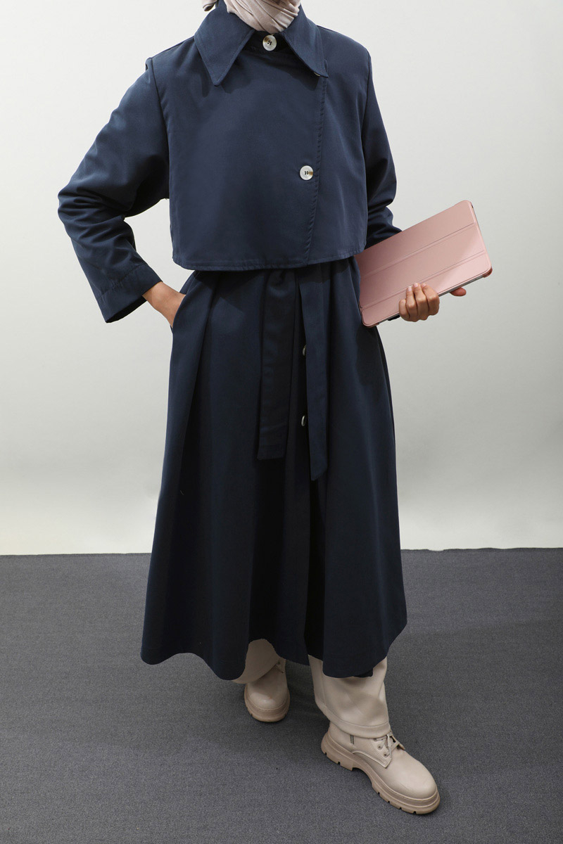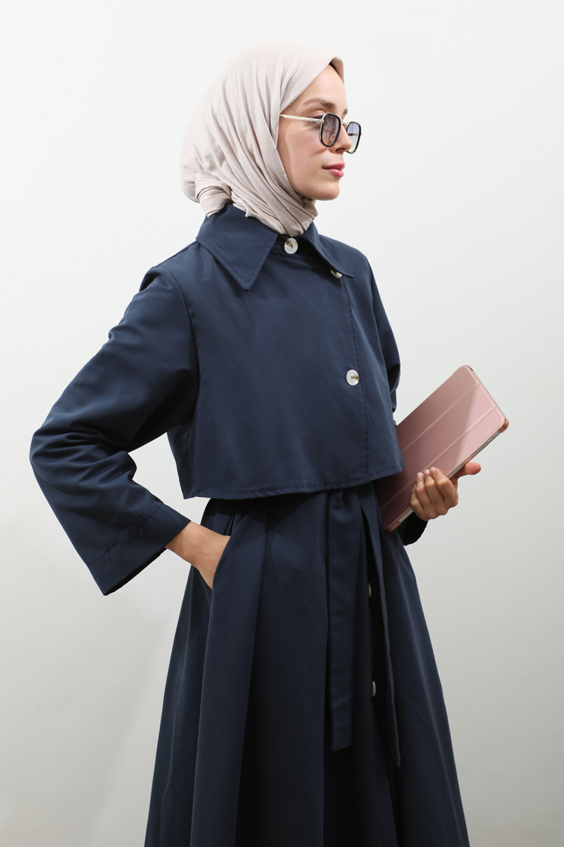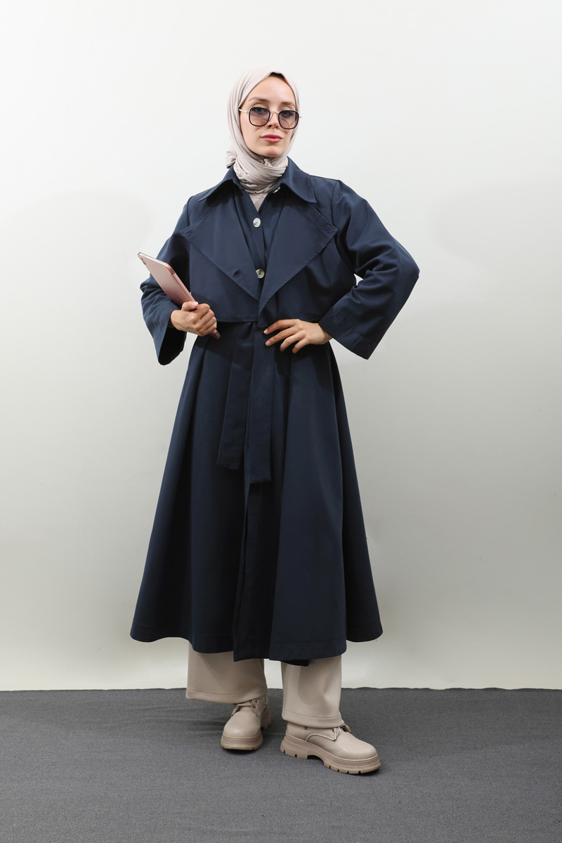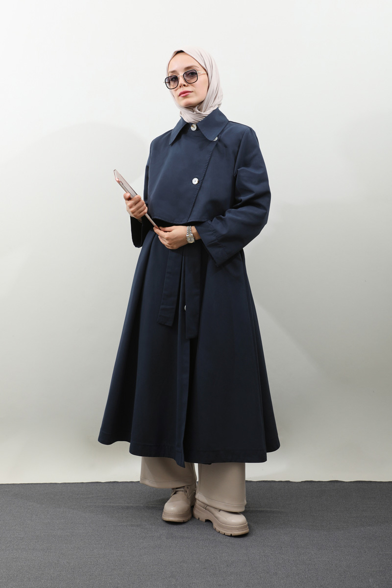 Parçalı Kloş Trençkot Koyu Lacivert. Gömlek yakadır, ceket parça detaylıdır. Üst parçada yaka ve göğüs kısmında düğmelidir. Belden aşağı kloş kalıp olup önden düğmedir. Ceplidir, kuşaklıdır, astarsızdır. Günlük kullanım ve özel günlerinizde tercih edebilirsiniz.