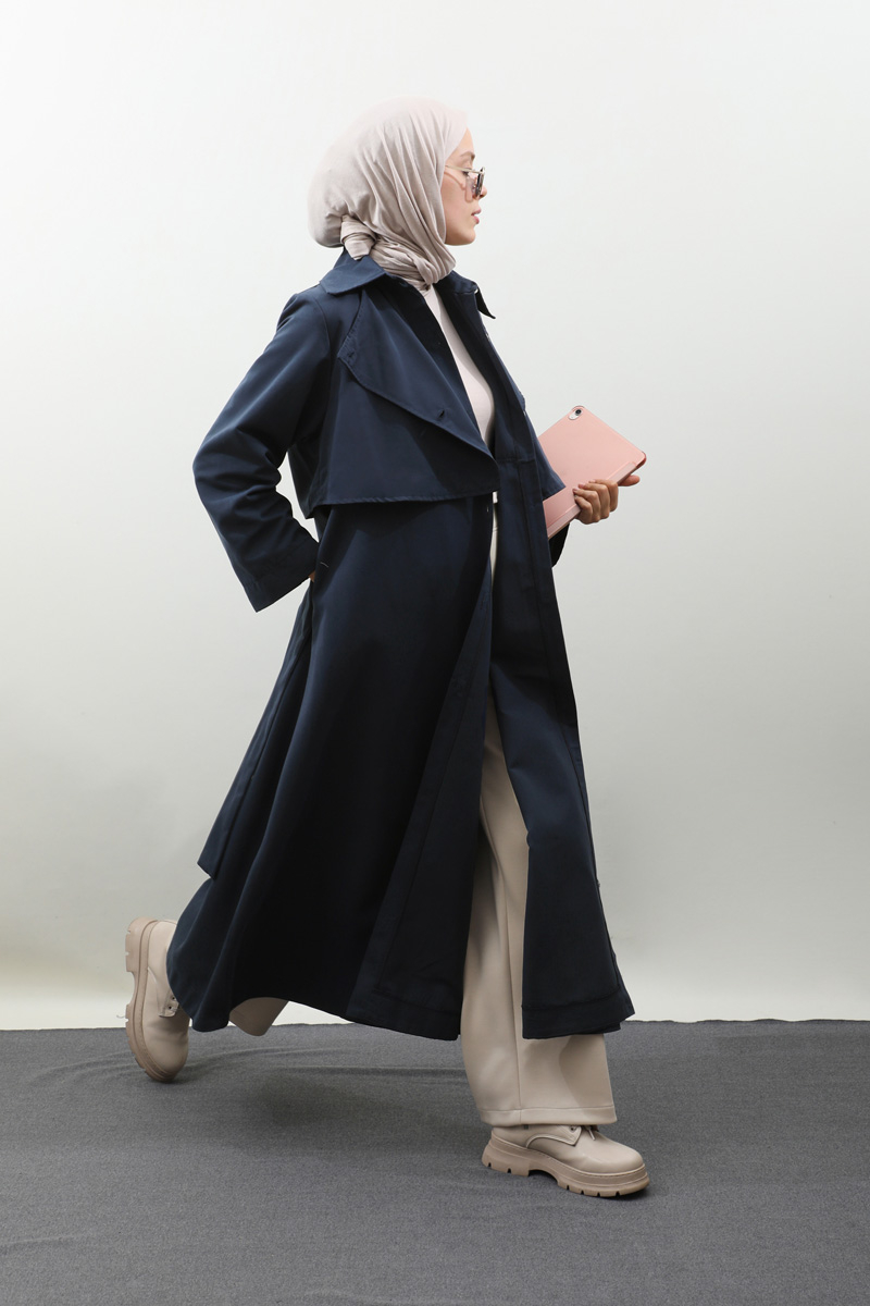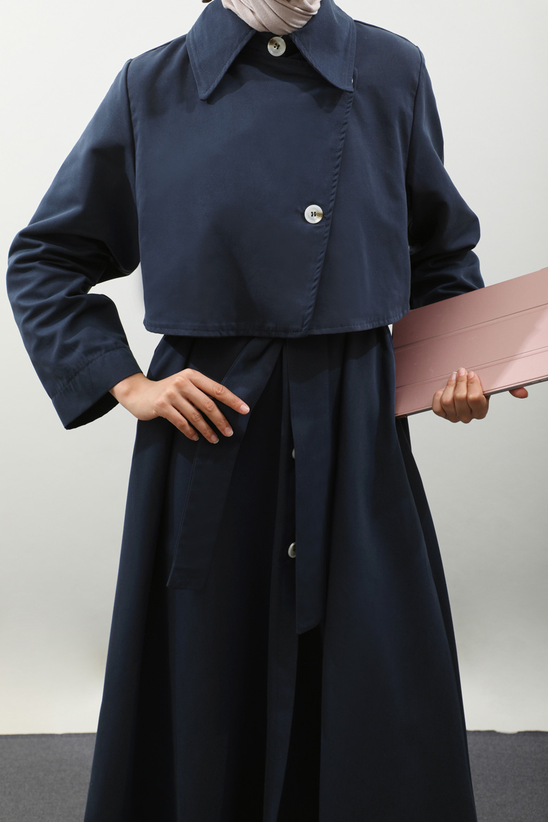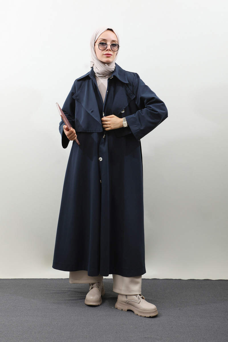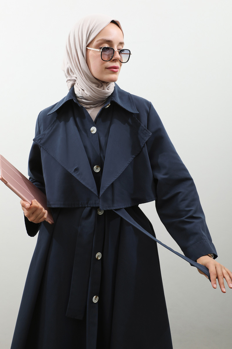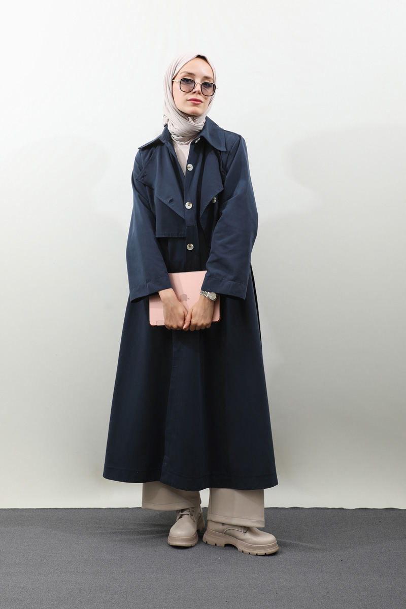 Parçalı Kloş Trençkot Koyu Lacivert. Gömlek yakadır, ceket parça detaylıdır. Üst parçada yaka ve göğüs kısmında düğmelidir. Belden aşağı kloş kalıp olup önden düğmedir. Ceplidir, kuşaklıdır, astarsızdır. Günlük kullanım ve özel günlerinizde tercih edebilirsiniz.